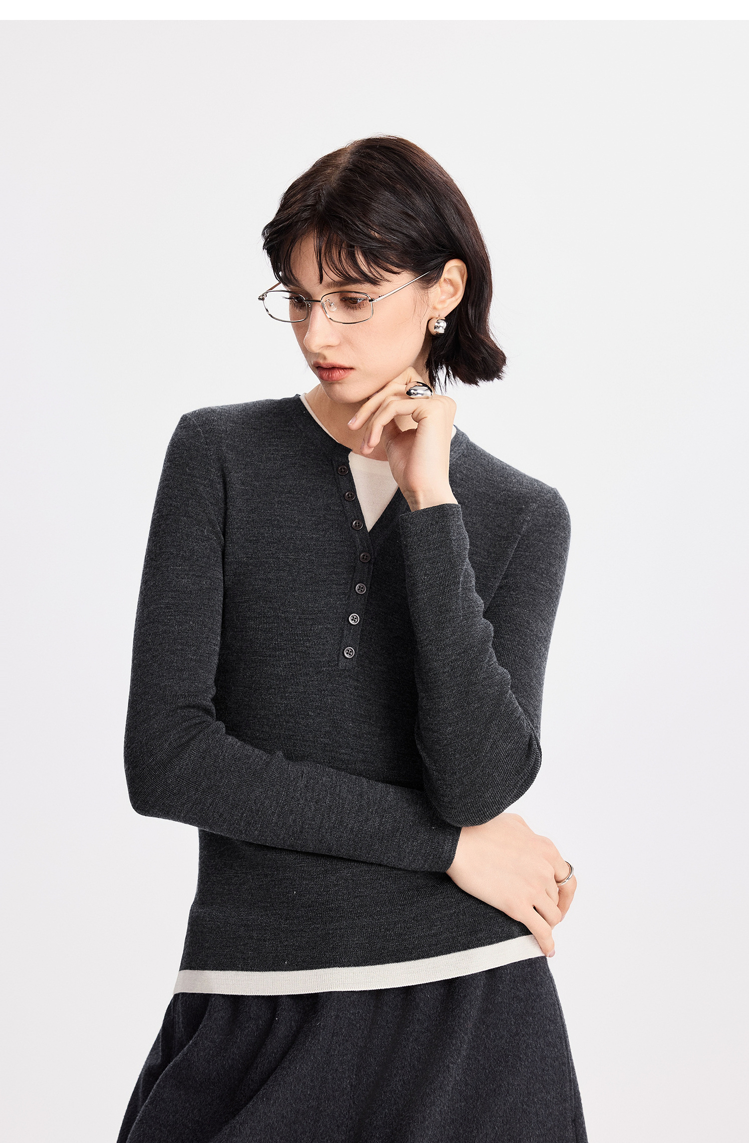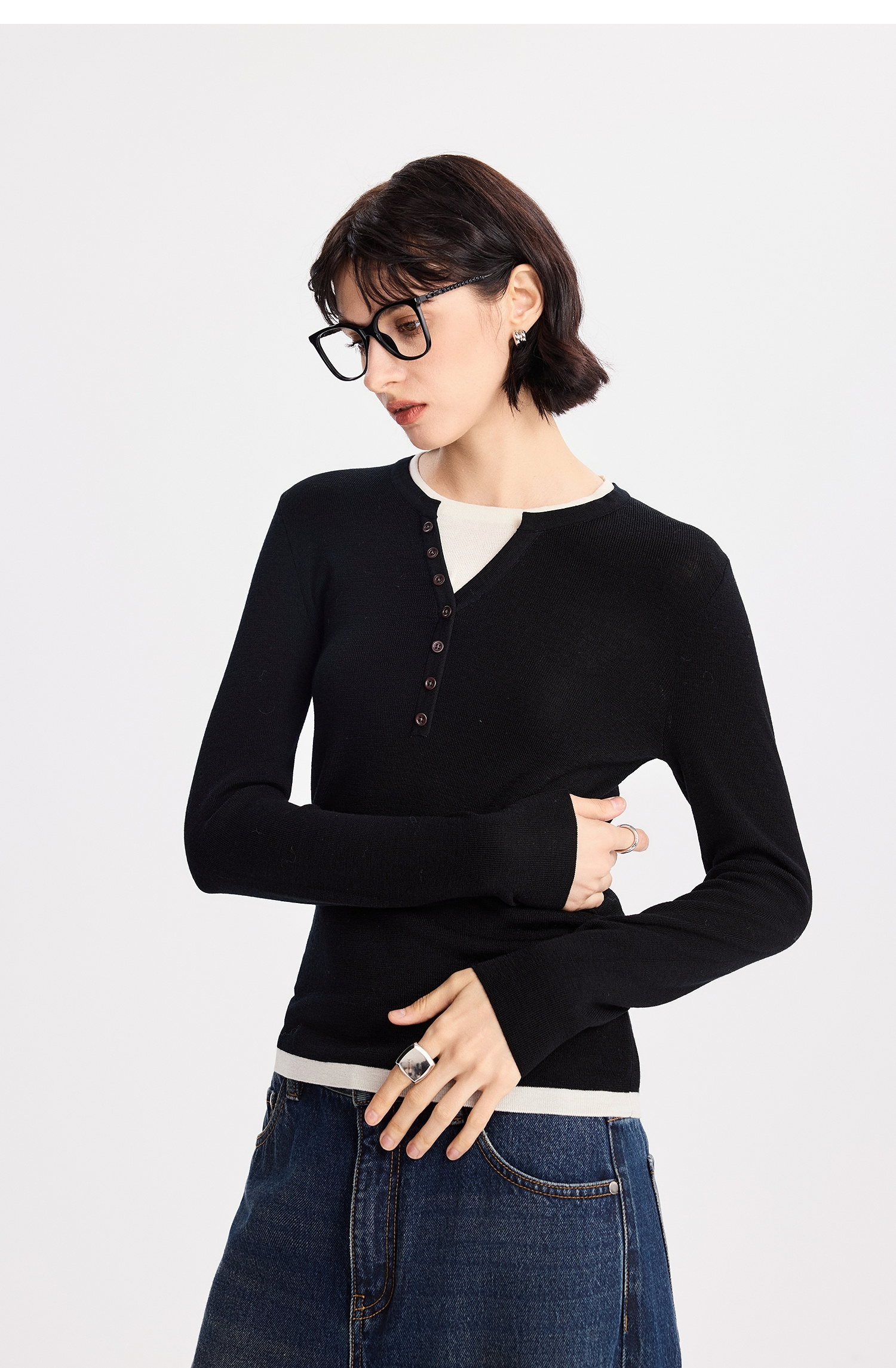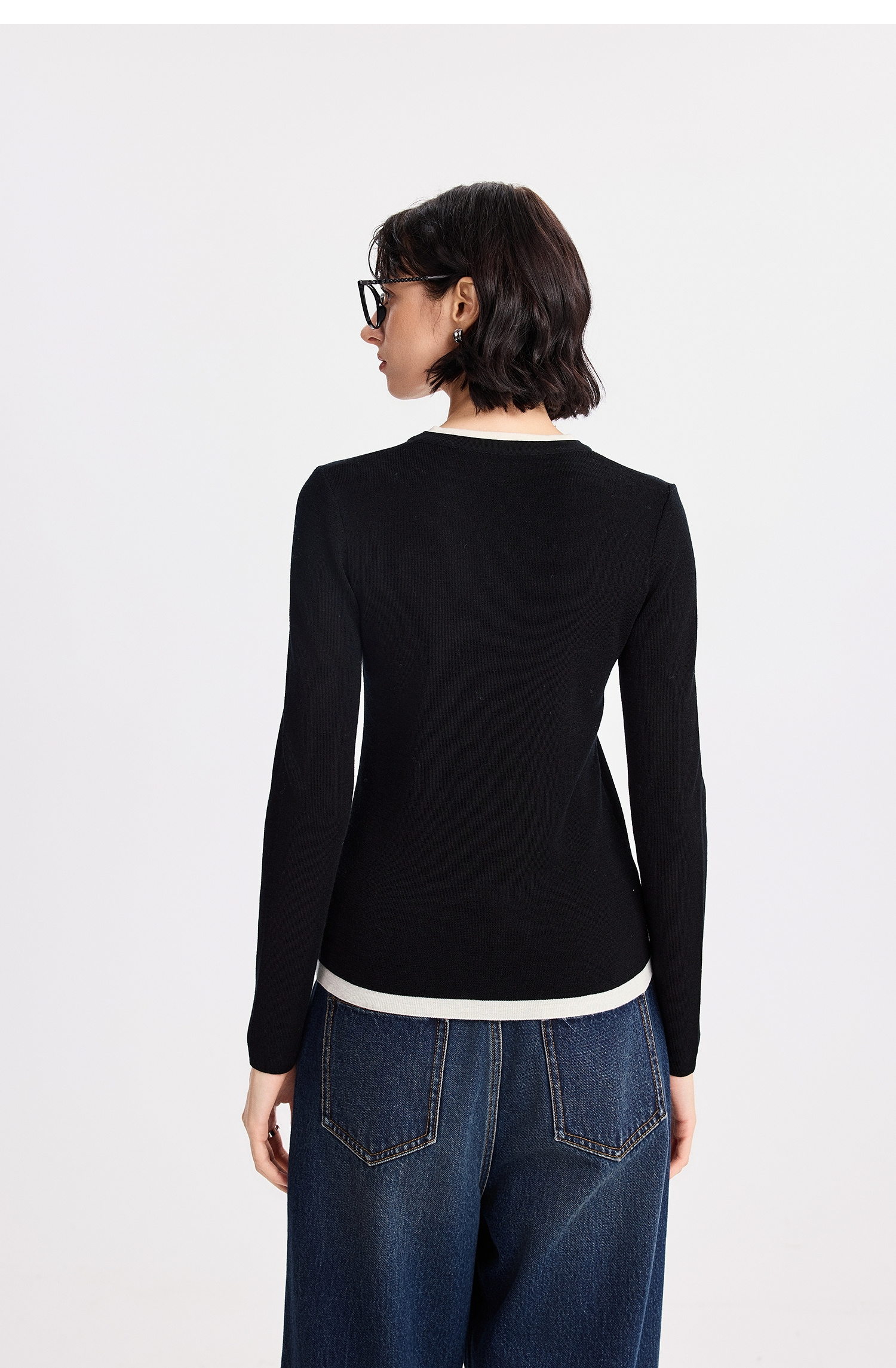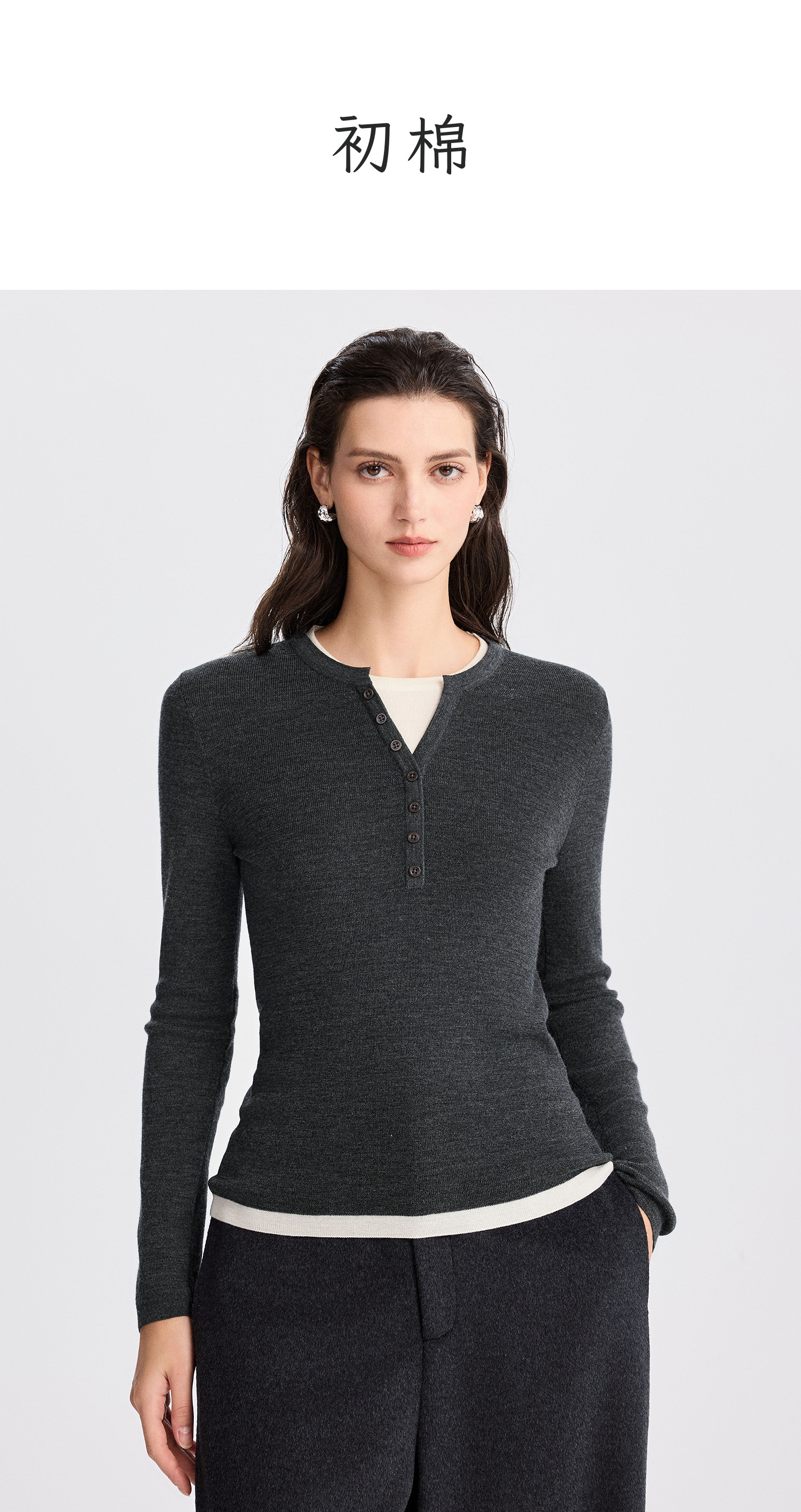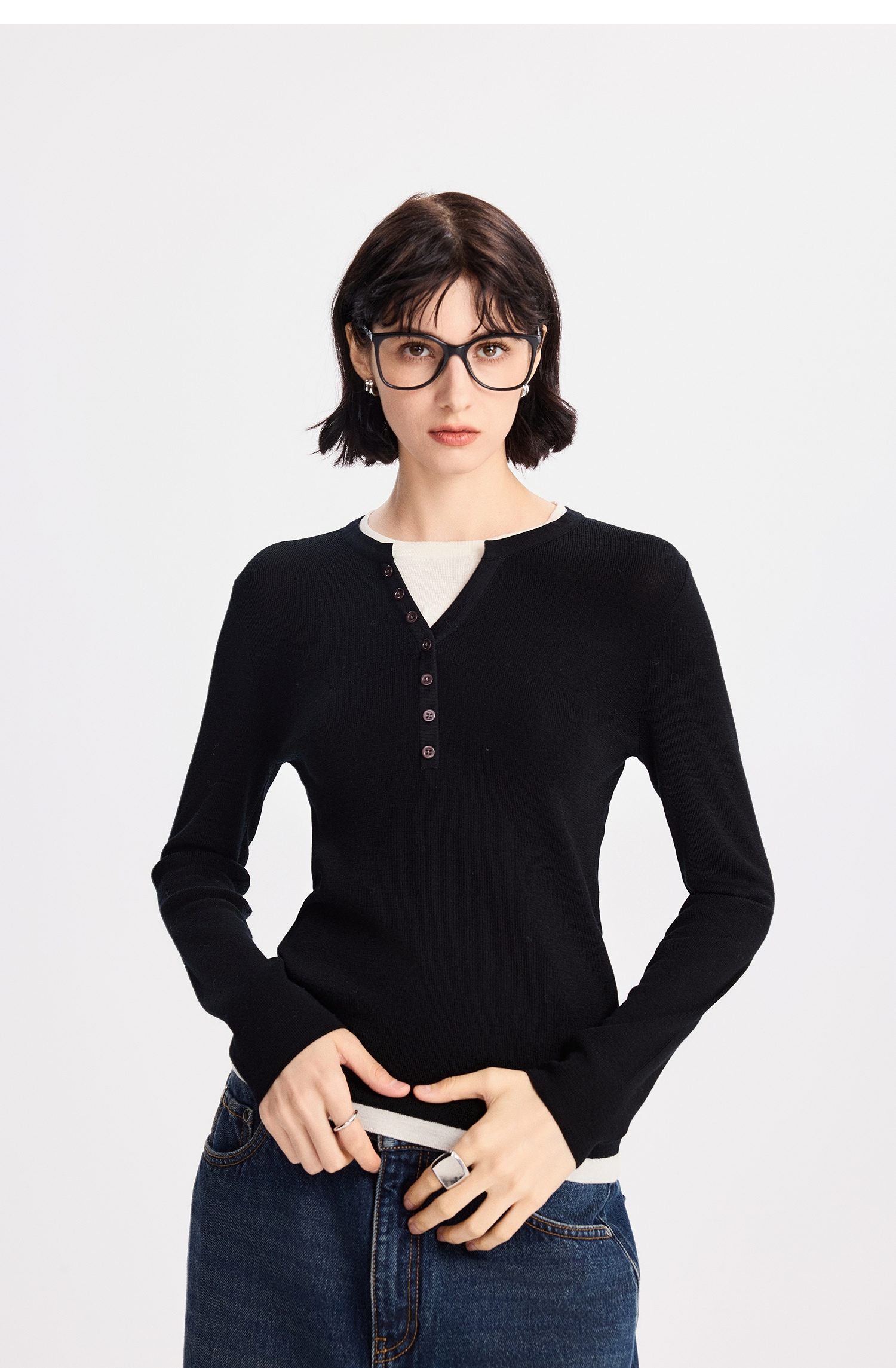 棉仓366635046-羊毛不对称装饰扣假两件针织衫