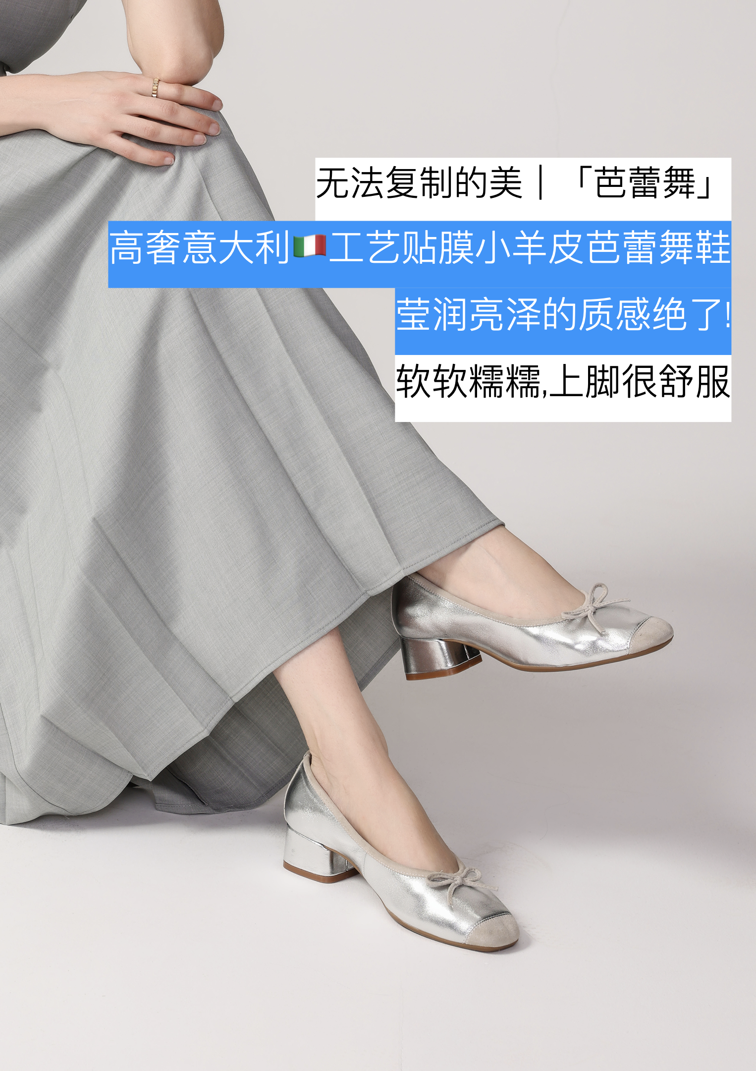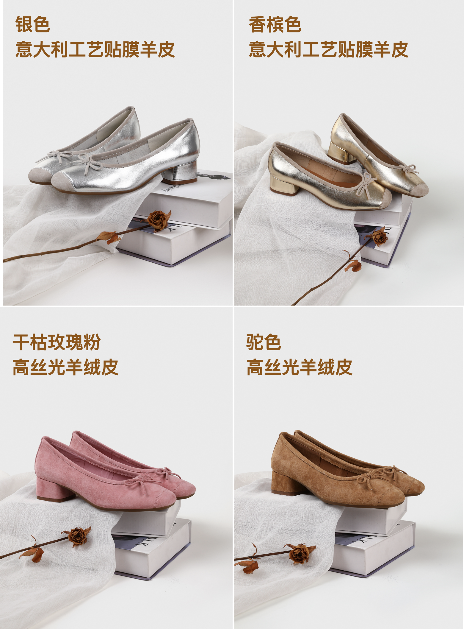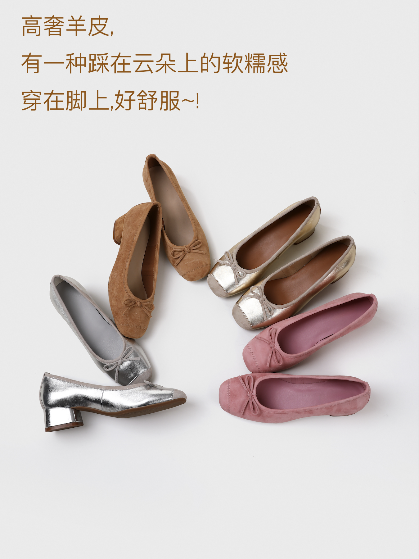 通体软糯无敌的羊皮材质,银色和香槟色是进口贴膜小羊皮➕羊反绒材质,裸色和玫粉色是羊反绒材质,无涂层看得见的毛孔,纹路清晰,轻薄透气,皮质的质感肉眼可见。