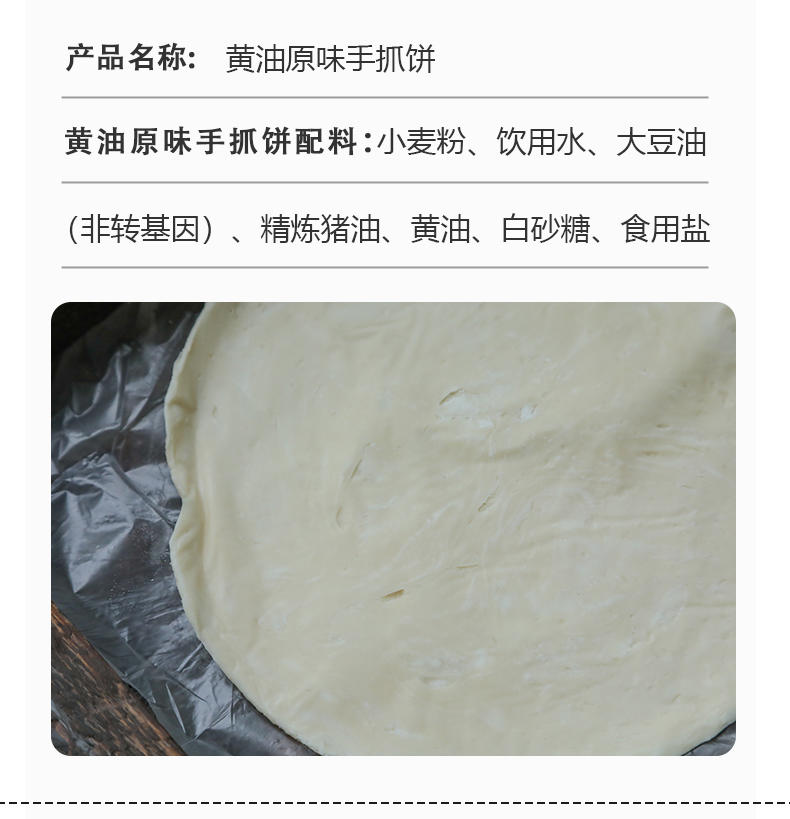 4、原味手抓饼::小麦粉,饮用水,大豆油(非转基因),食用猪精炼油,黄油,白砂糖,食用盐