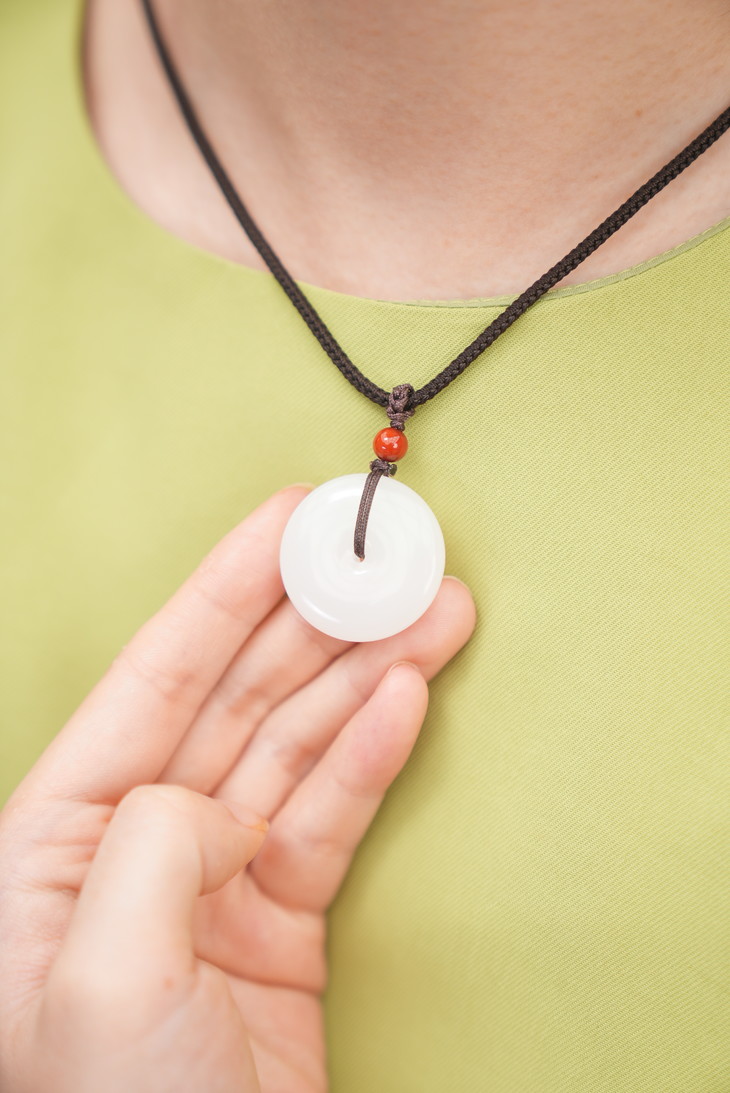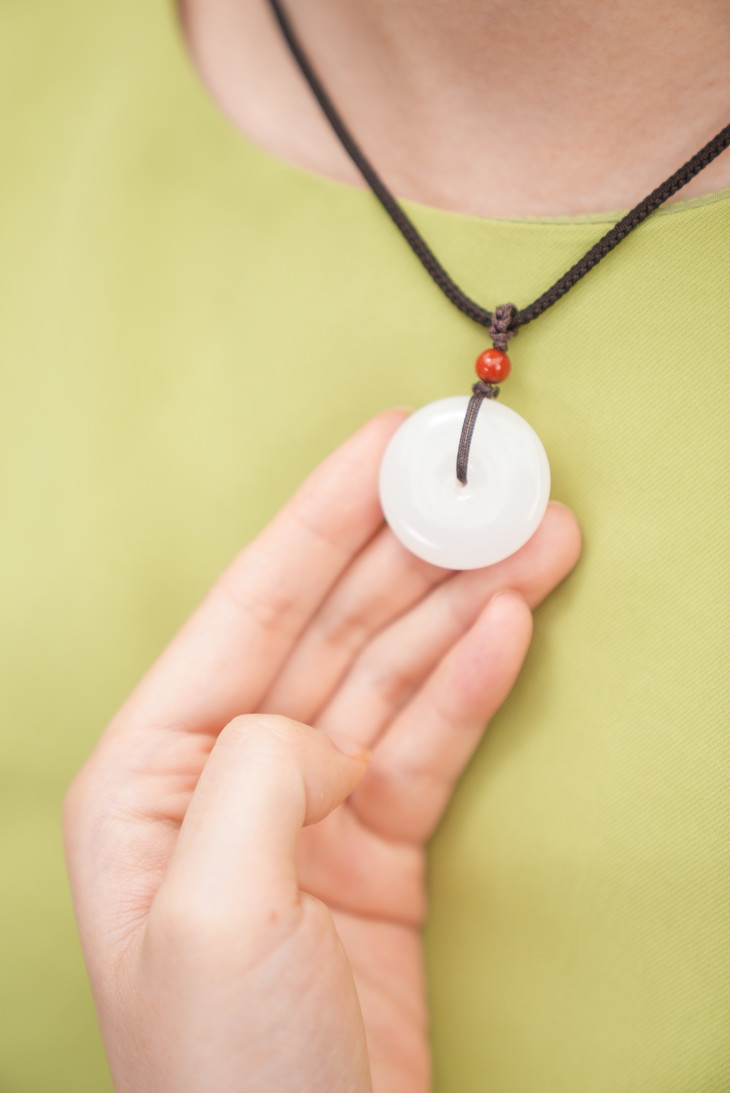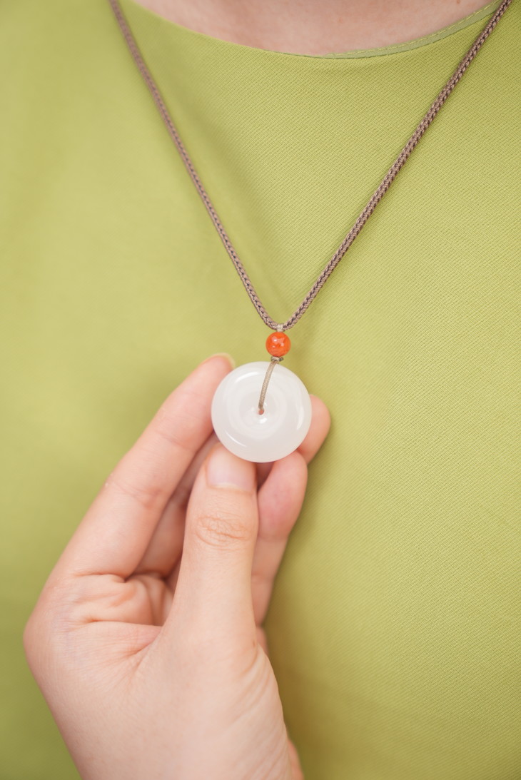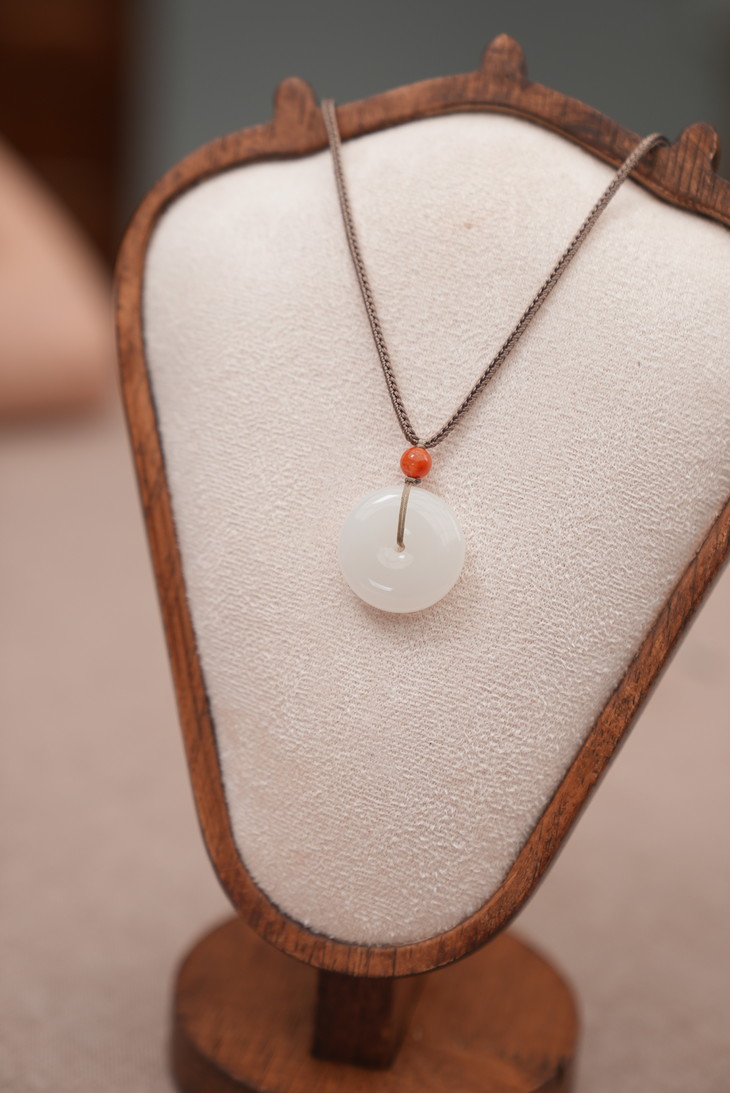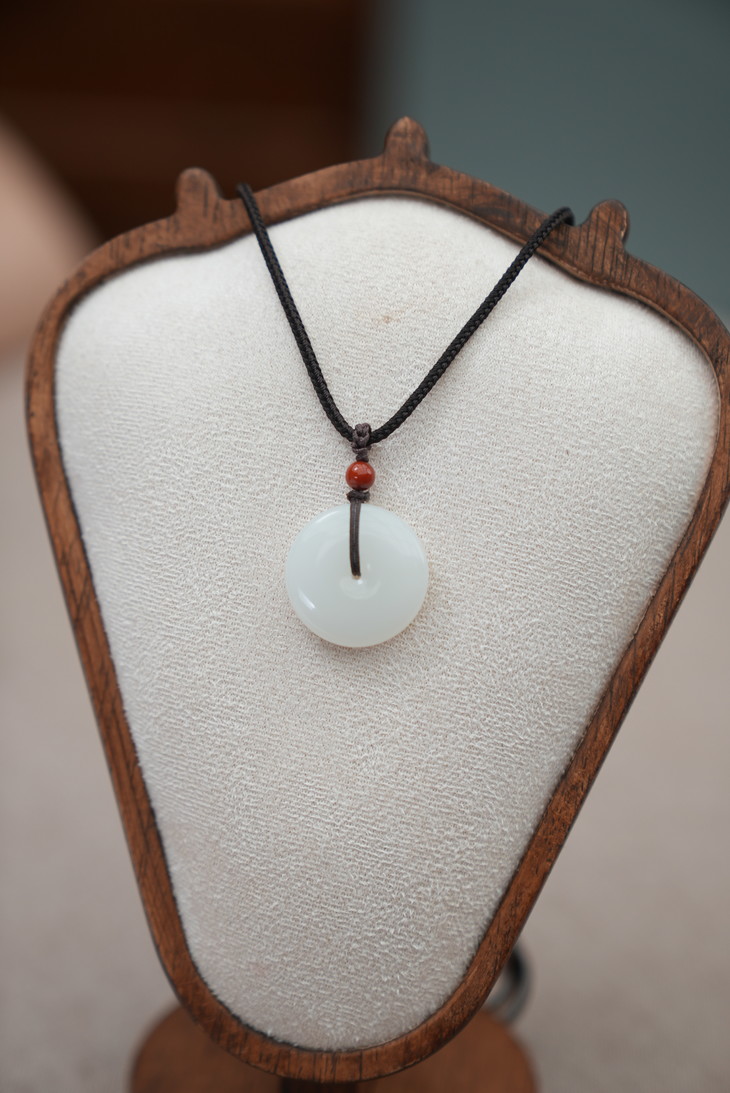 精选和田玉,打灯看结构均匀细腻;又油又亮,表面润且光滑,搭配深色编绳非常有古色古香的味道;白色偏冷调,同时也有着青海料的通透感。