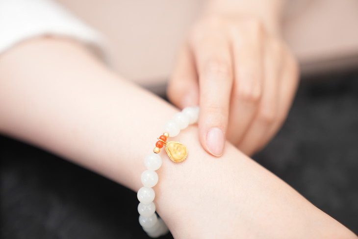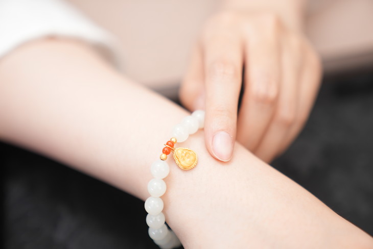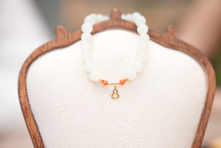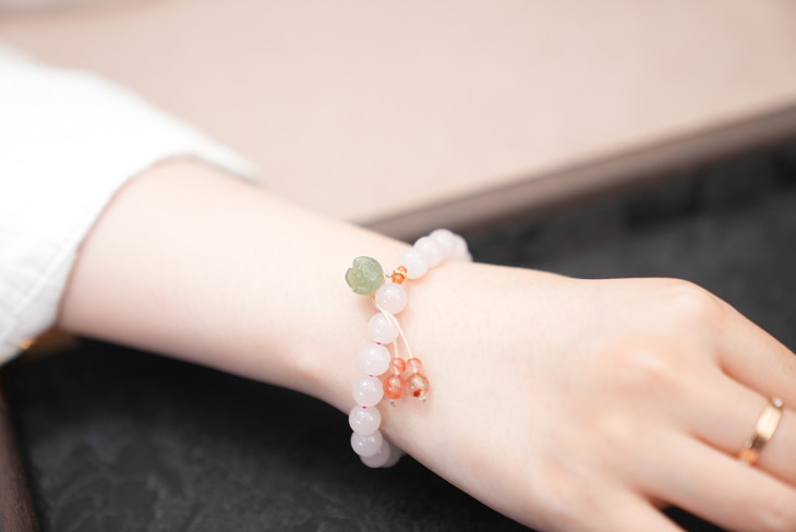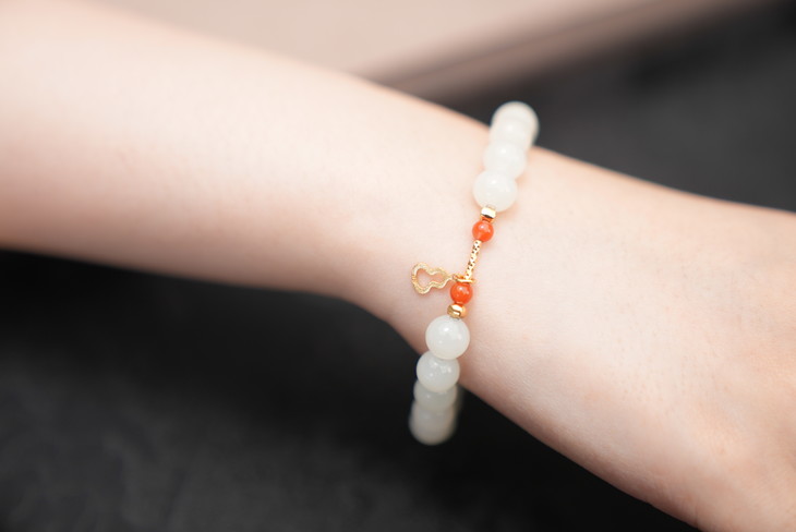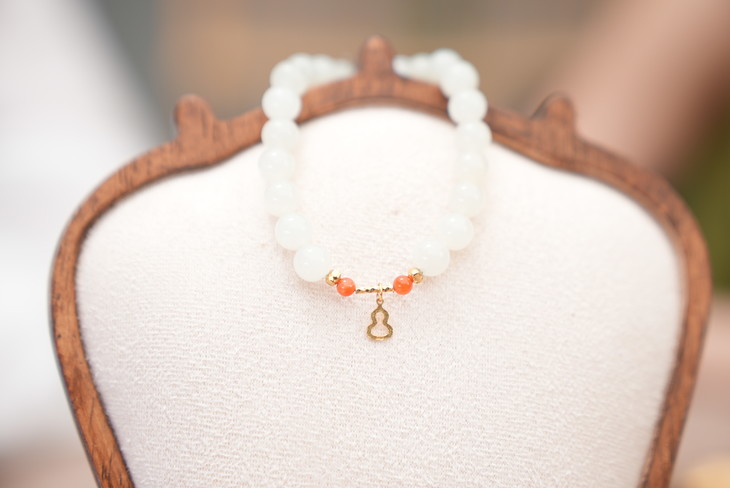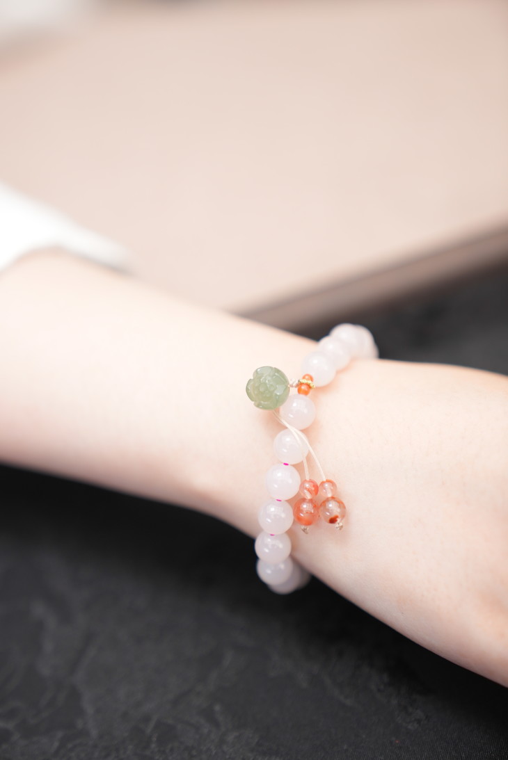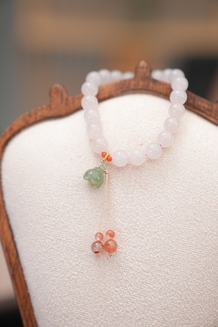 在普通晴水手串的基础上,加入了小葫芦配件和玛瑙小珠,色彩立马鲜亮,不再单调,轻松打造新中式氛围。