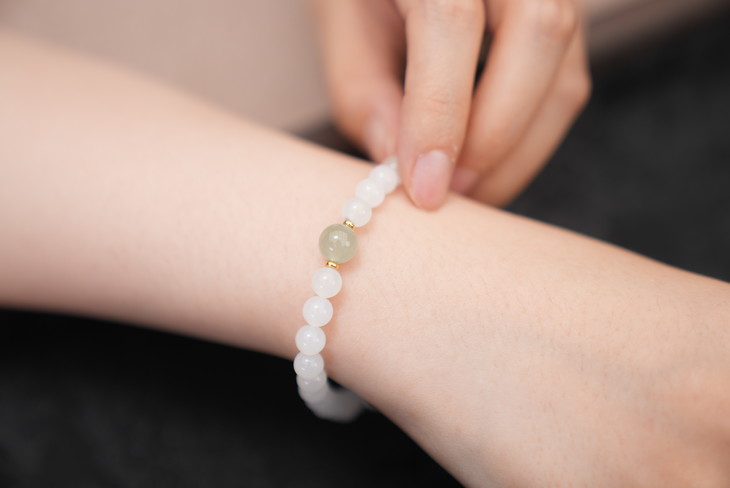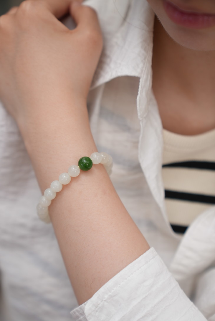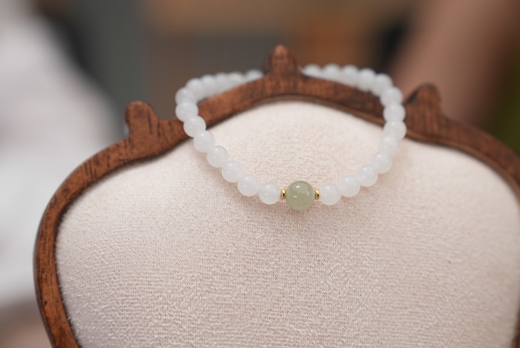 精选和田玉珠,以冰底和田白玉珠成串,加入大卡数晴水和田玉隔珠,色彩清新雅致。和田玉珠通透的质地,莹润的光泽,给人一种清凉之感。隔珠左右点缀两点金属亮色,更添中式美感。特意选用小卡数和田玉白玉珠,更秀气,佩戴起来更显手腕纤细。