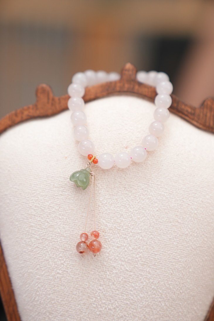 精选冰透藕粉和田玉珠,饱满圆润,颗颗晶莹,玉质细腻,低饱和度的藕粉色淡雅温柔;底部搭配和田玉莲蓬小坠子和冰飘玛瑙小珠,清新脱俗的红绿之配,似是池中莲花清丽绽放,中式美学感满满。