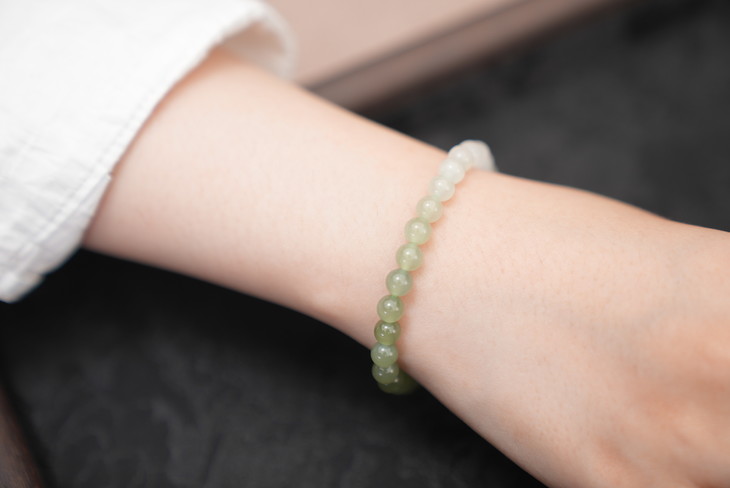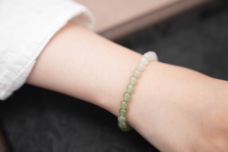 精选晴水渐变和田玉,由深至浅,半山半水,颜色自然过渡,颇有水墨晕染的意蕴。冰底通透的玉质,给人冰冰凉凉的清爽感的同时又不失温润,宛如春日里涓涓的溪水,滋润人心。小卡数玉珠,佩戴腕间更显秀气,温柔中又带点清冷,轻松打造新中式风格。