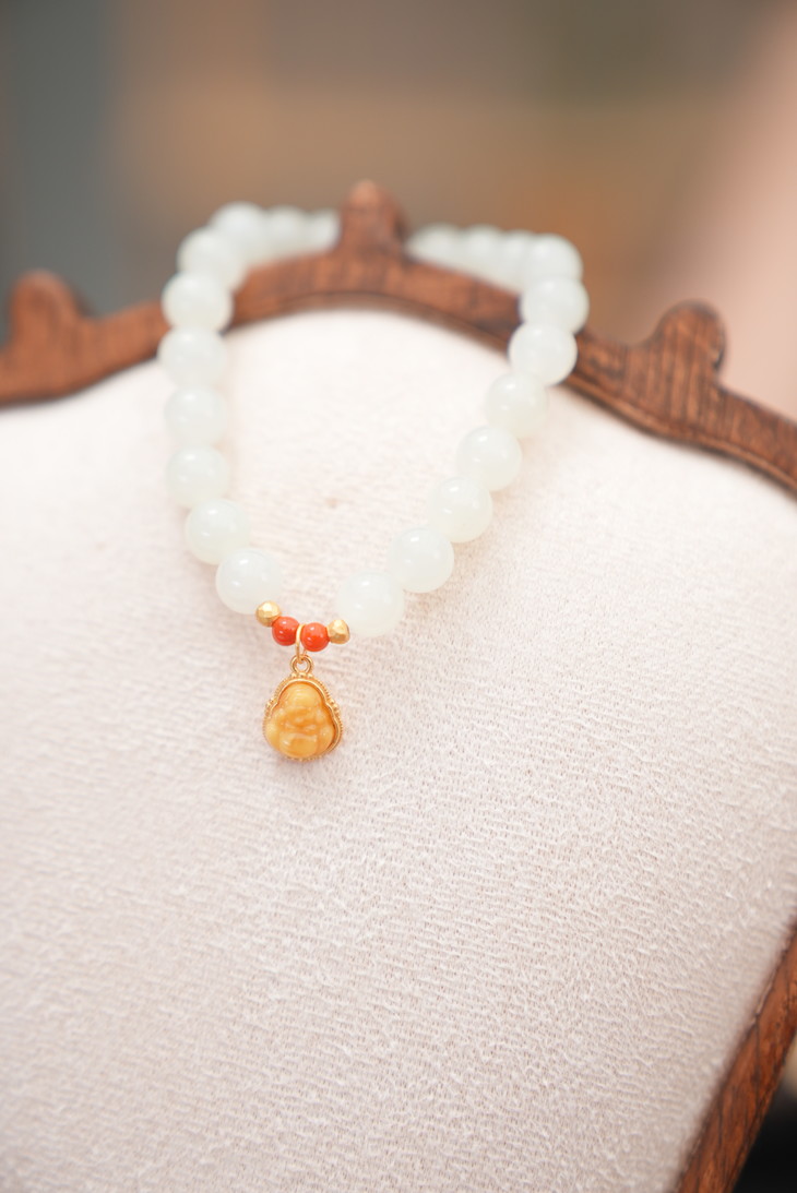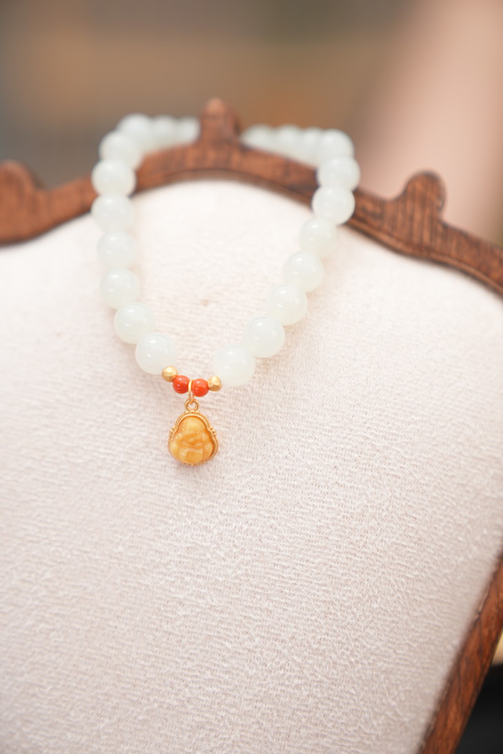 蜜蜡佛公小吊坠,雕工精致,整体色彩非常素雅;冰底和田玉珠,玉质通透水润,光泽好,颜色均匀干净;南红小珠,虽然小但依旧有品质,质地干净,颜色鲜亮点睛。