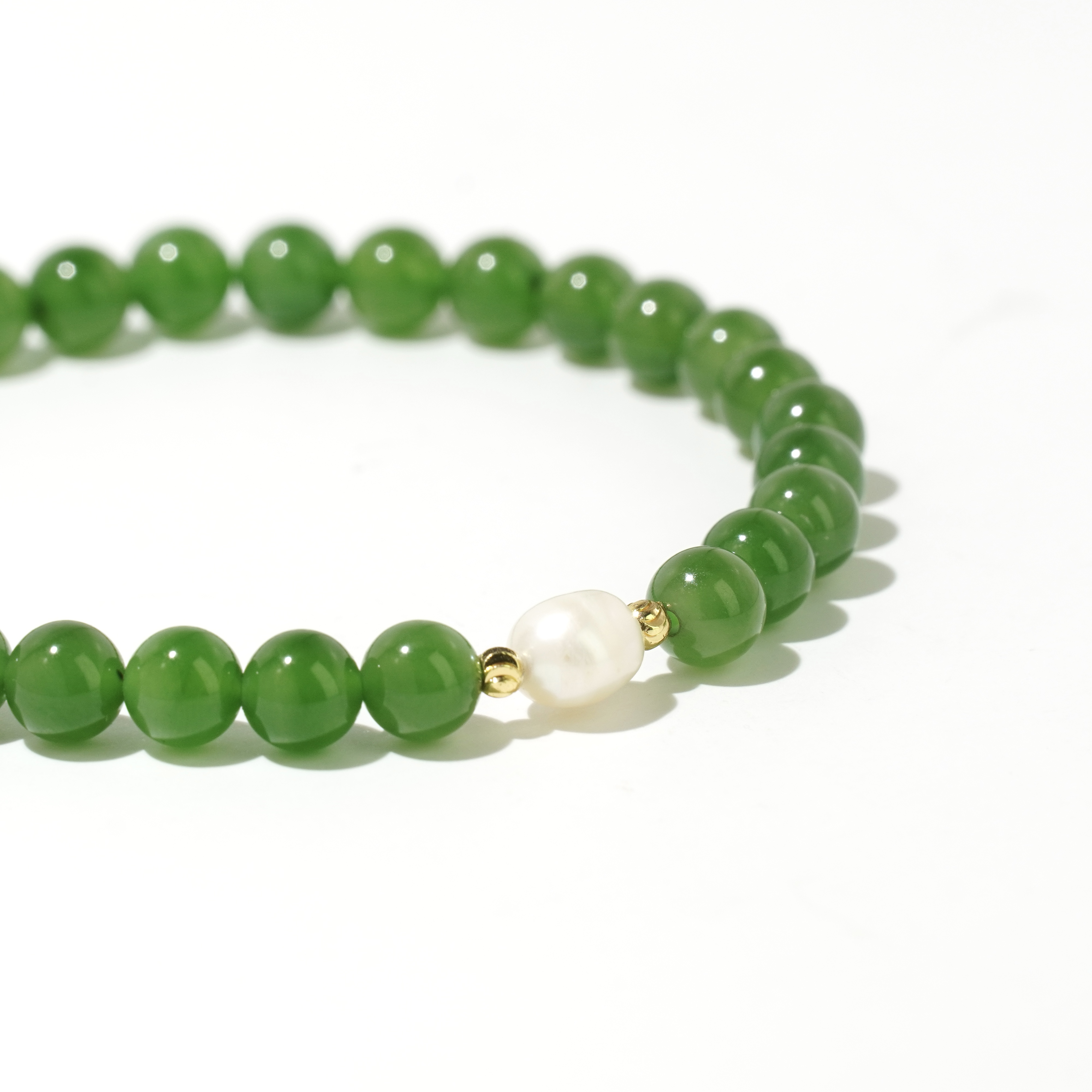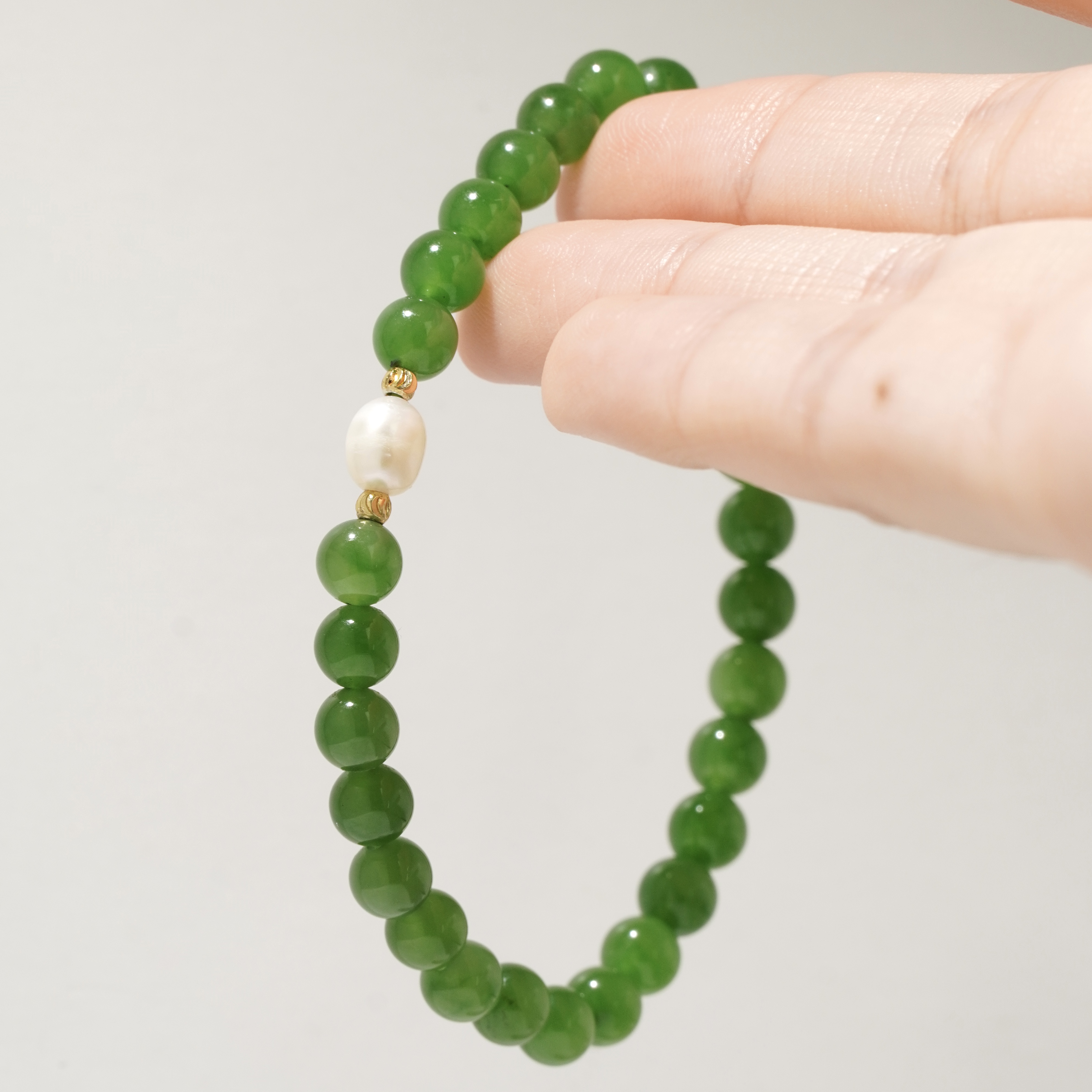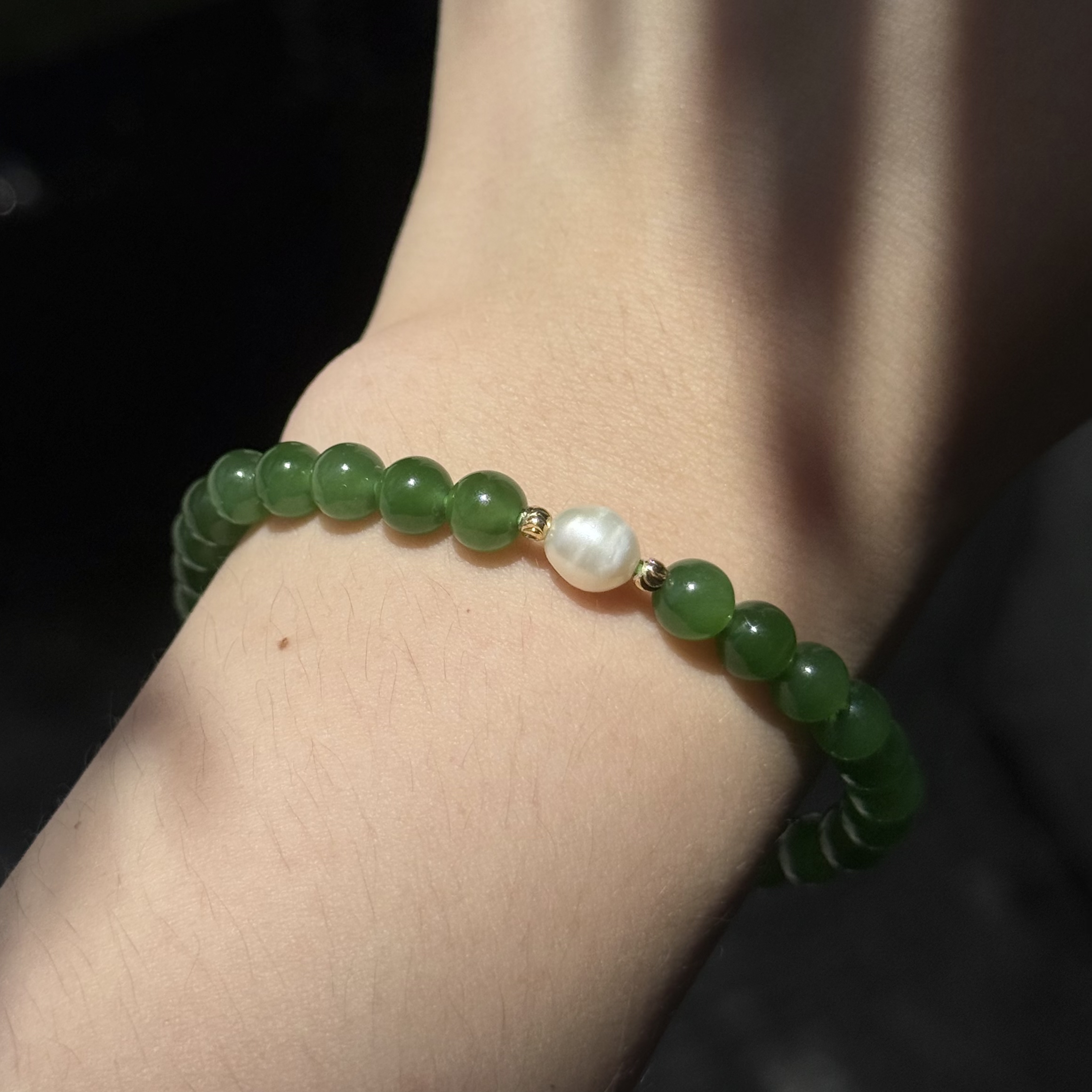 精选和田玉碧玉,冰底通透,清清凉凉,浓郁鲜亮的绿色盈盈欲滴,生命力满满;玉质也非常紧密,细腻而干净。中间点缀异形珍珠,柔亮的光泽给整个手串增添了一份温柔优雅;简约大气的设计,尽显气质。