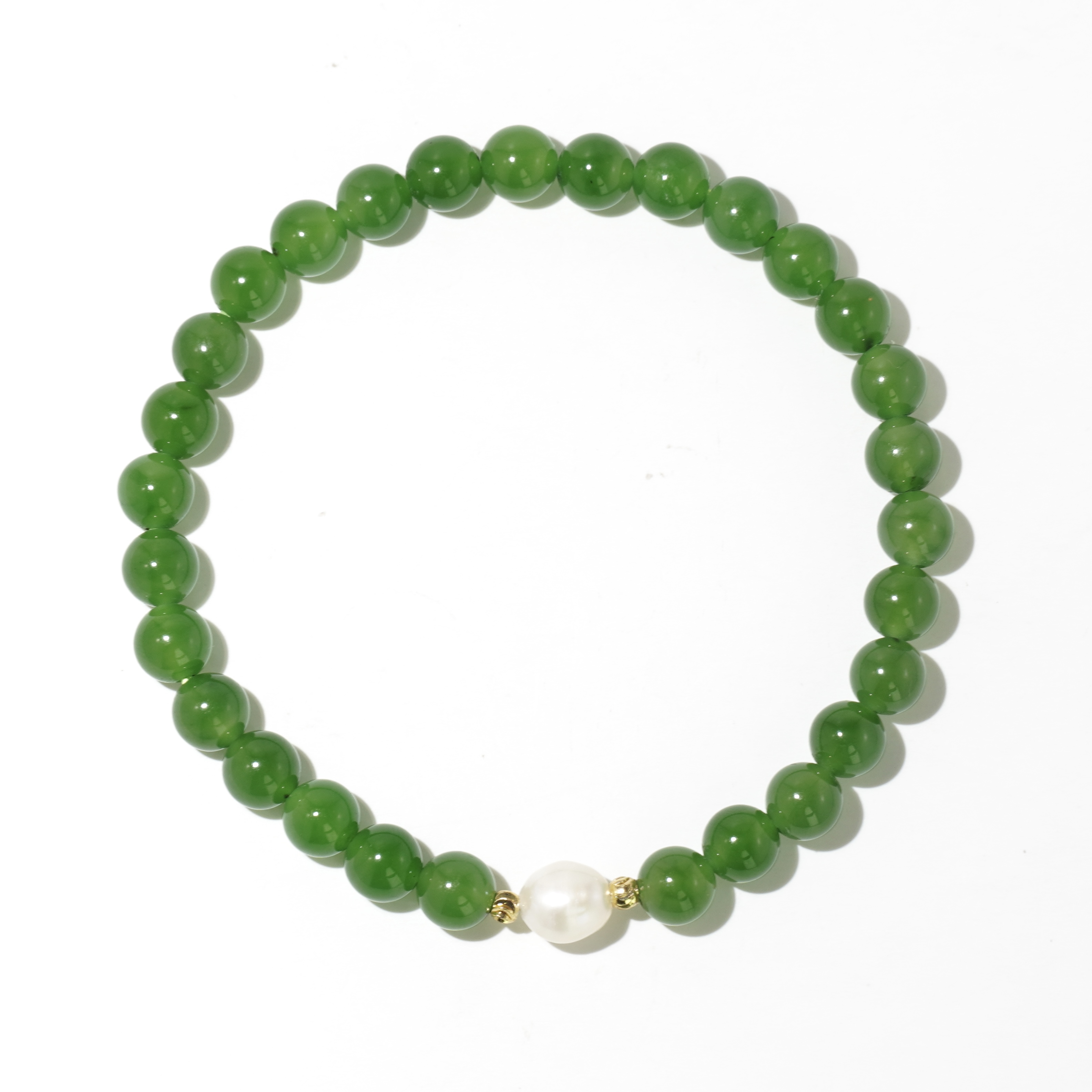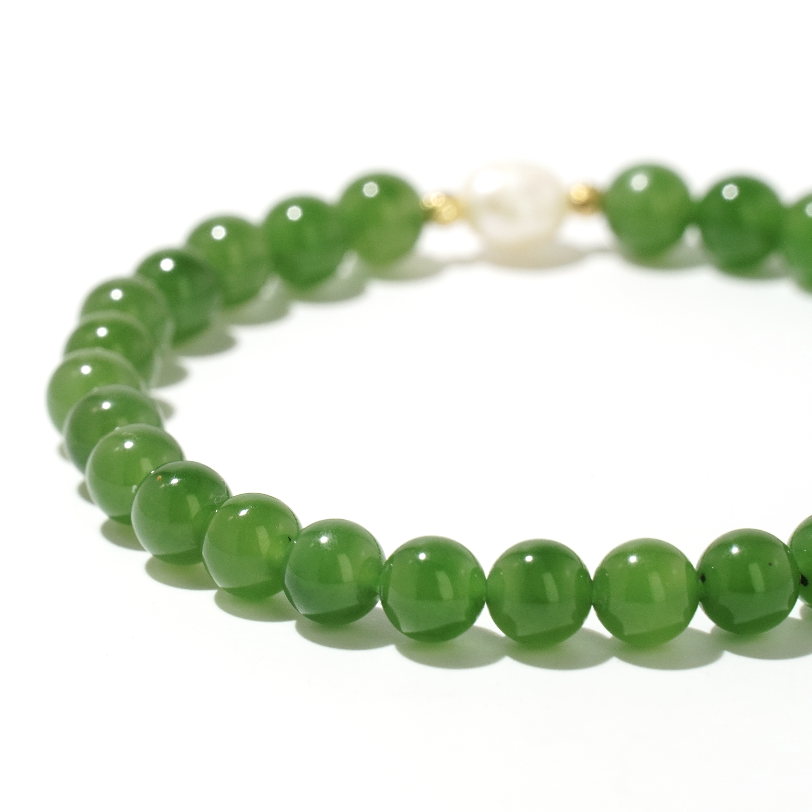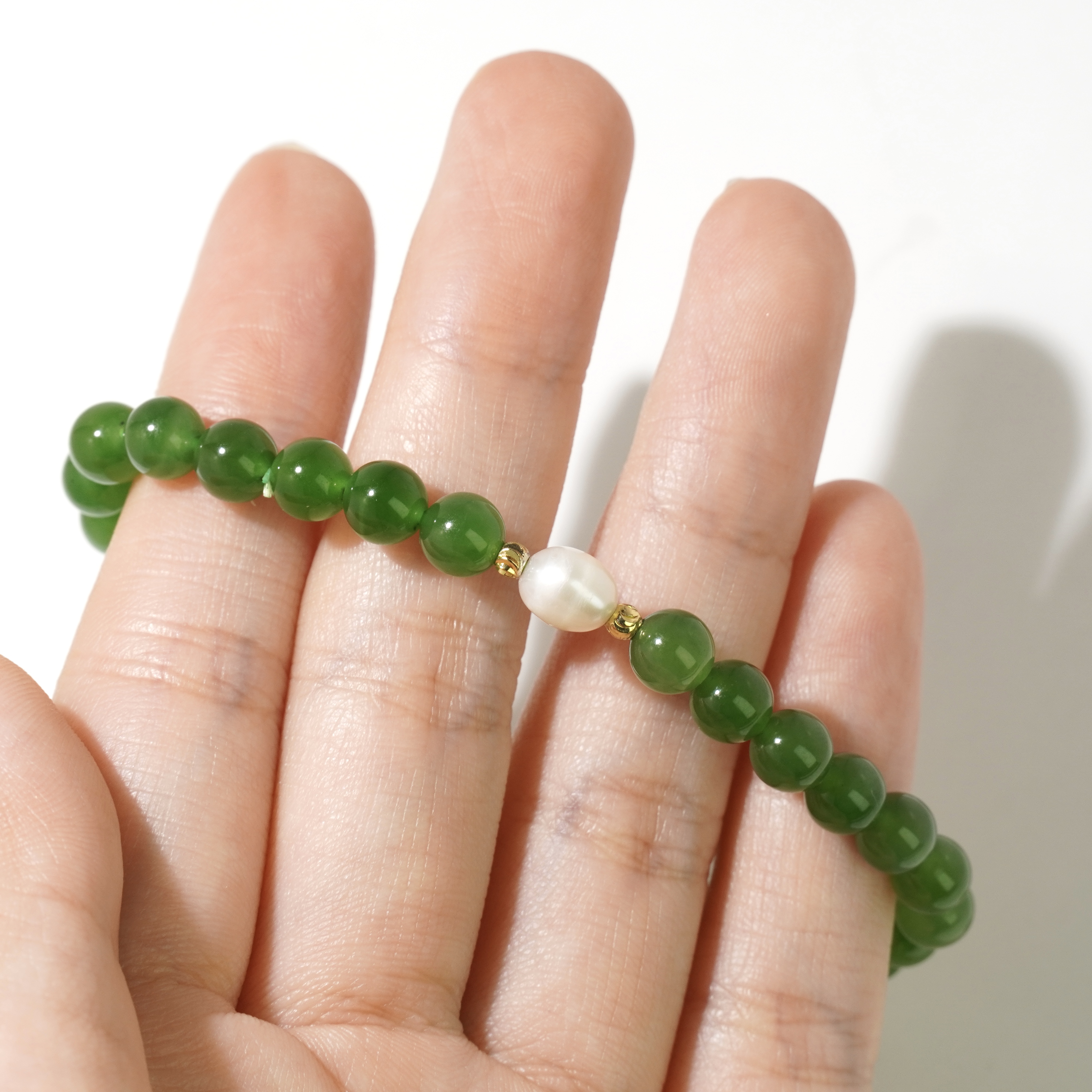 精选和田玉碧玉,冰底通透,清清凉凉,浓郁鲜亮的绿色盈盈欲滴,生命力满满;玉质也非常紧密,细腻而干净。中间点缀异形珍珠,柔亮的光泽给整个手串增添了一份温柔优雅;简约大气的设计,尽显气质。