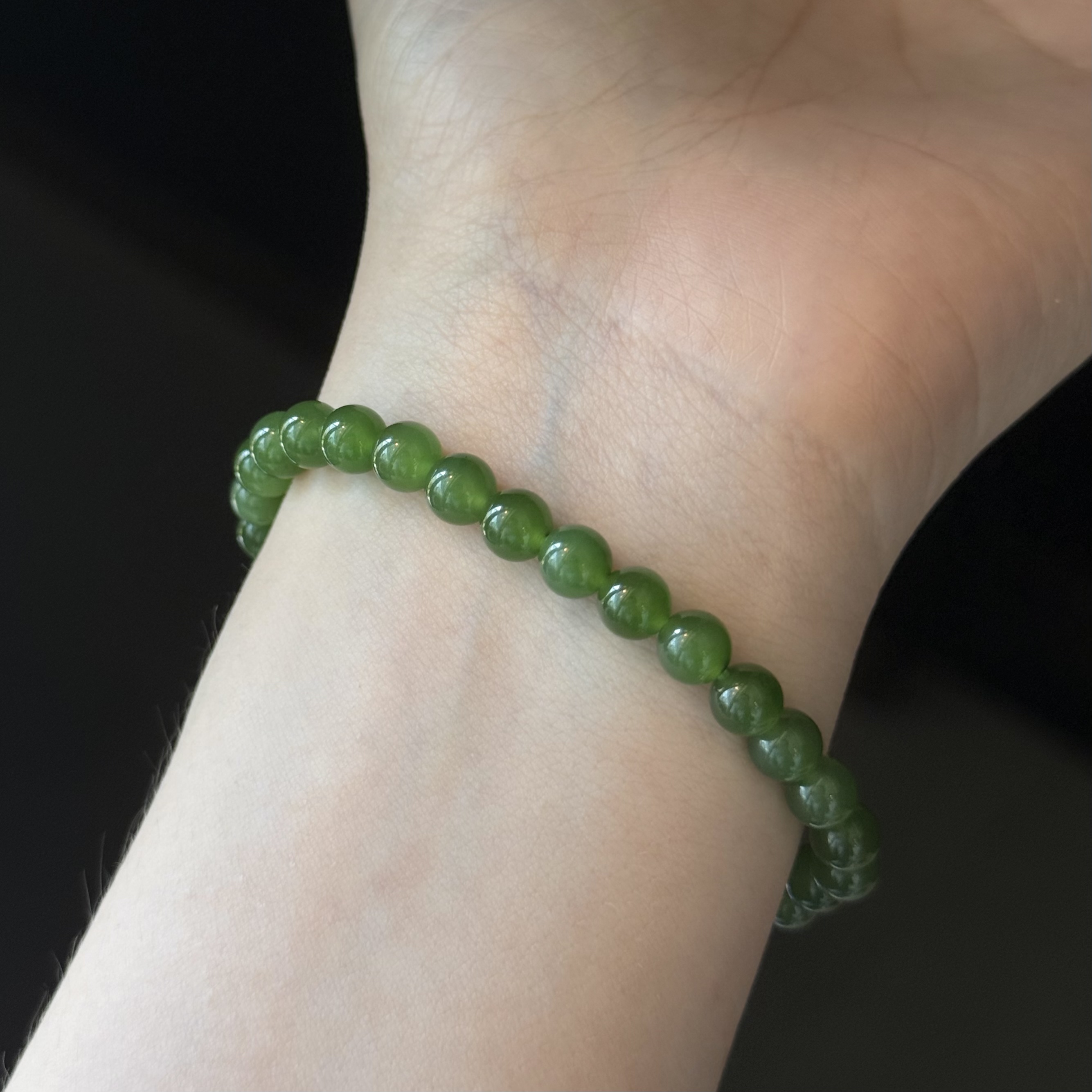 和田玉碧玉手链,玉质干净,少许小矿点,社交距离下便不可见。肉眼观察,玉质细腻无结构,光泽油亮,推手有起油感;
