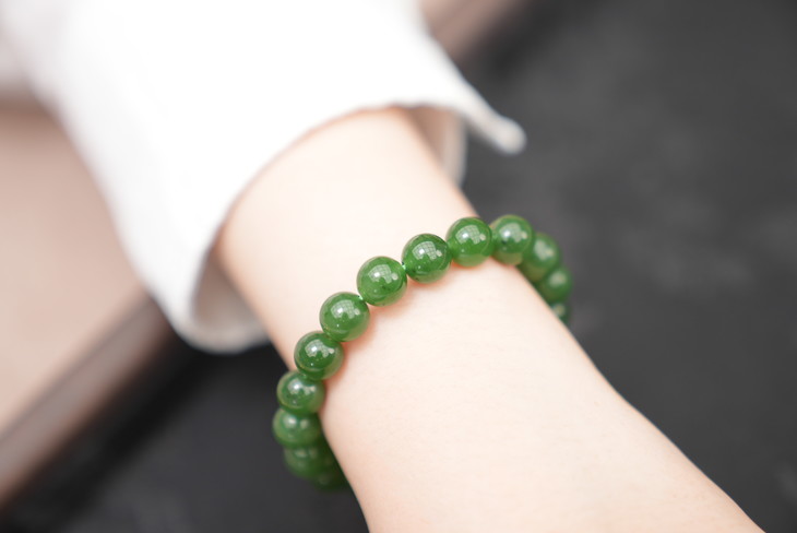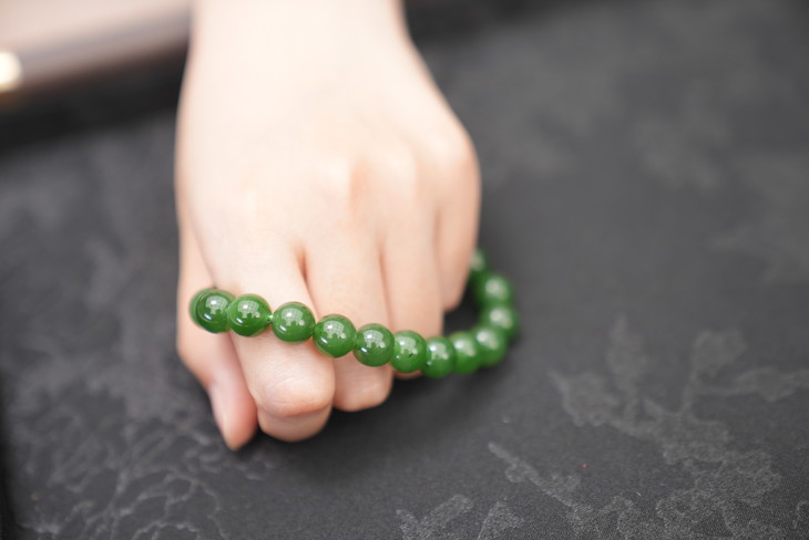和田玉碧玉手链,玉质非常干净,几乎无黑点;玉质油润度好,油亮光泽,盘起来手感也非常润滑;肉眼观察无结构,整体状态完美。