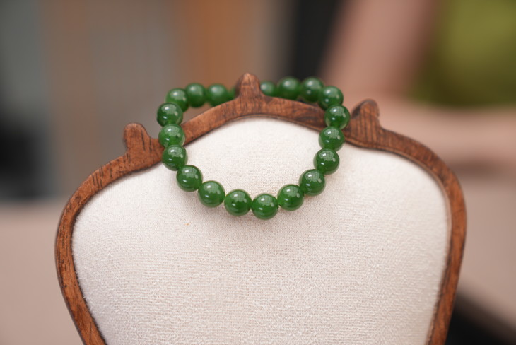 色彩亮丽,浓郁不发灰的菠菜绿,深浅适中,色彩均匀,给人生命力很旺盛的感觉,佩戴腕间,非常显白。