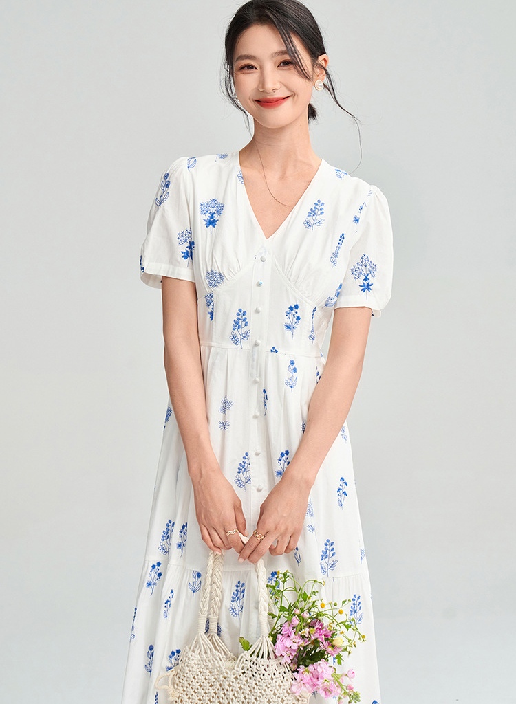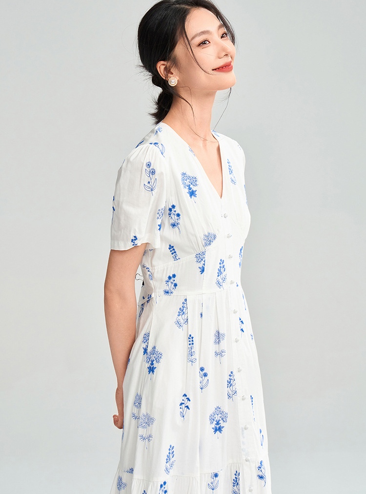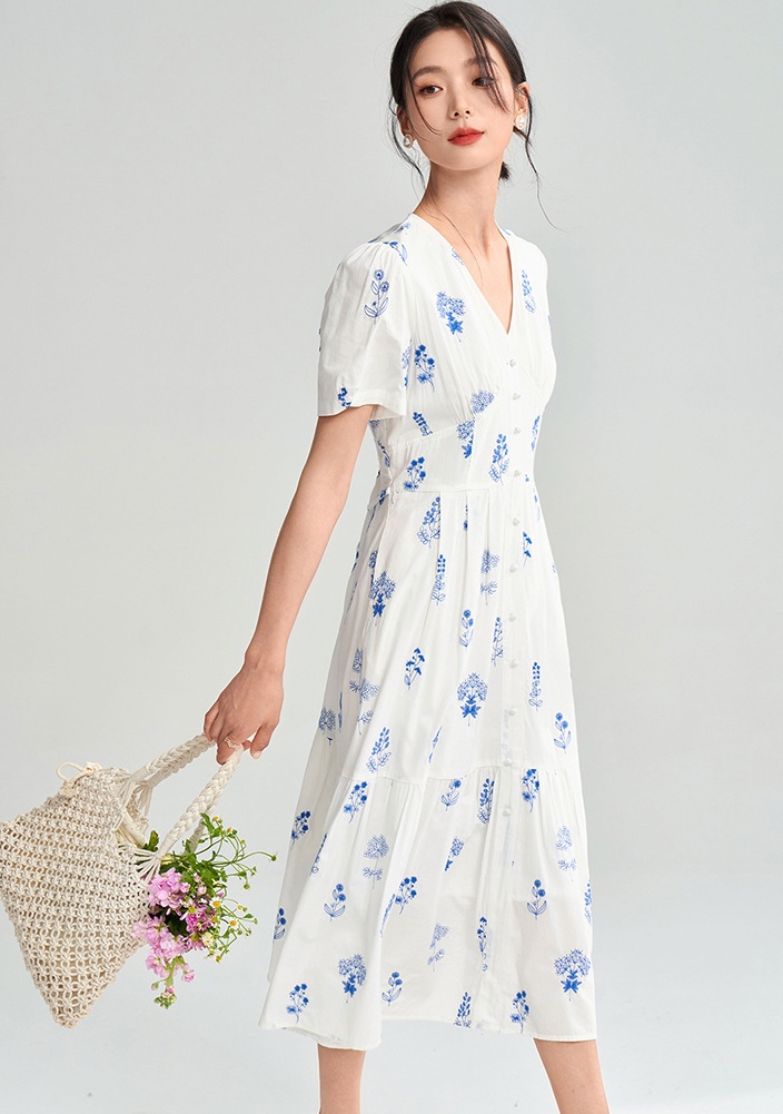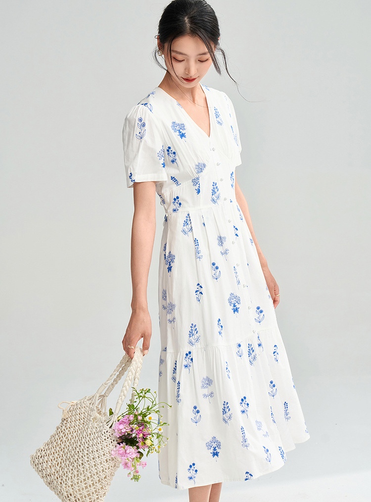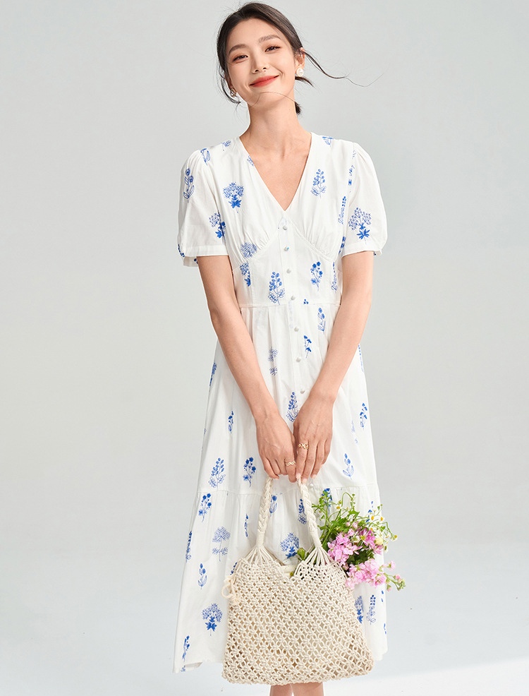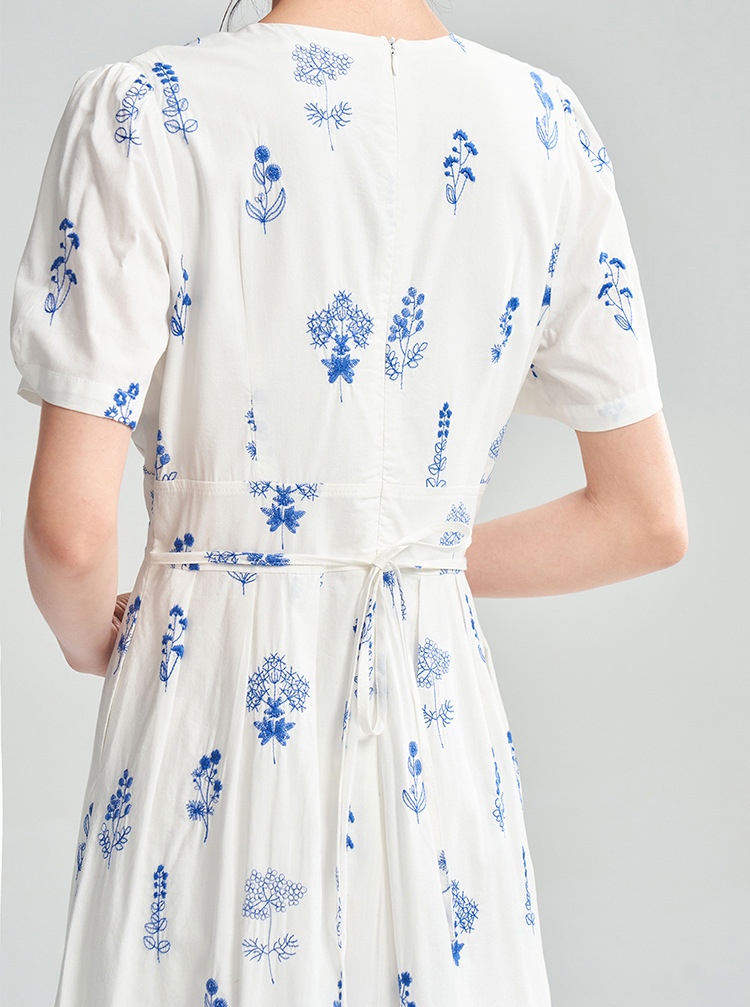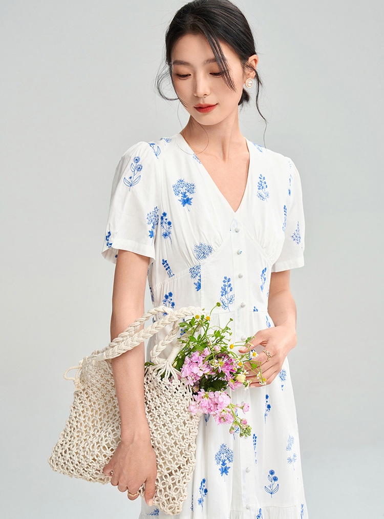 清新的蓝色绣花蔓延裙身宛若之神莫奈花园,气质V领展现锁骨优化脸型过膝长裙不压身高,轻松释放柔美菁致的氛围感.