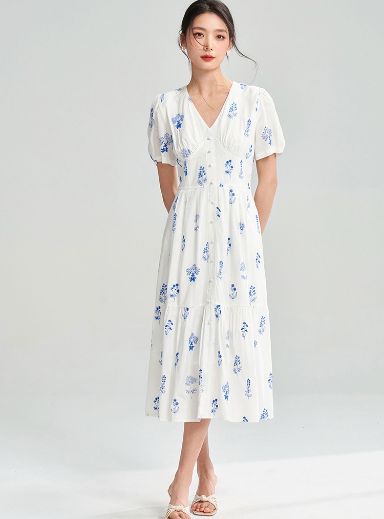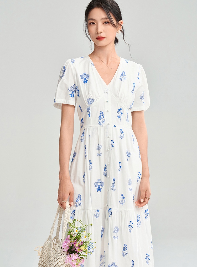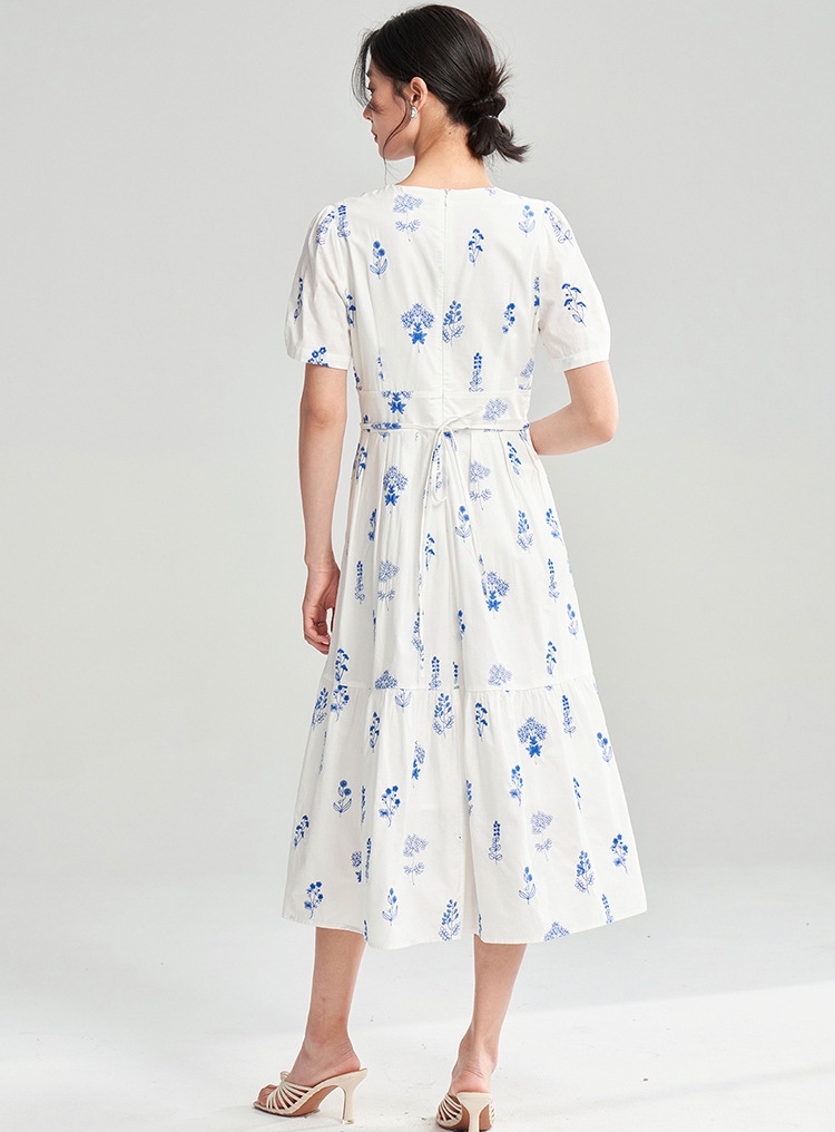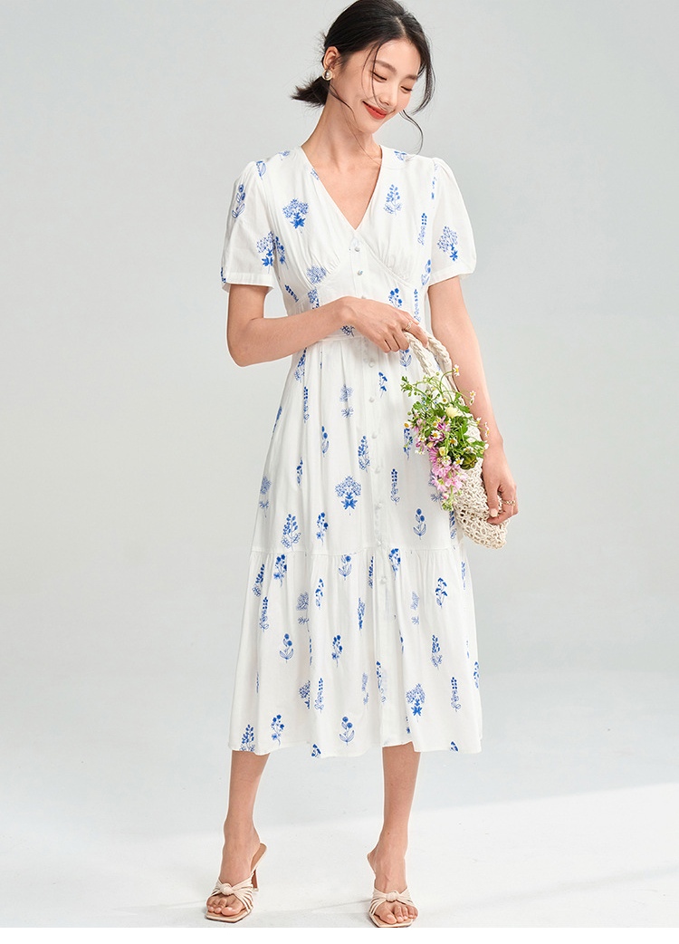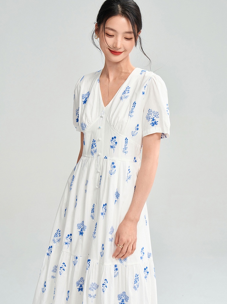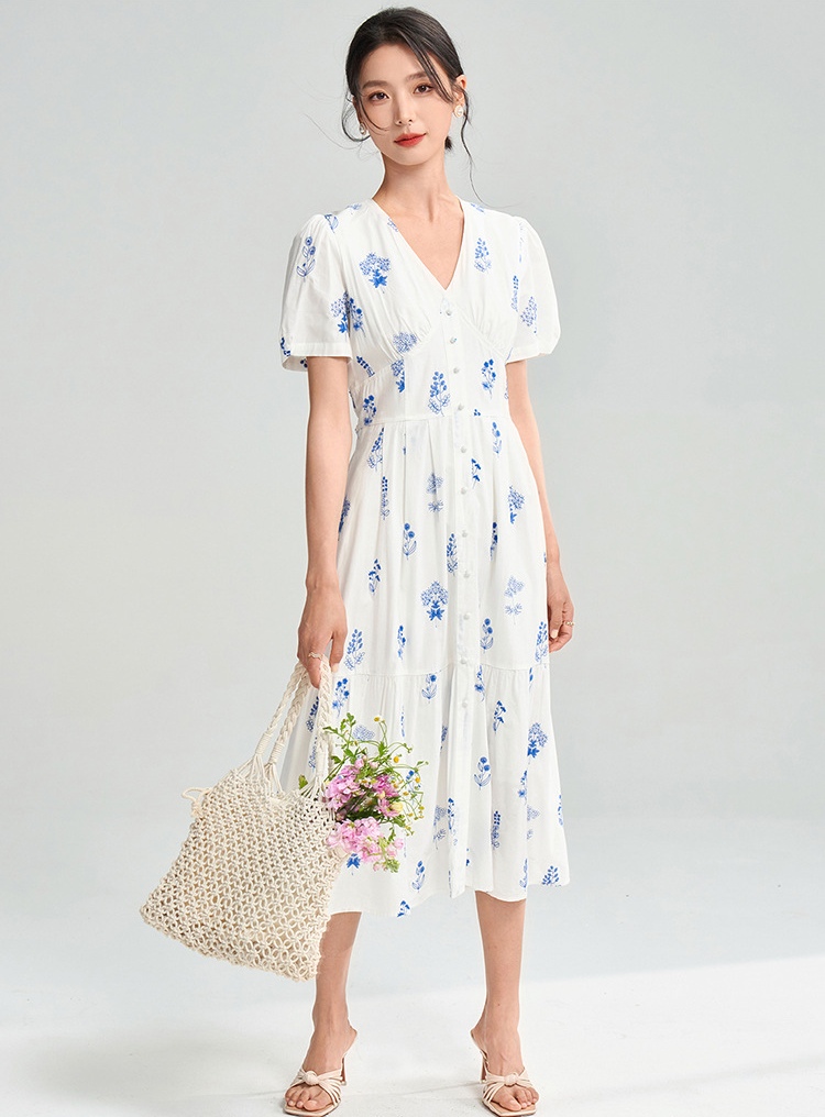清新的蓝色绣花蔓延裙身宛若之神莫奈花园,气质V领展现锁骨优化脸型过膝长裙不压身高,轻松释放柔美菁致的氛围感.