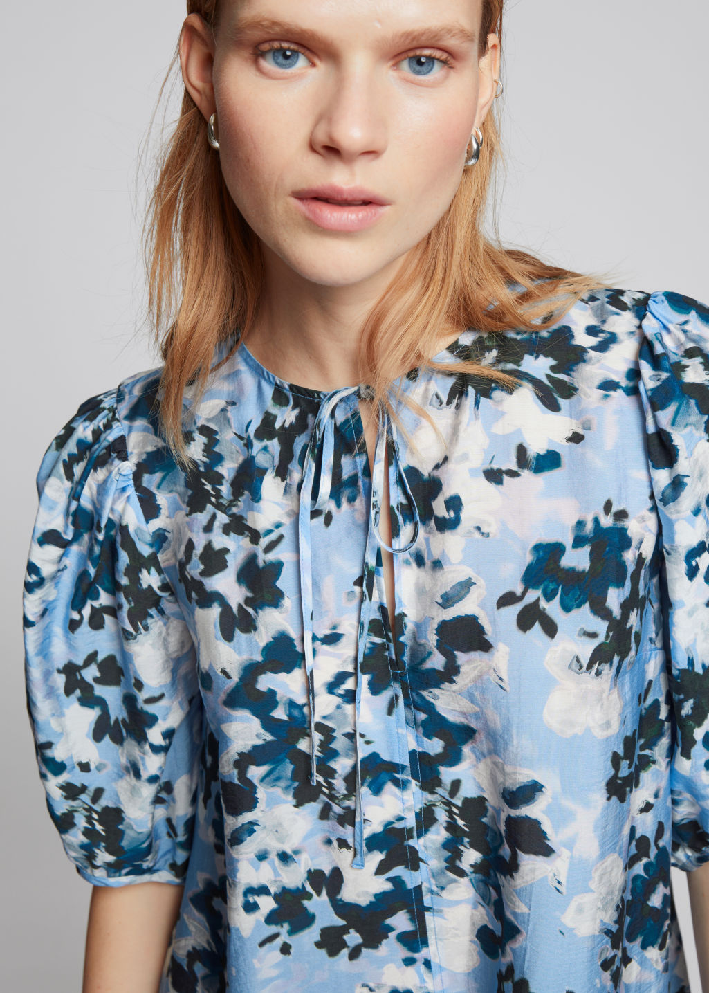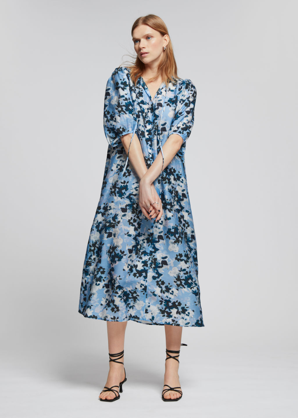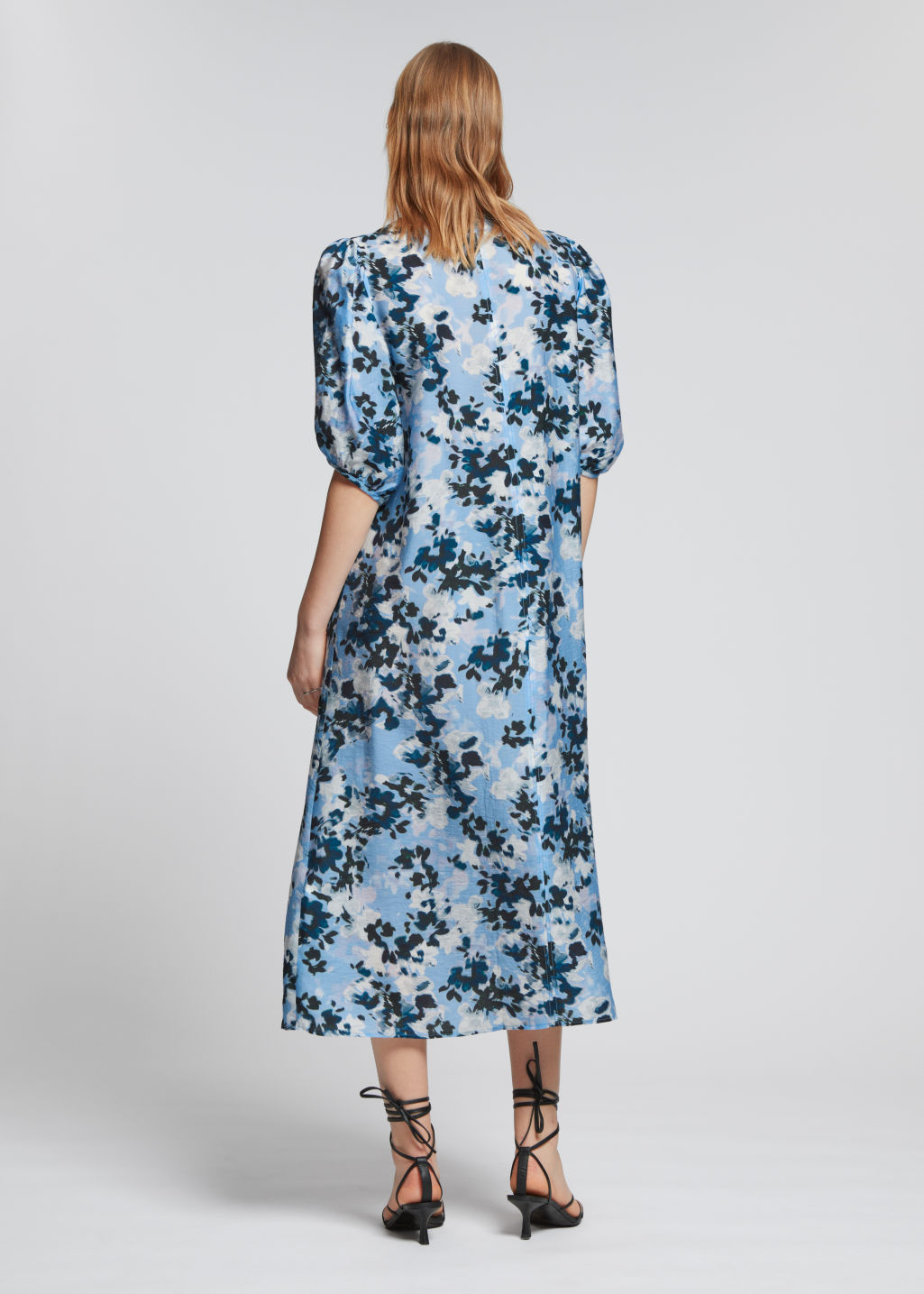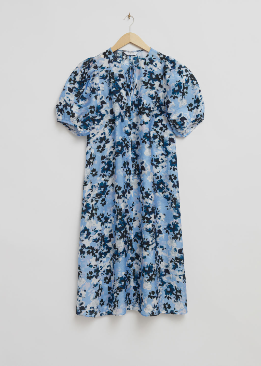 休闲风格的中长款泡泡袖连衣裙。这款连衣裙的特点是袖子为三分之二长度的泡泡袖,袖口有一个开口,并用细带系紧。整体上,该连衣裙的剪裁宽松,穿着舒适。