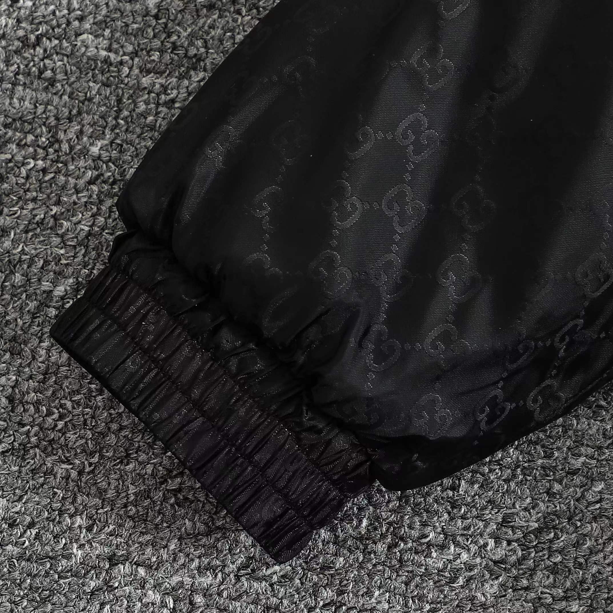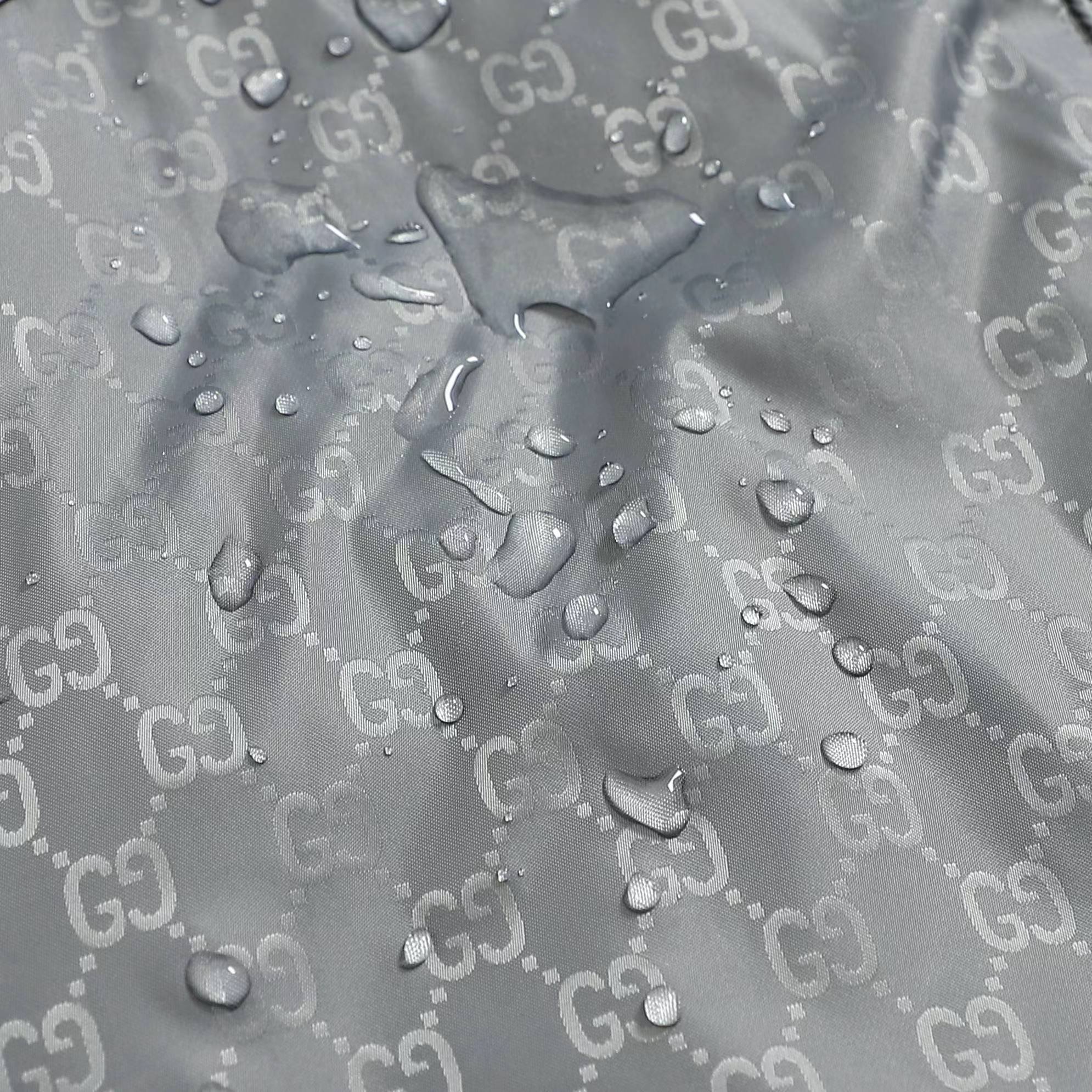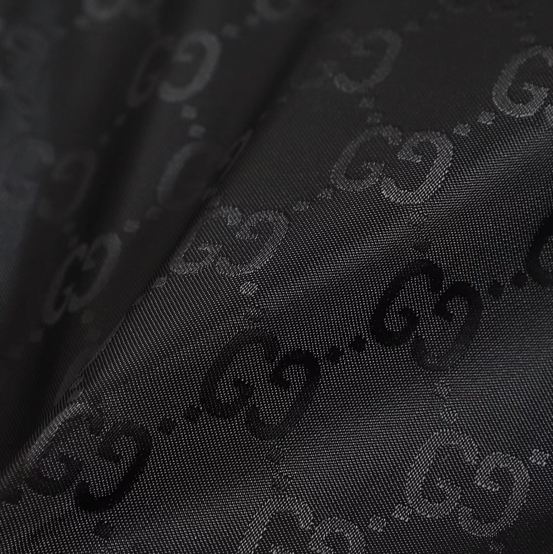 定制高密织丝光尼龙料 质感卓越 舒适贴肤 定制熠彩丝光提花科技棉锦 质感卓越 舒适贴肤 以曜石黑 灰为主基调 似夜幕下的星轨 邂逅铺满衣身的GG图案