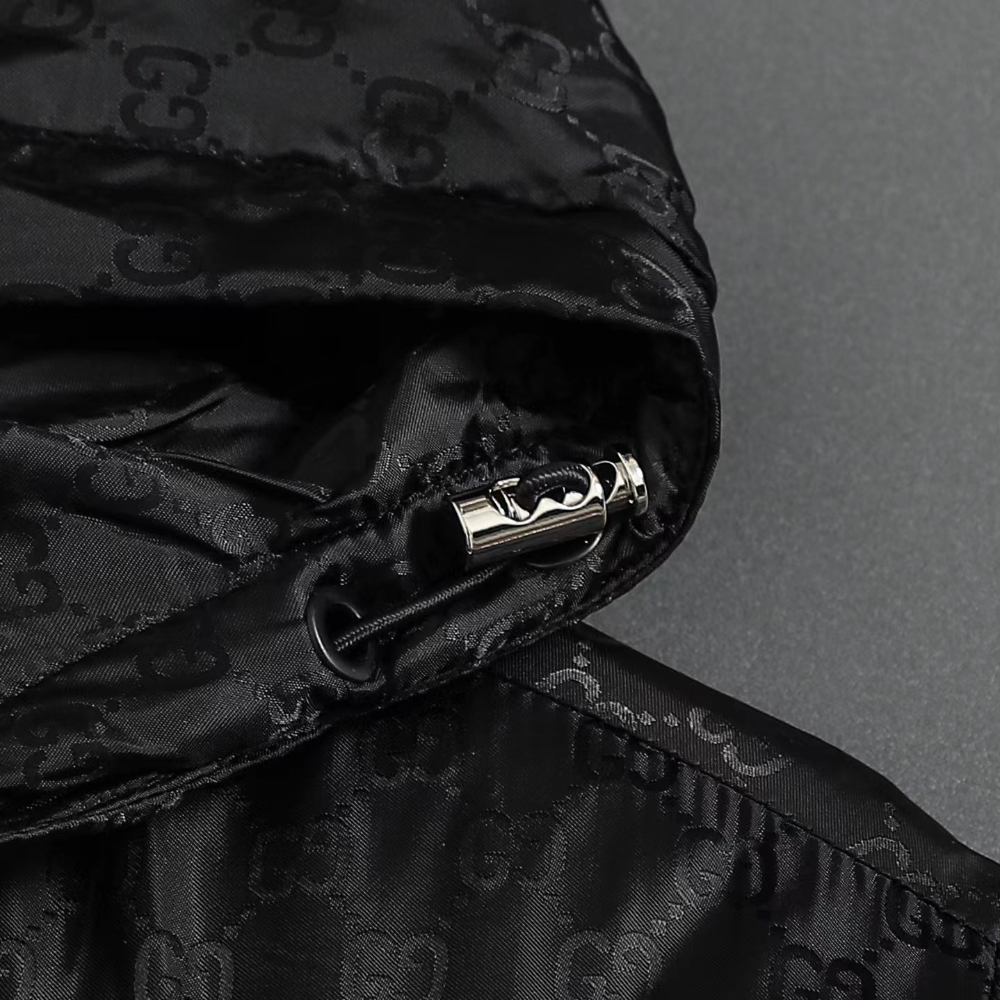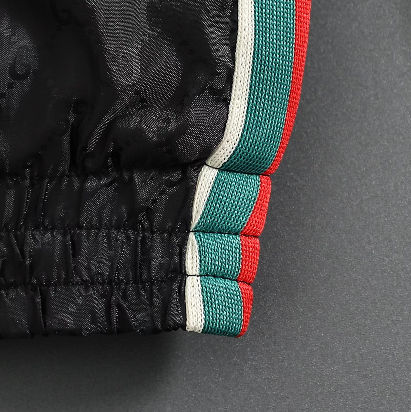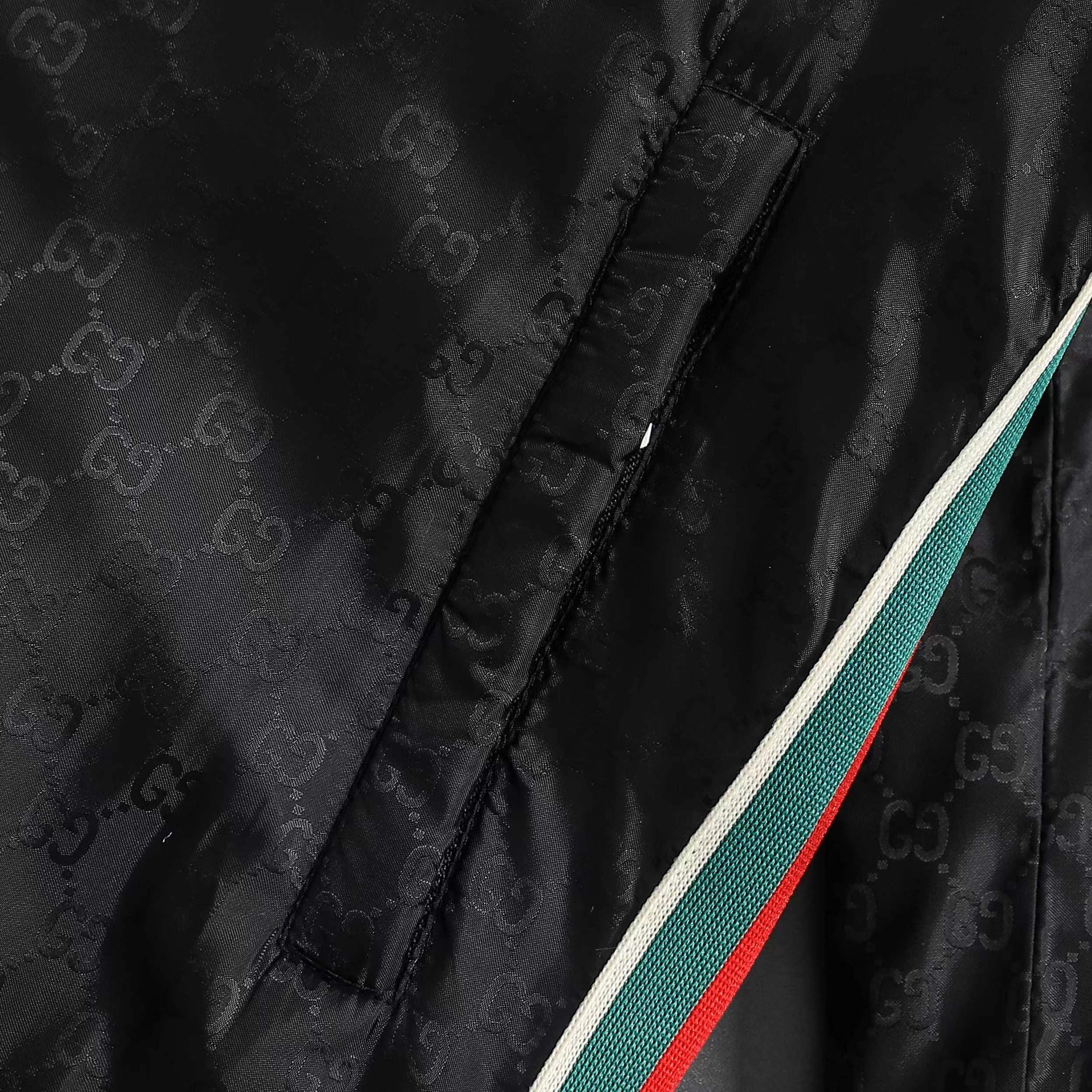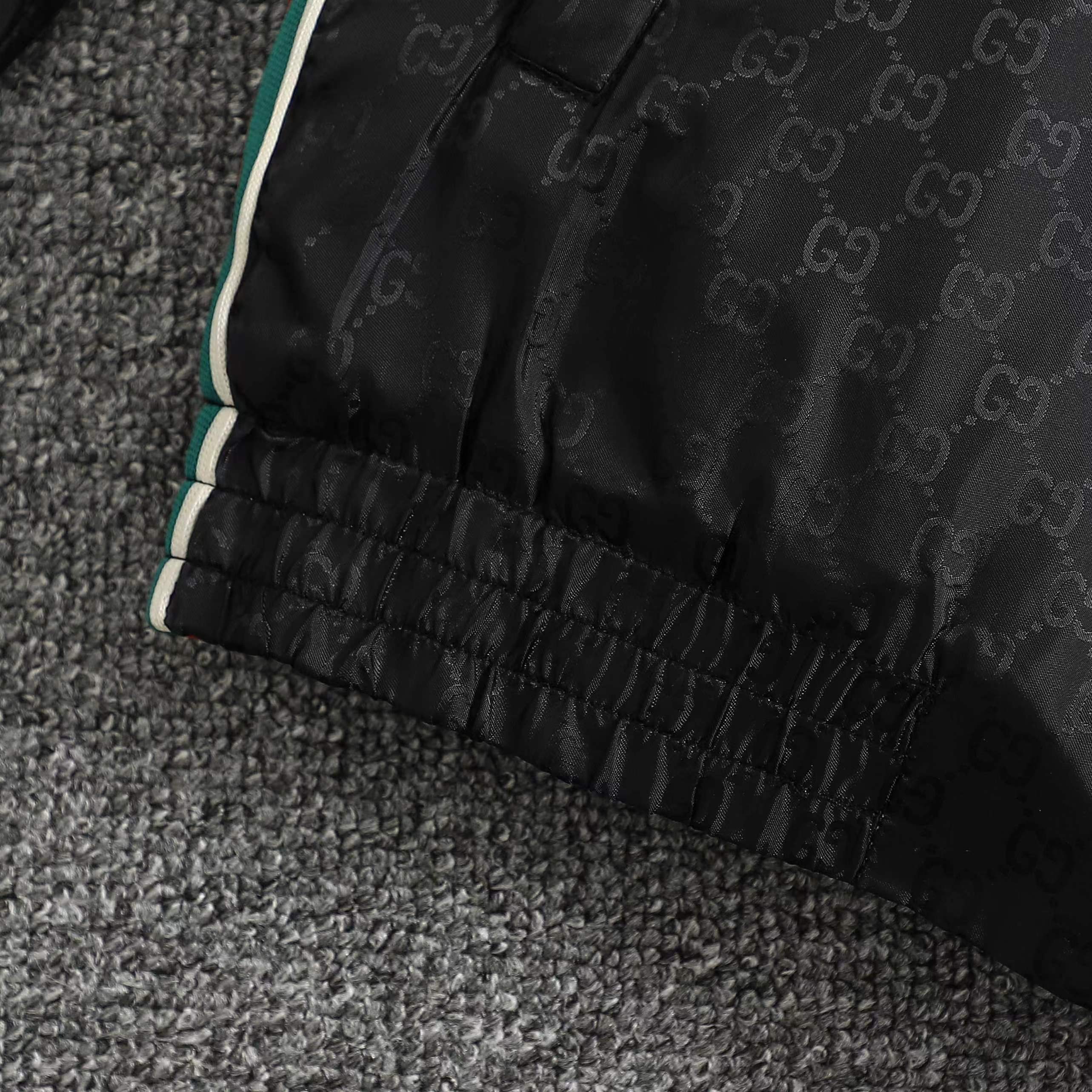 定制高密织丝光尼龙料 质感卓越 舒适贴肤 定制熠彩丝光提花科技棉锦 质感卓越 舒适贴肤 以曜石黑 灰为主基调 似夜幕下的星轨 邂逅铺满衣身的GG图案