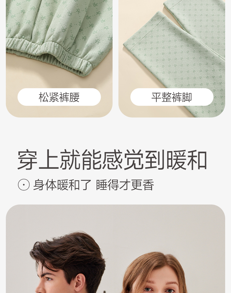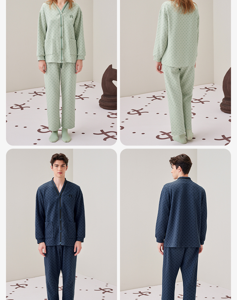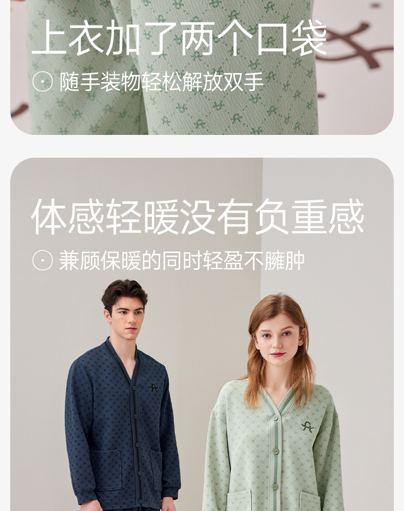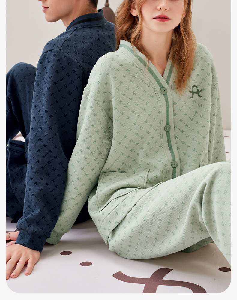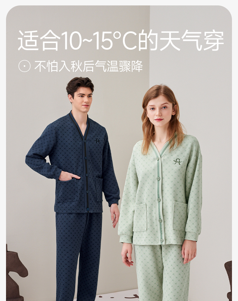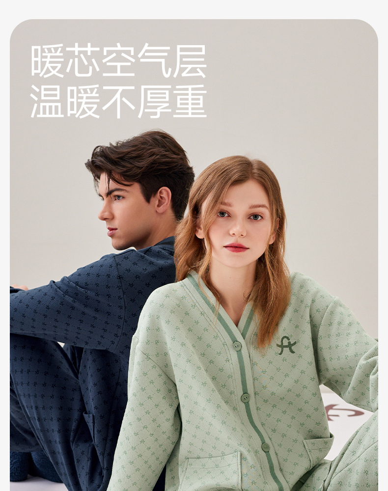 芬腾情侣睡衣秋冬空气棉夹层长袖纯棉套装女抗菌男士加大码家居服