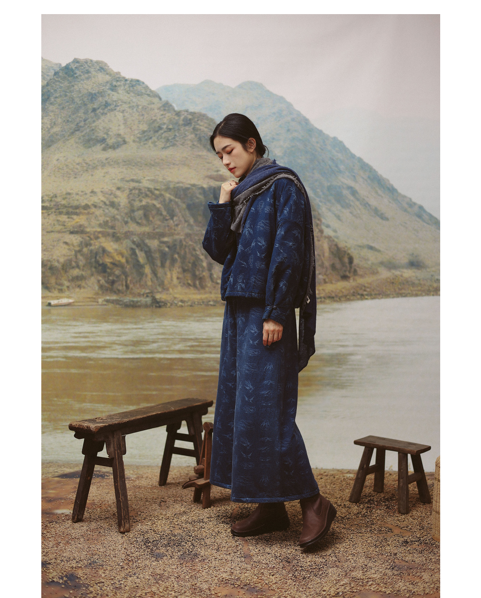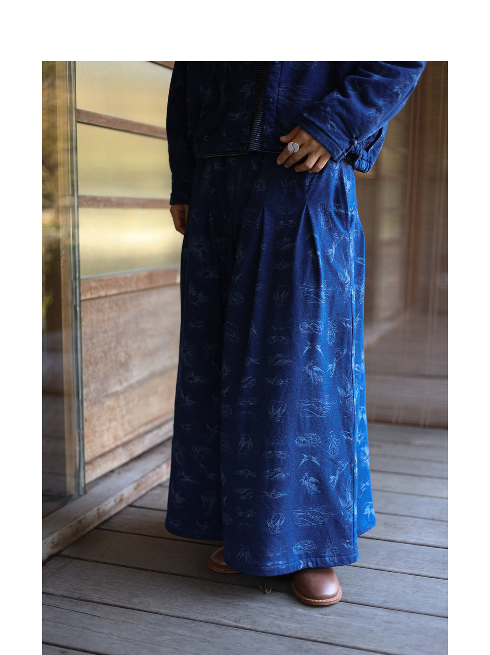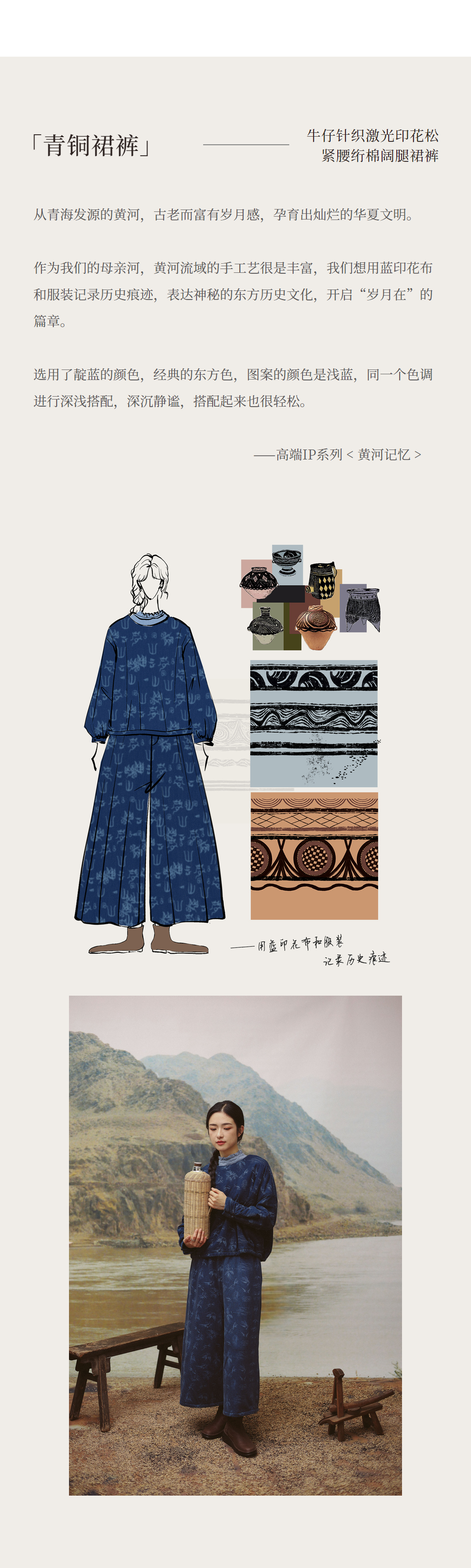 绽放999朵/【IP黄河记忆系列】牛仔针织印花松紧腰绗棉阔腿裤裙子