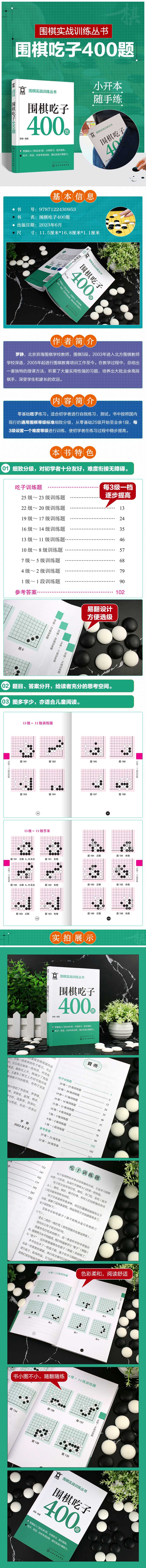 本套书适合围棋初学者进行自我练习,包含吃子、死活、对杀三个部分。本册书按照国内现行的通用围棋等级标准,对吃子训练题进行细致分级,从围棋零基础入门25级至业余1段,分为9个等级。题目上手简单,适合初学者。答案简单明了,不放过多的文字解释,读者读起来轻松。