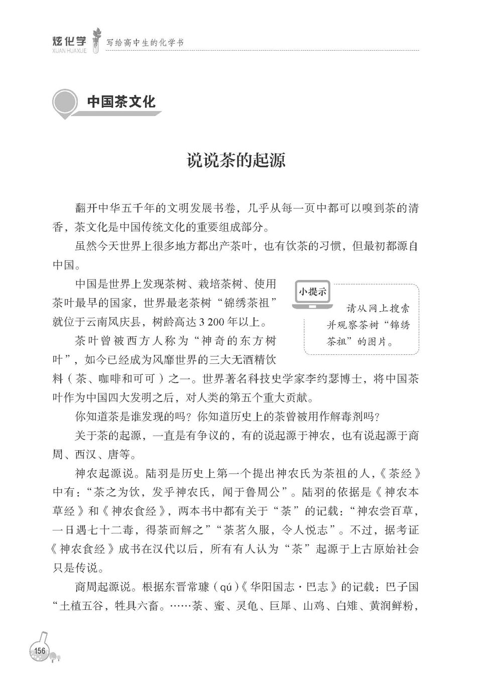 生活中处处皆学问,以化学的视角来看生活中的学问,既充满了乐趣,又开阔了视野!“学起于思,思源于疑”,化学学科本身充满了活力和未知性。“日常生活中的化学”将揭示油盐酱醋茶等这些生活中司空见惯的物质及相关现象中的化学知识,激发学生对周围世界格物致知的兴趣。“传统文化与化学”“化学发展与化学技术”将从“用其物”“晓其理”“造其物”三个阶段,介绍古代人对化学探索的史实、近现代化学家的重大发现,以及当代化学研究的前沿成果,引导学生树立唯物史观,增强民族自信心和自豪感,感受化学对人类文明发展做出的重大贡献。“传统文化与化学”将结合高中化学课程体系回顾传统文化中的那些化学知识和化学故事。