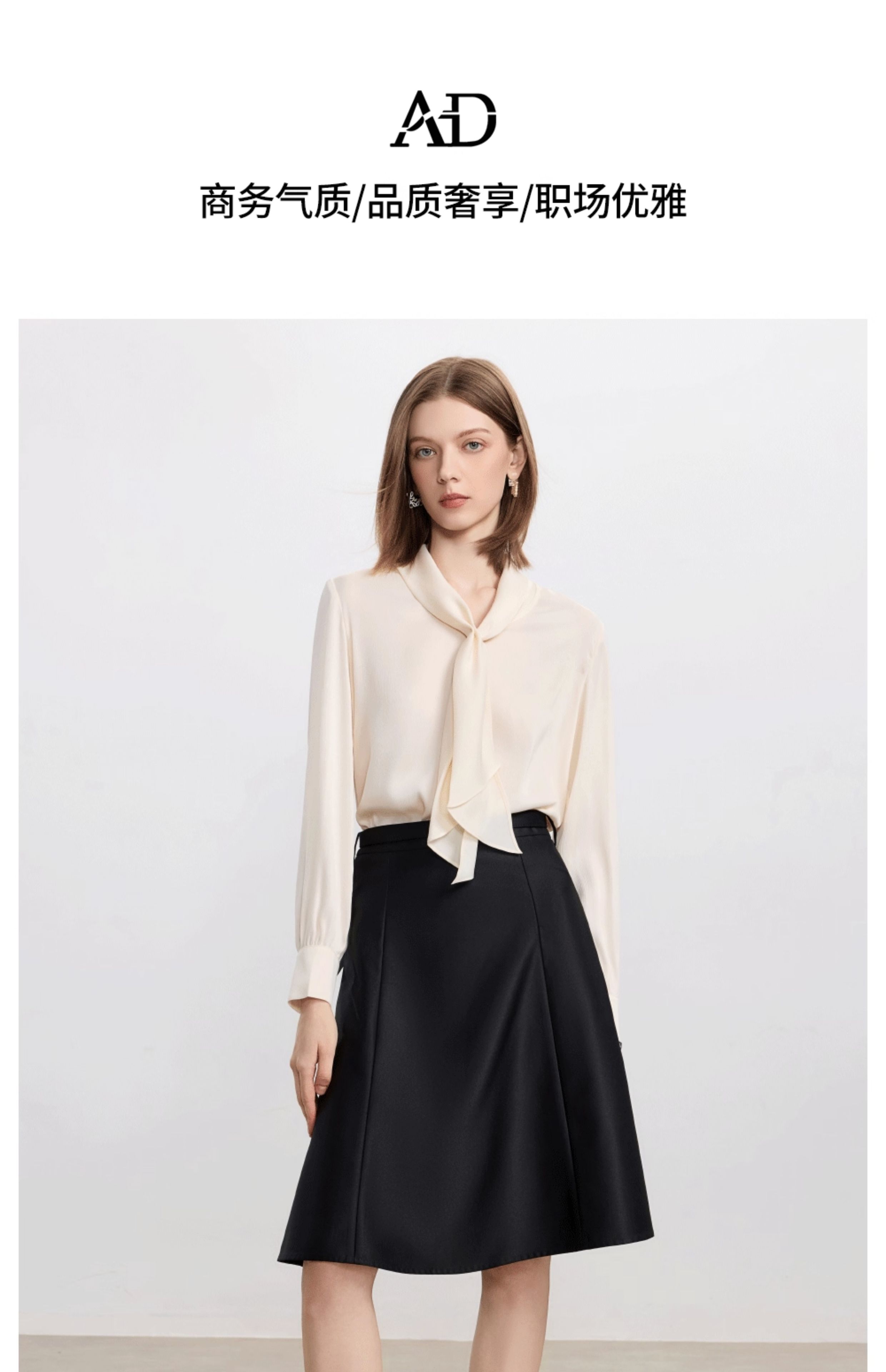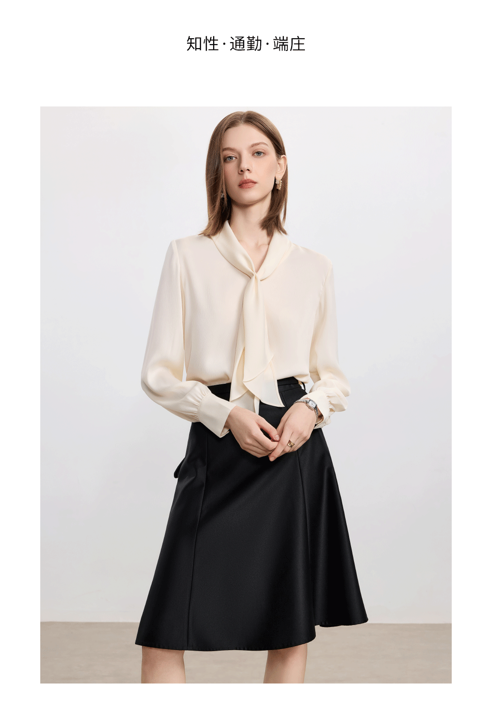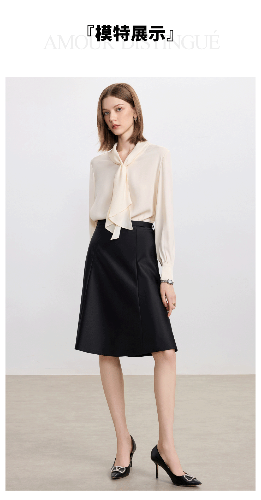 AD高端精致衬衫套装女2025新款正式场合轻奢飘带长袖衬衣黑色皮裙