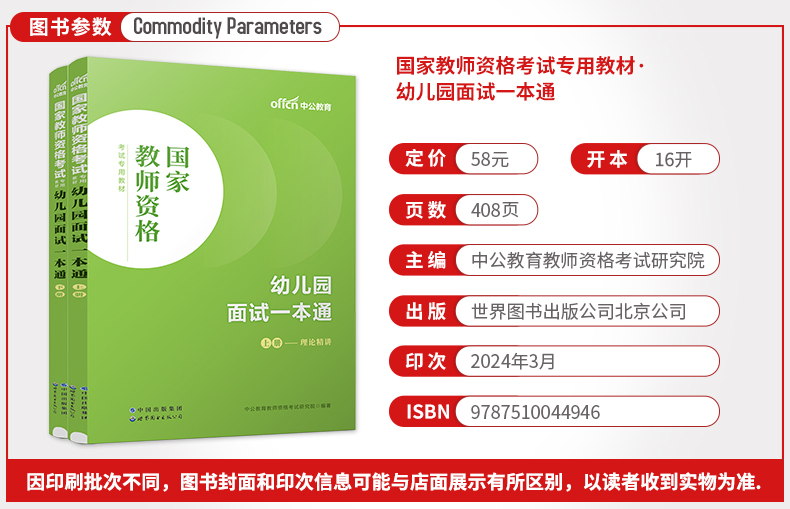 《中公版2024国家教师资格考试专用教材:幼儿园面试一本通》是一本专门针对国家教师资格考试幼儿园面试的教材,全书分为上下两册。上册包括第一至十章,分别为第一章面试概述、第二章面试基本礼仪、第三章回答规定问题指导、第四章故事活动试讲与技能指导、第五章儿歌活动试讲与技能指导、第六章弹唱活动试讲与技能指导、第七章绘画活动试讲与技能指导、第八章手工活动试讲与技能指导、第九章游戏活动试讲与技能指导、第十章答辩。下册包括第十一、十二章,分别为回答规定问题100例、试讲及答辩演练30篇。回答规定问题为考生提供了作答范例;试讲及答辩演练,给考生提供了六类试讲题本、教案、逐字稿及答辩题目及范例,供考生学习参考。整体来说,本教材条理清晰,结构严谨,深入浅出地向考生剖析面试各个要点,使考生能透彻地理解面试精华,从容应考。