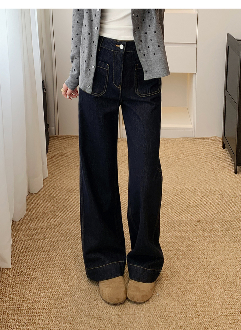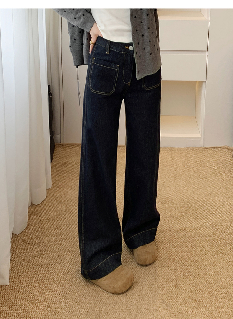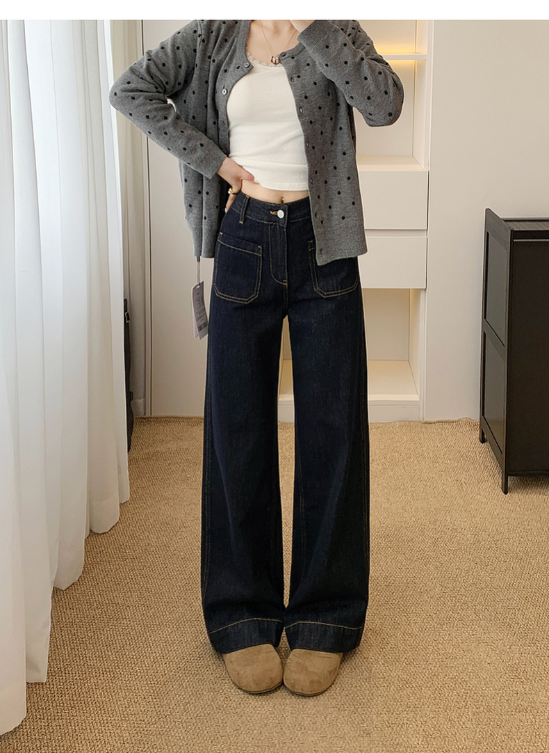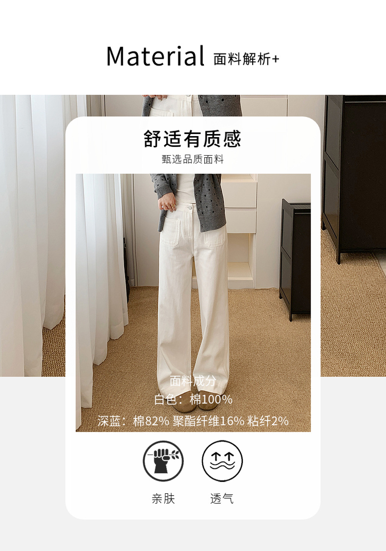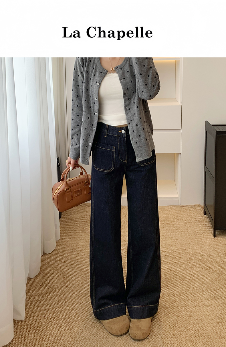 <新春福利>【拉夏贝尔/La Chapelle高腰明线阔腿牛仔裤】舒适主义~垂坠/挺括】宽松设计感百搭显瘦直筒长裤