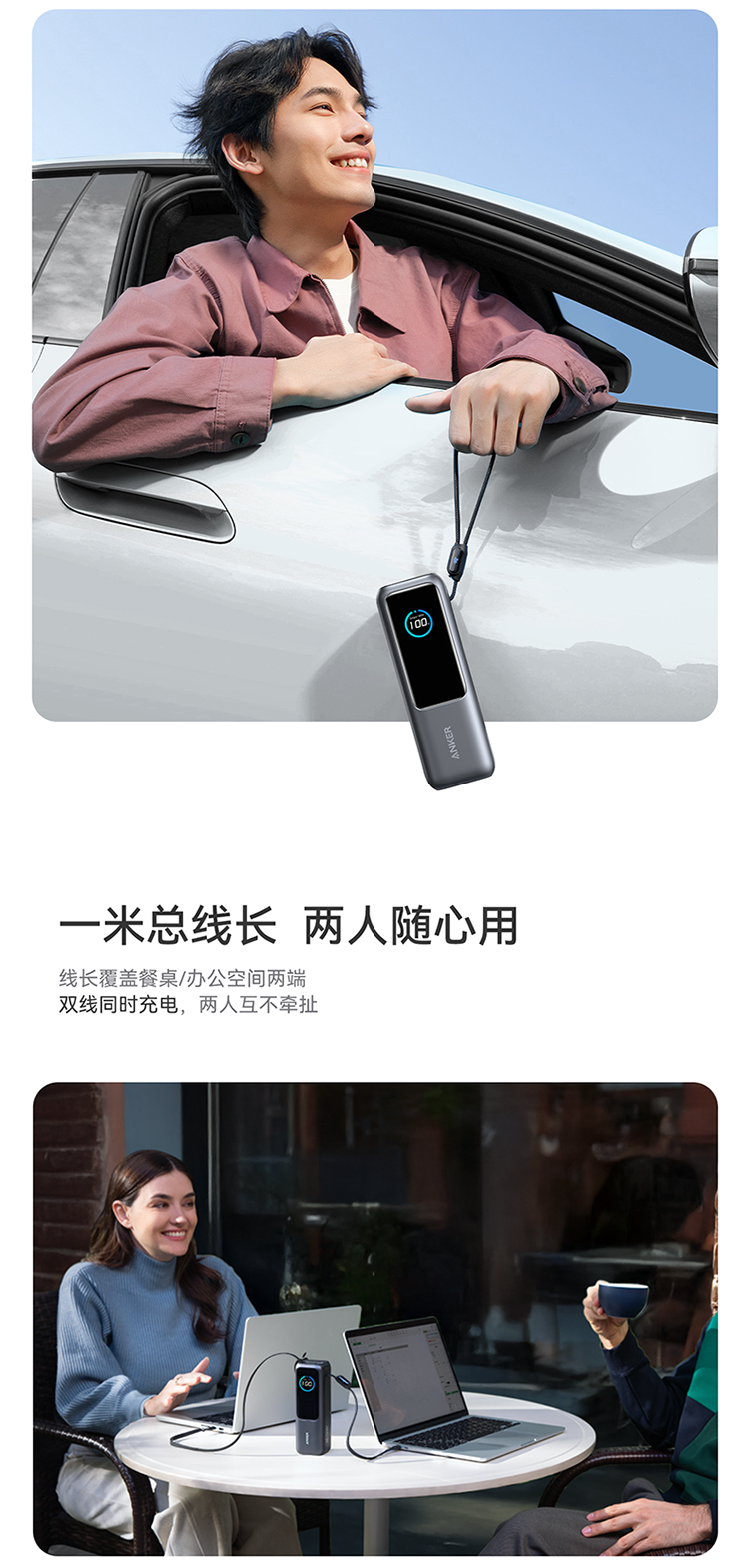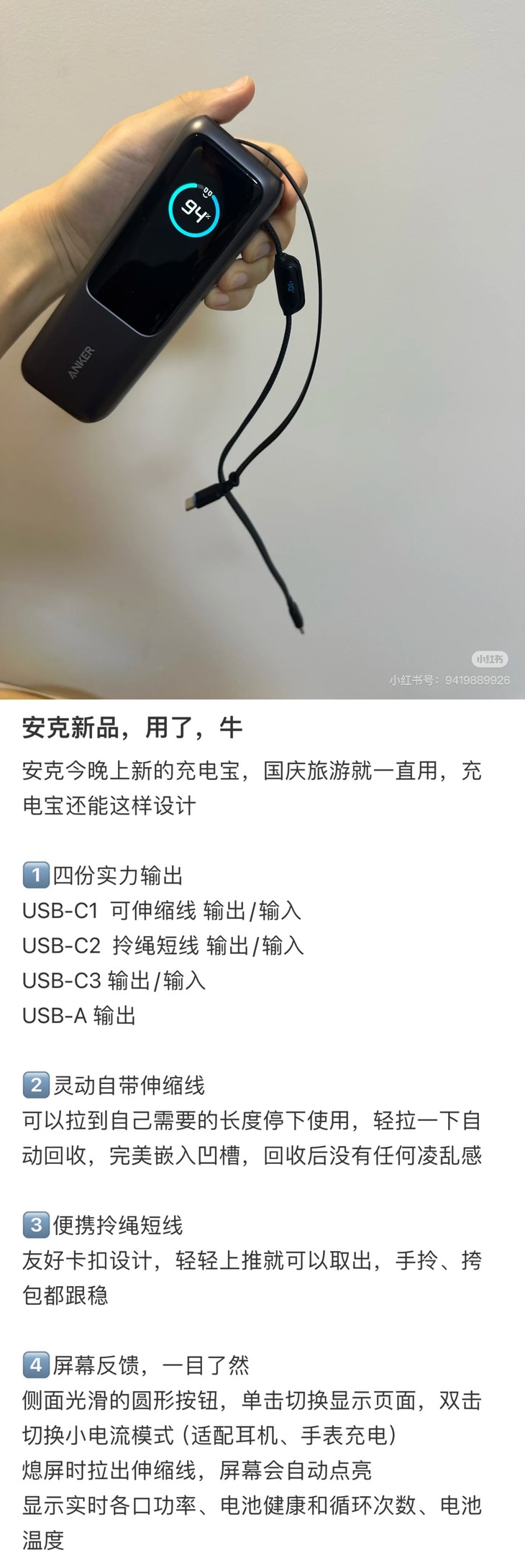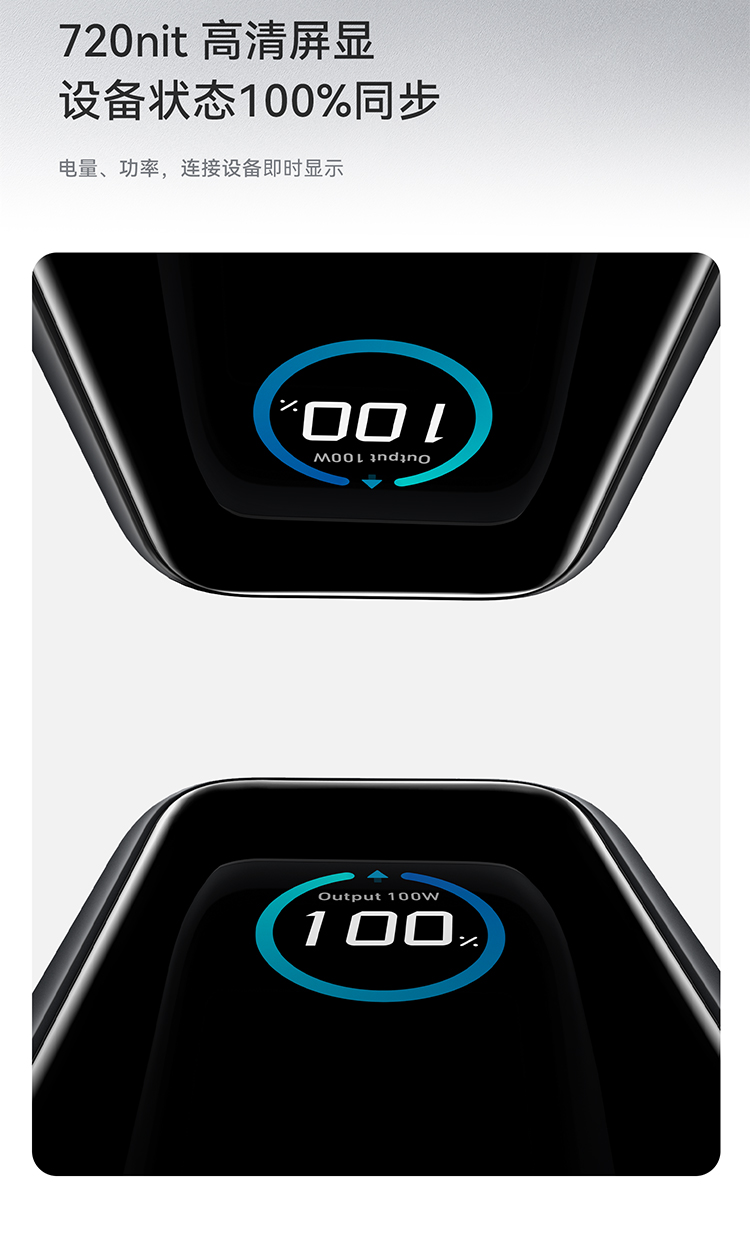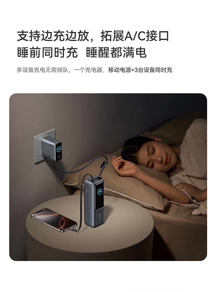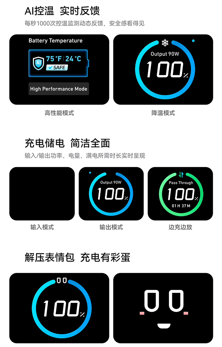 更厉害的是,还支持边充边放,可以在睡前同时为多个设备充电,睡醒后能让充电宝和3台设备同时满电,出去旅游都不用带一堆充电器和排插了!它的另一大亮点是自带720nit高清屏显,能即时显示电量、功率和连接设备情况,随时掌握设备状态,用电情况一目了然。同时,它拥有AI控温技术,每秒进行1000次控温监测并动态反馈,安全感清晰可见。