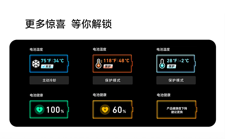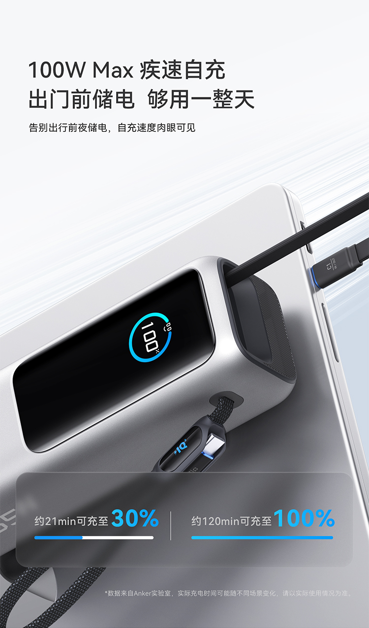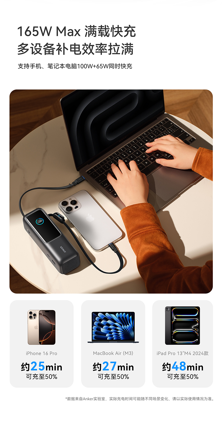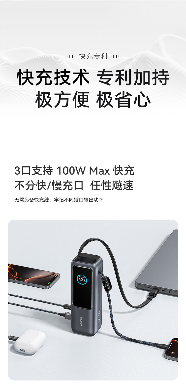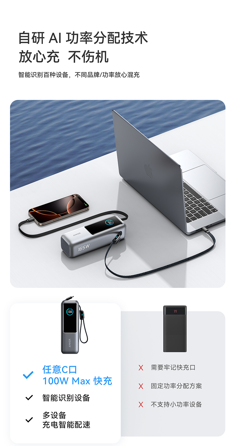 能量舱移动电源和普通的不一样,它采用的是多重安全堆栈搭配车规级电芯,让它在安全系数、能量密度和充放性能上全面领先,实现3天一充、3年如新的稳定表现,使用起来更放心。在充电效率方面表现更是出色,支持165WMax满载快充和100WMax自充,能让设备和自身快速满电,大大节省时间。而且3个接口都支持快充,还具备智能功率分配功能,既能保证效率,又能保障安全。