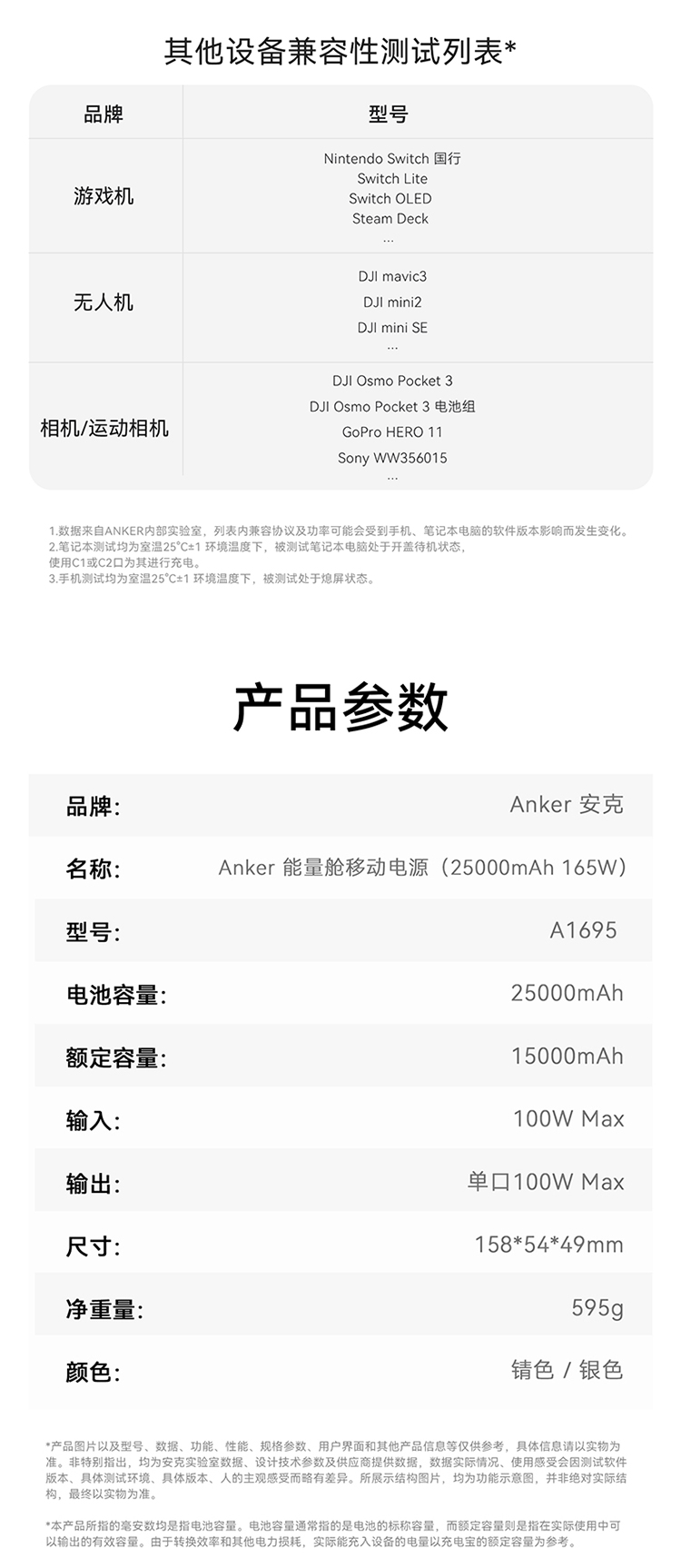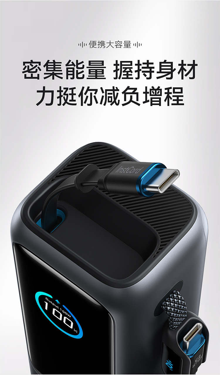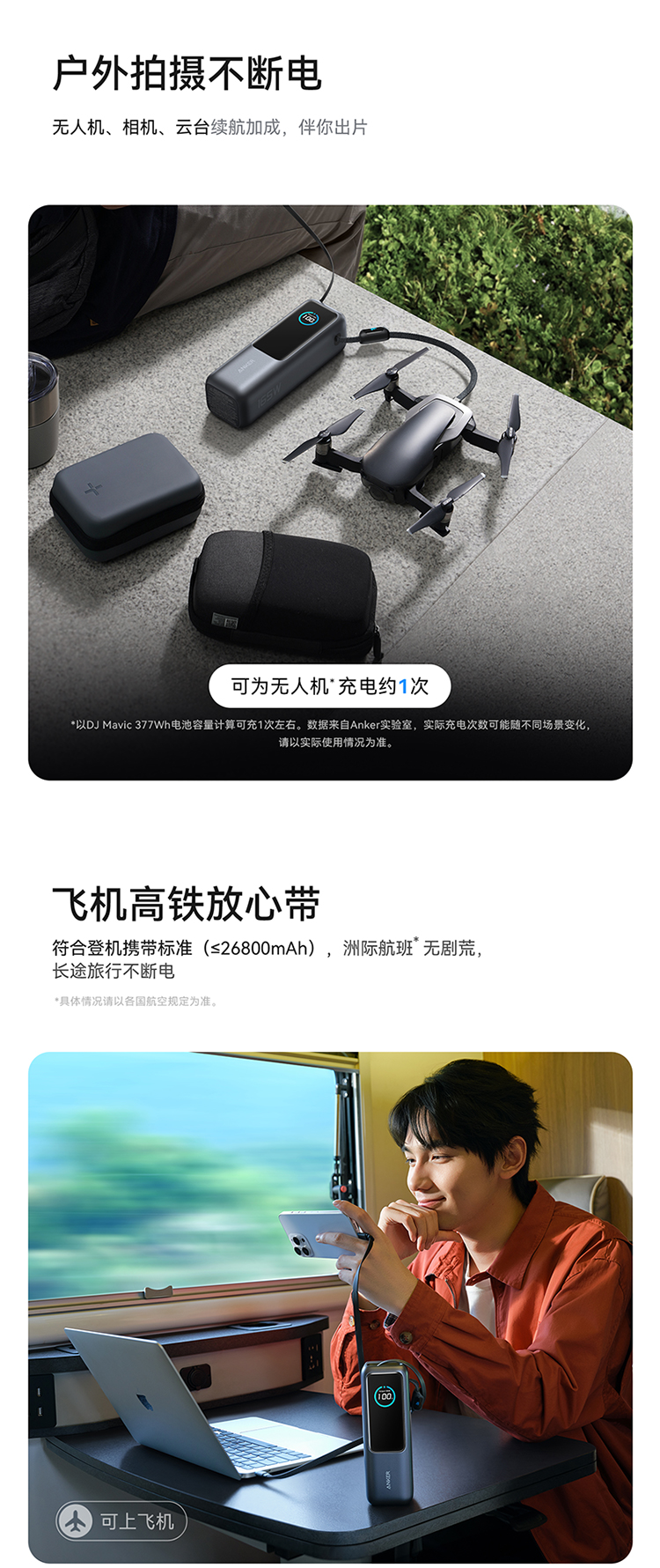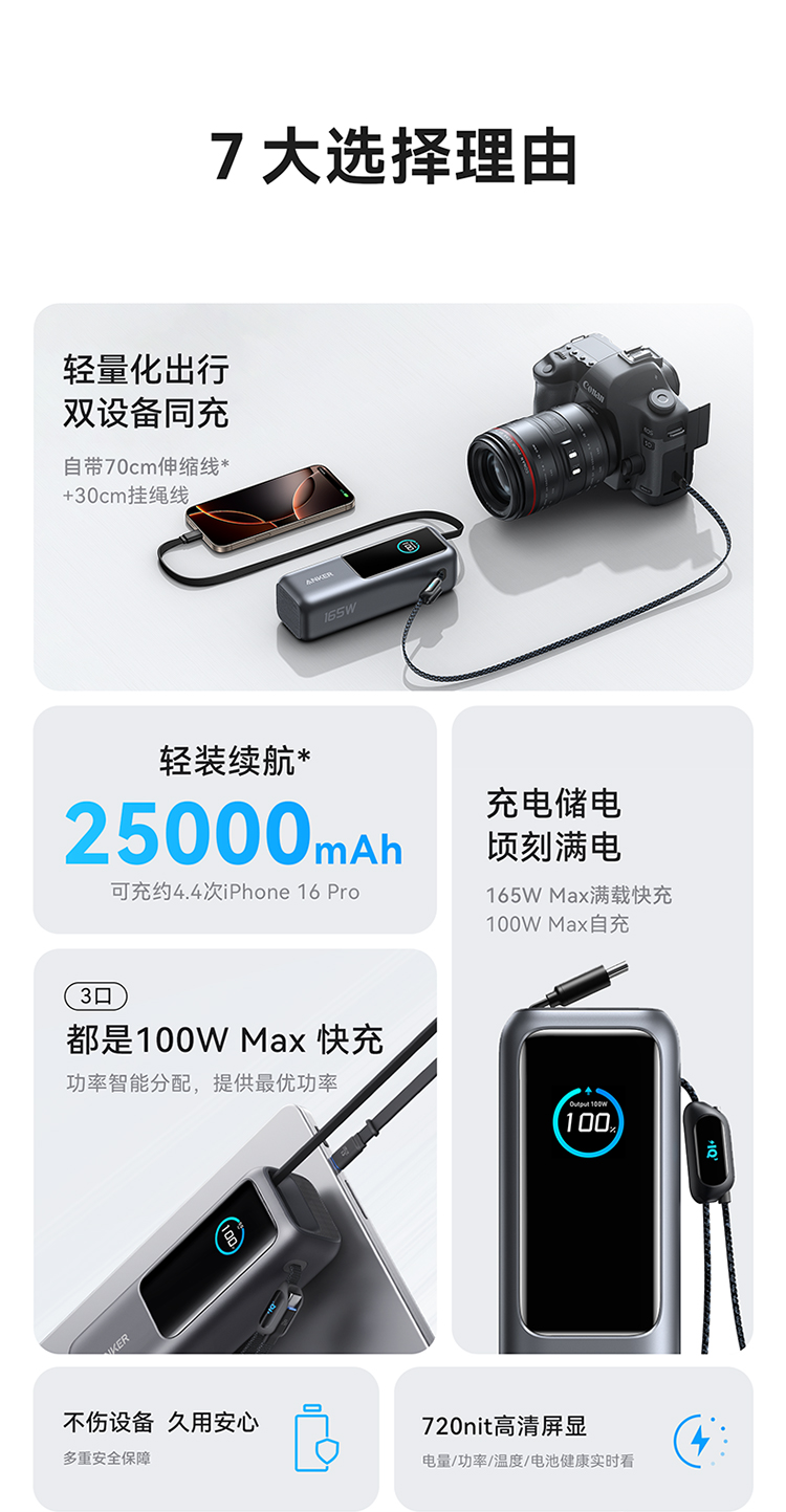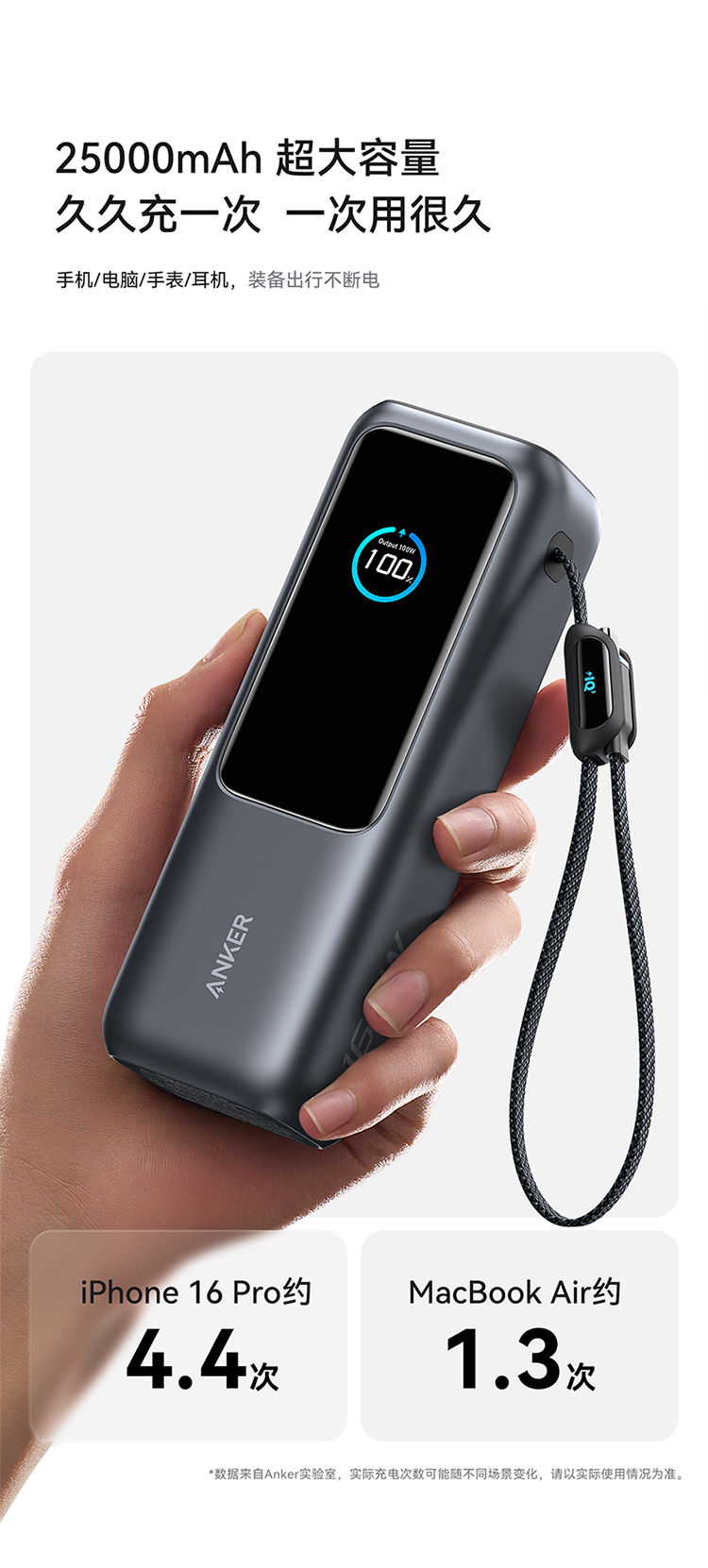 能量舱移动电源在设计上充分考量了出行的便捷性,轻量化设计,有70cm伸缩线和30cm挂绳线,轻松满足同时为手机相机或笔记本充电。25000mAh的大容量电池更是续航的坚实保障,可为iPhone16Pro充电约4.4次,再也不用为电量焦虑,3c认证坐飞机也不会卡在安检啦!兼容性也是绝绝子,各种主流设备,手机、电脑、平板和手表,一个就够,拓展的A/C接口,对于户外拍摄爱好者来说,更是得力助手,能为无人机、相机、云台等设备续航加成,确保拍摄不间断!