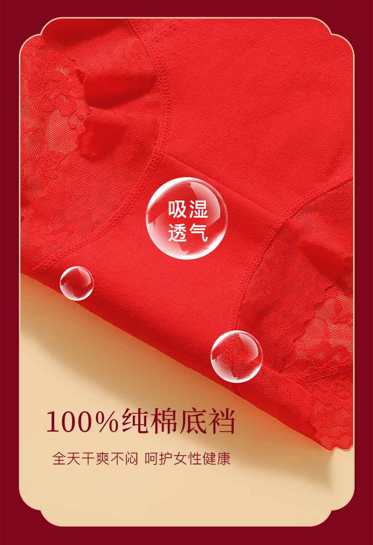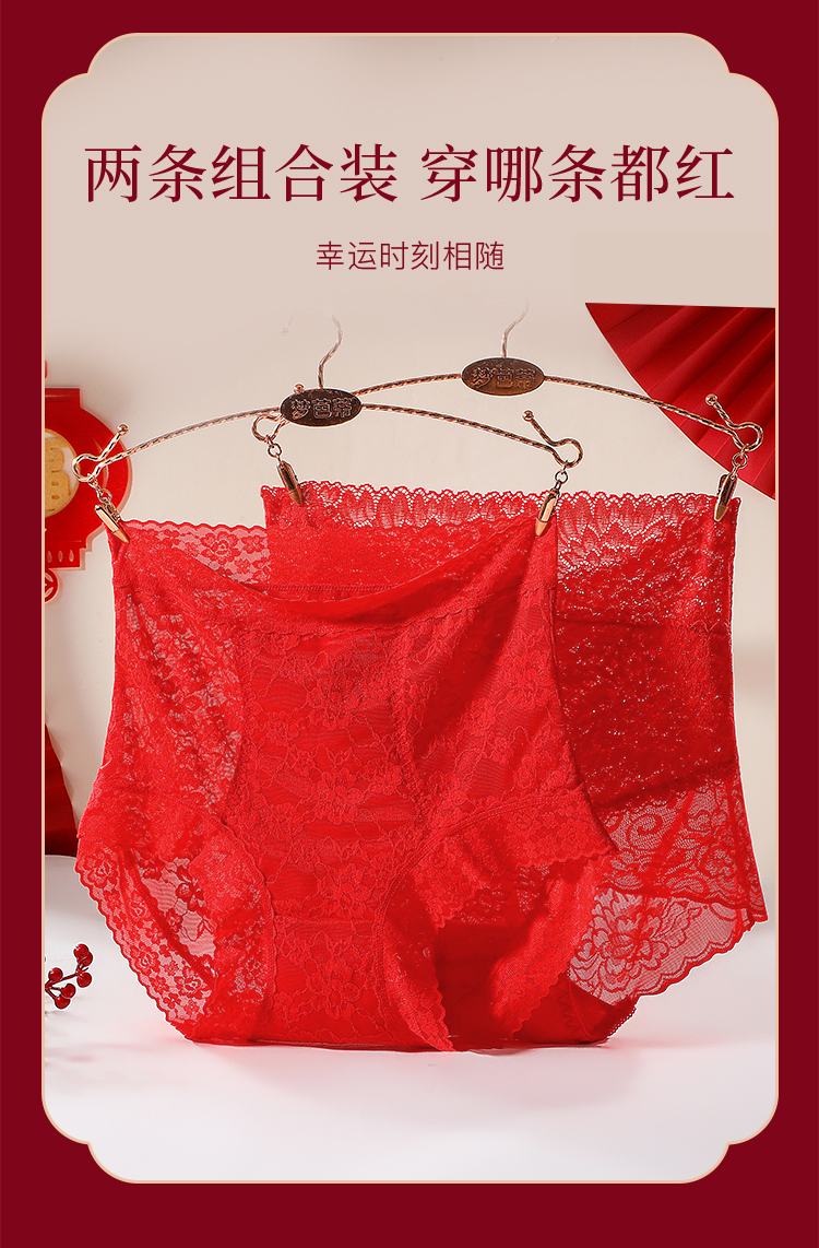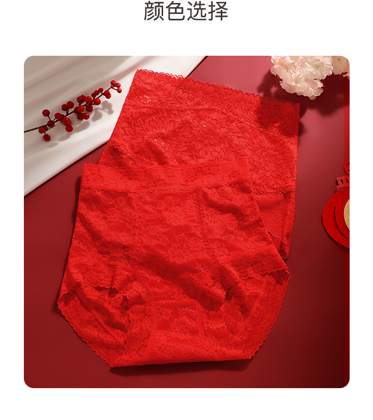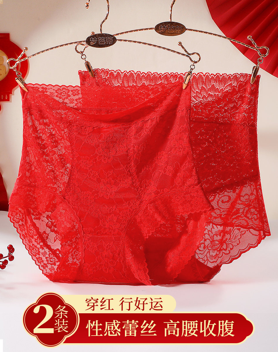 【2条装】本命年大红色新婚性感蕾丝高腰收腹内裤女100%棉裆花朵红运内裤
