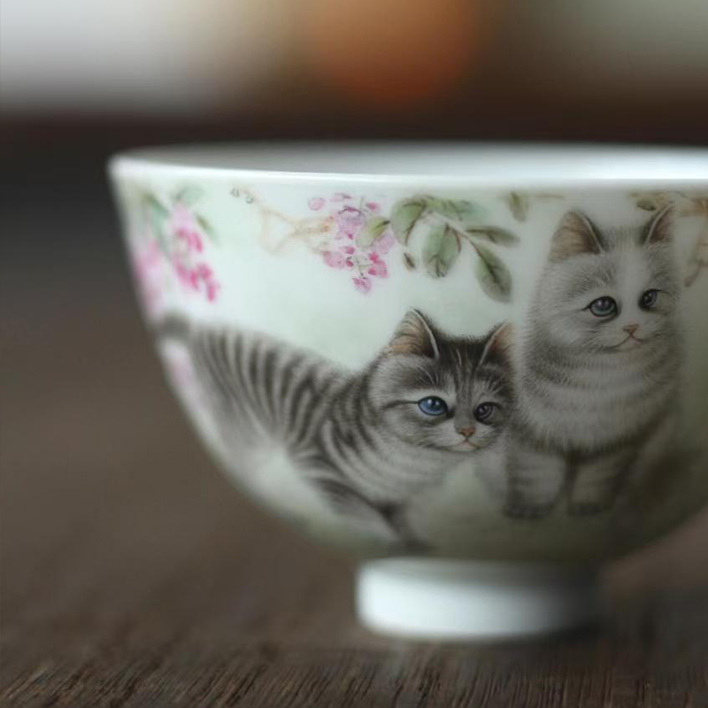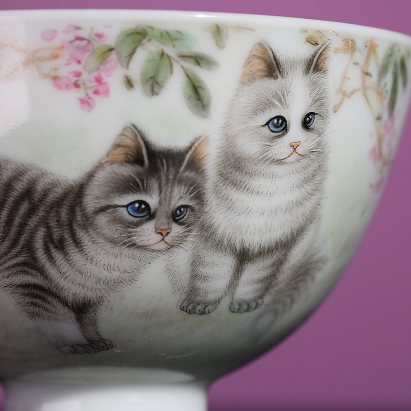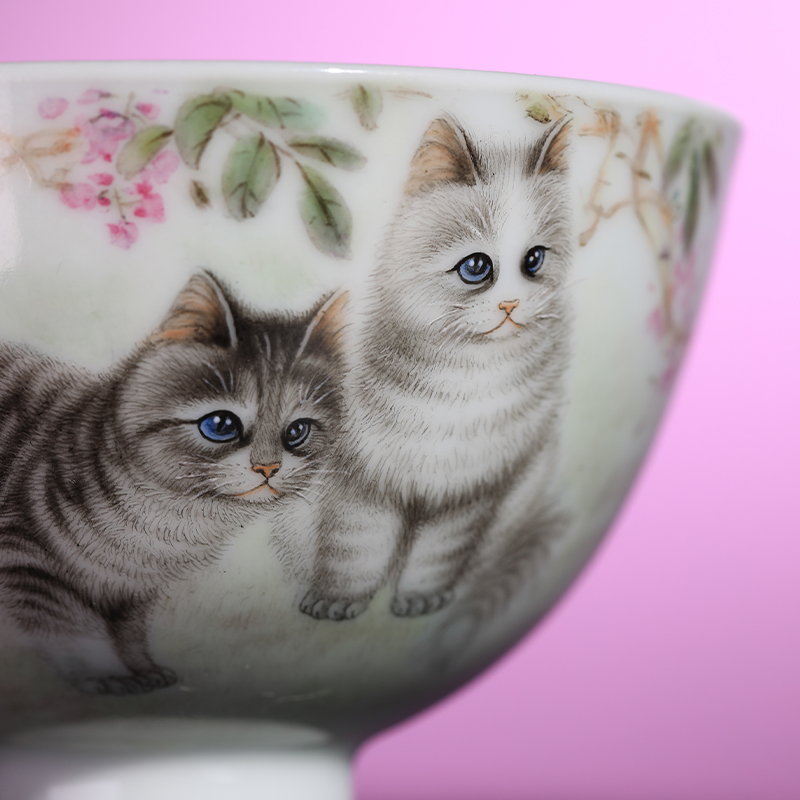 一儒堂粉彩猫咪鸡心杯