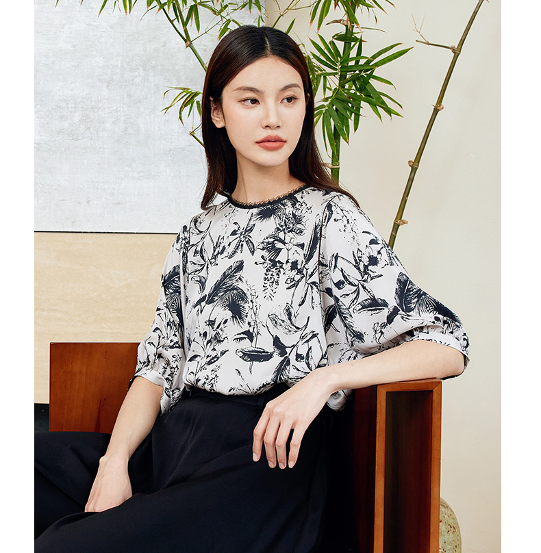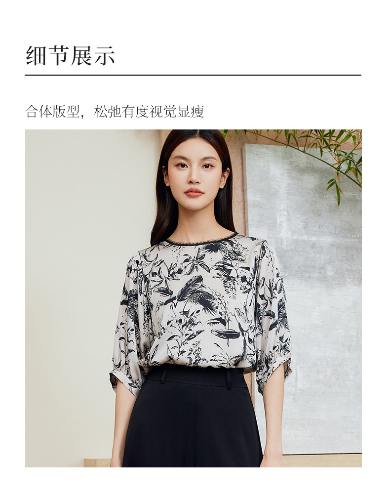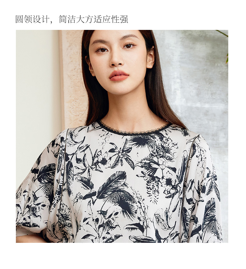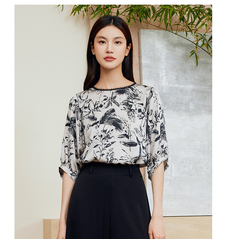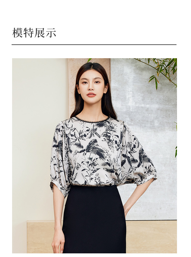 玳莎蝙蝠袖真丝小衫女2024夏季新款复古水墨印花花边圆领上衣衬衫 EB31202