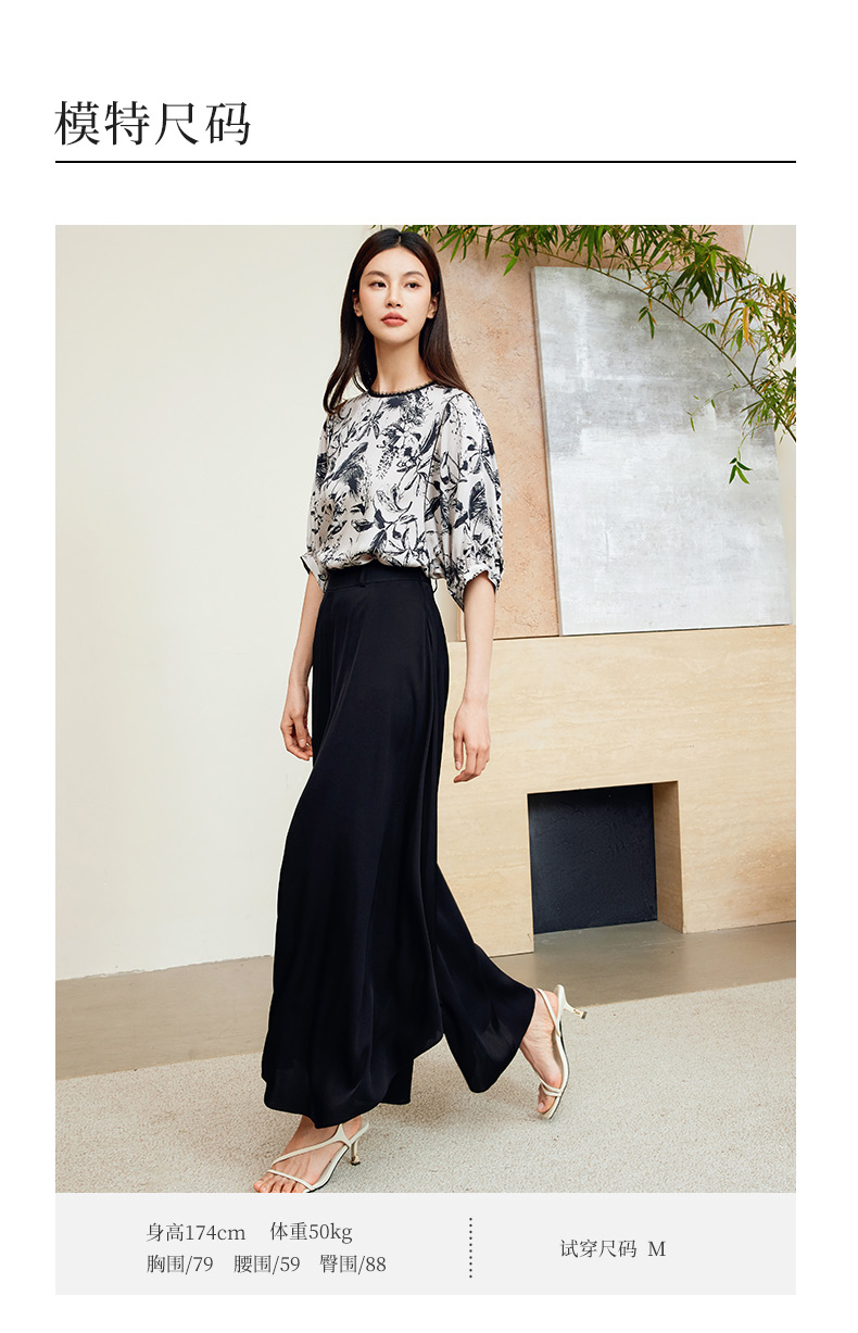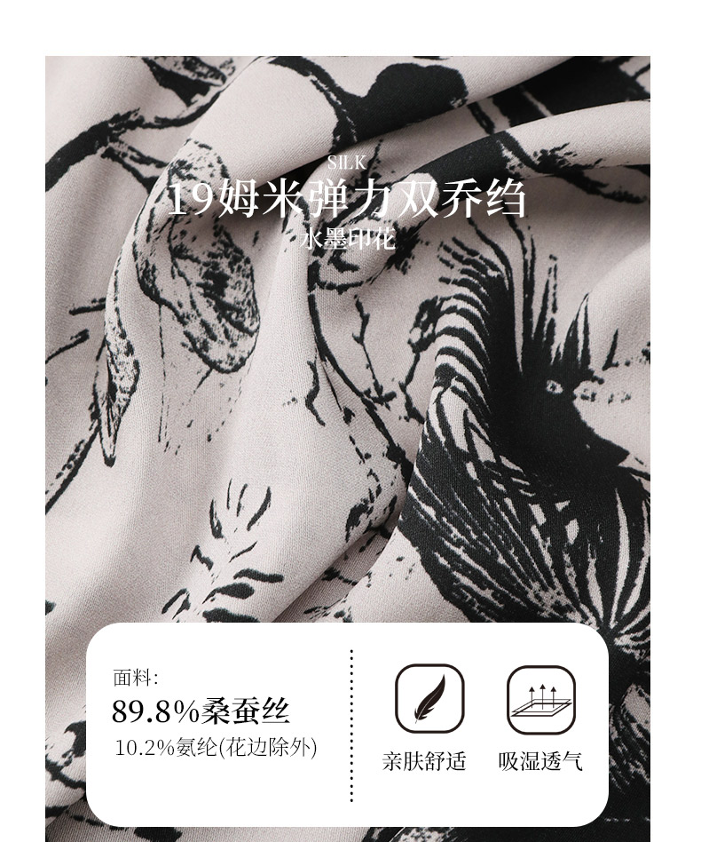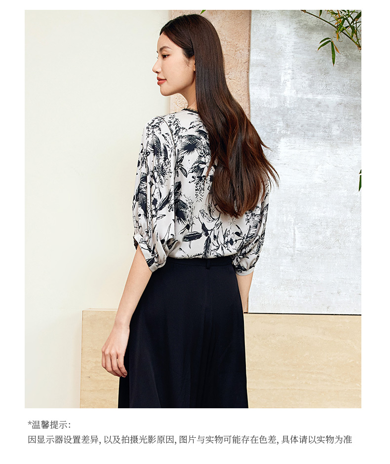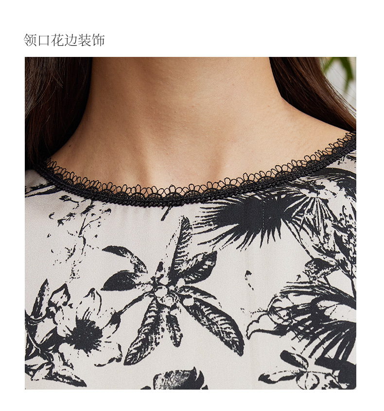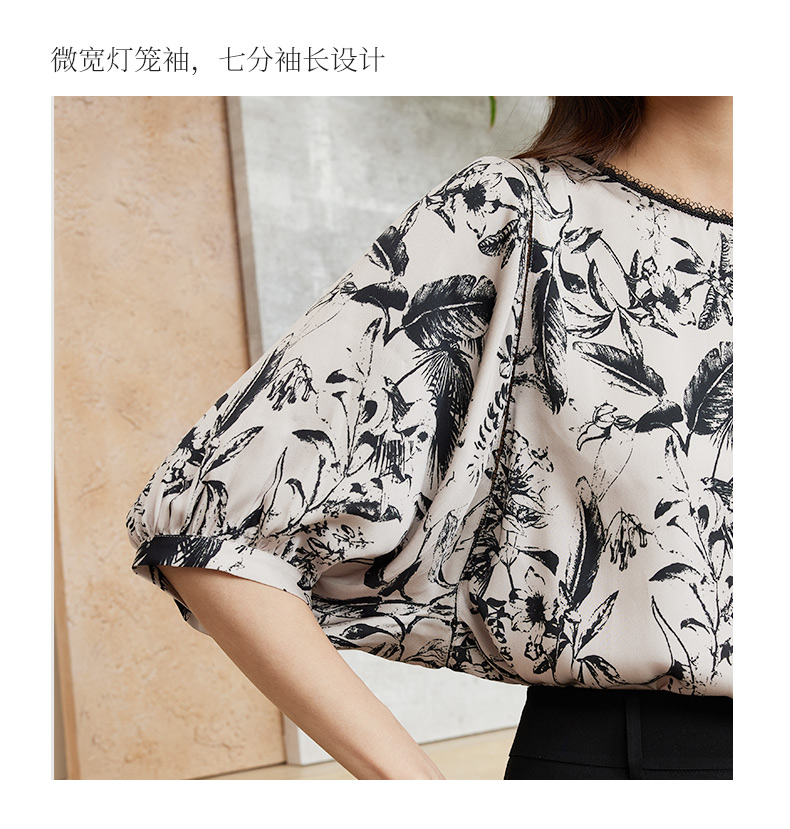 玳莎蝙蝠袖真丝小衫女2024夏季新款复古水墨印花花边圆领上衣衬衫 EB31202