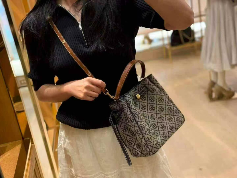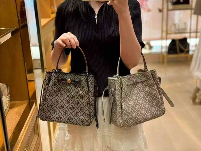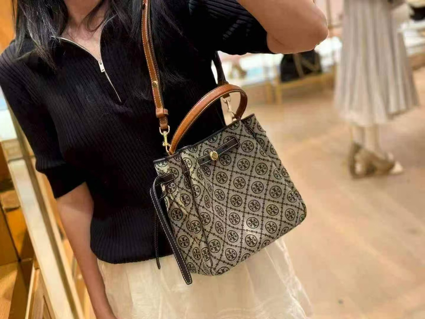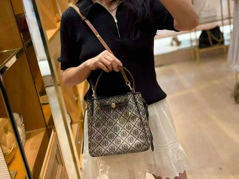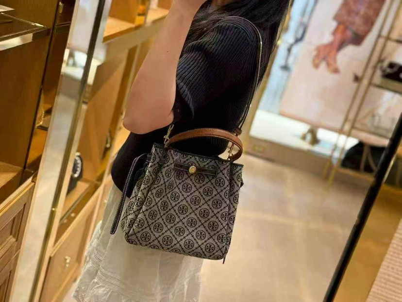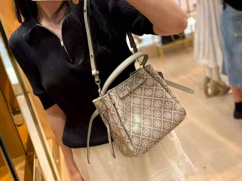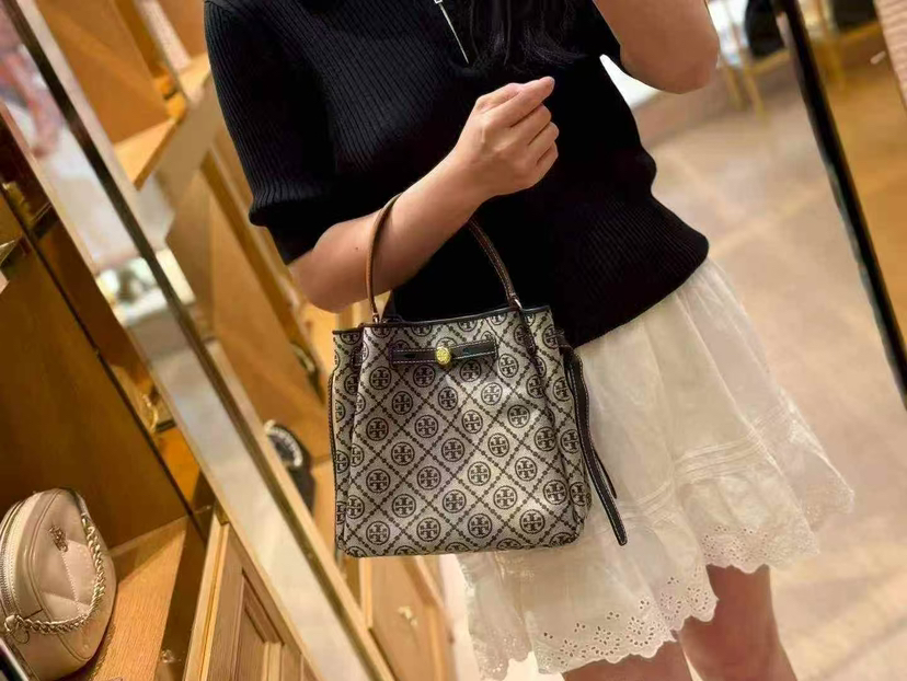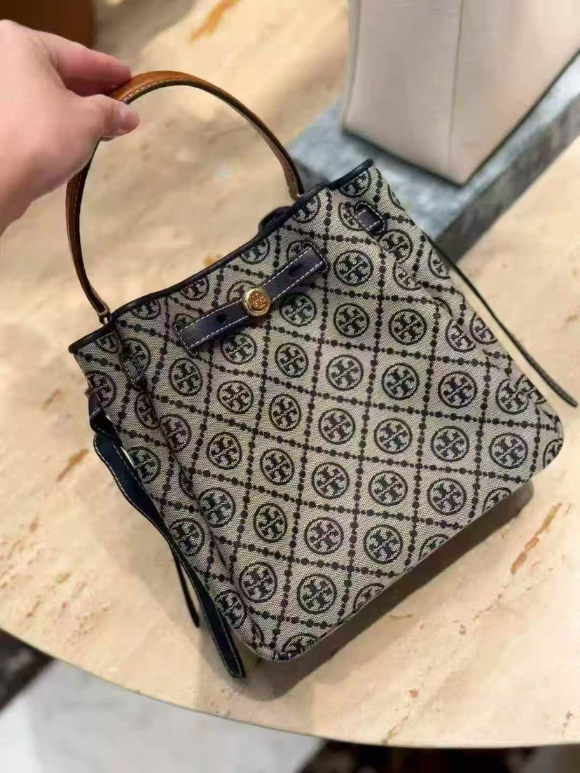 折扣🉐2980¥🇺🇸直邮,各大明星都在背〰️Tory Burch专柜Romy小号水桶包,藏蓝色奶灰色老花logo拼皮