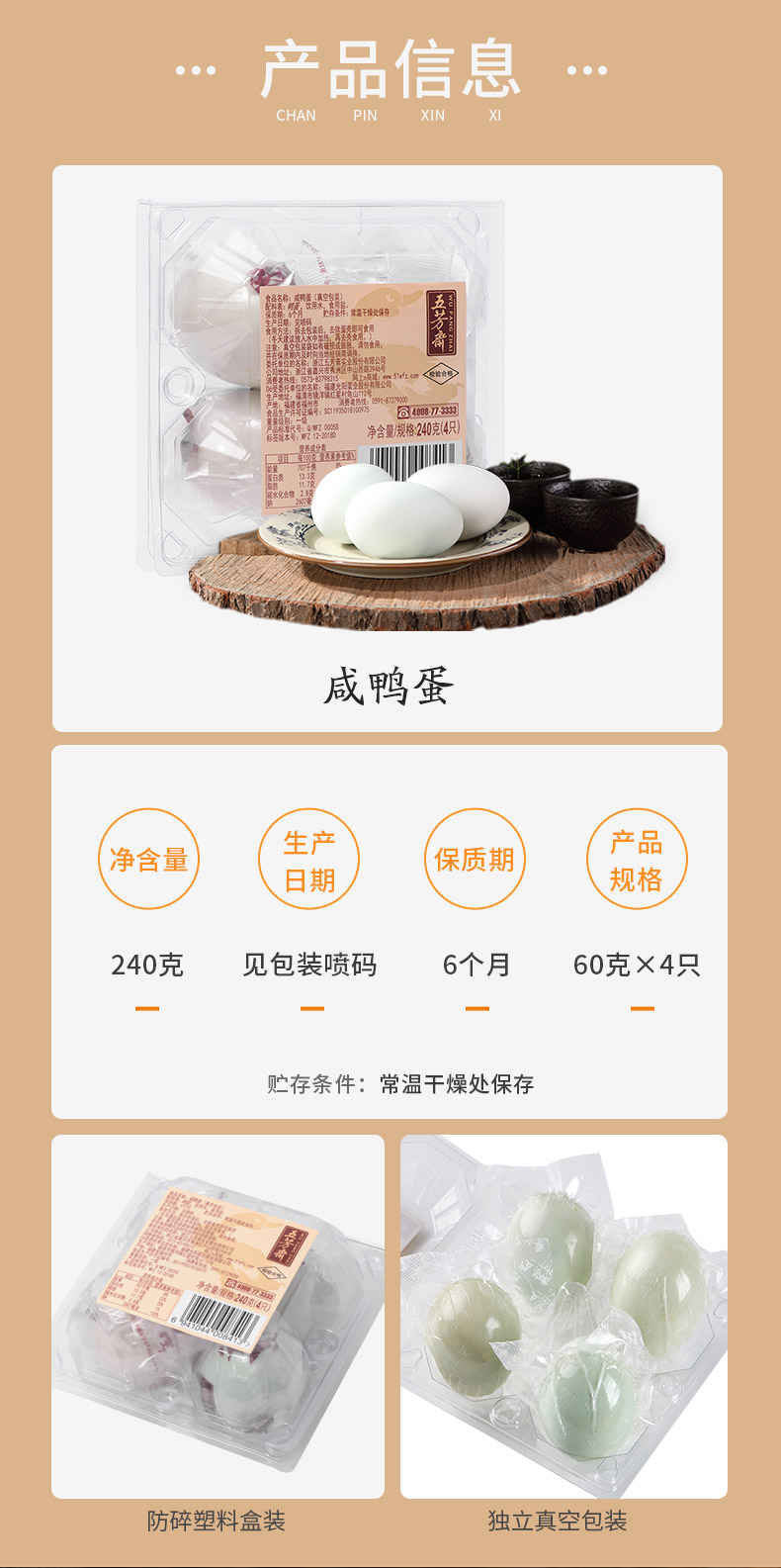 【4盒装】五芳斋 咸鸭蛋流油咸蛋盐鸭蛋 60克*4只*4盒