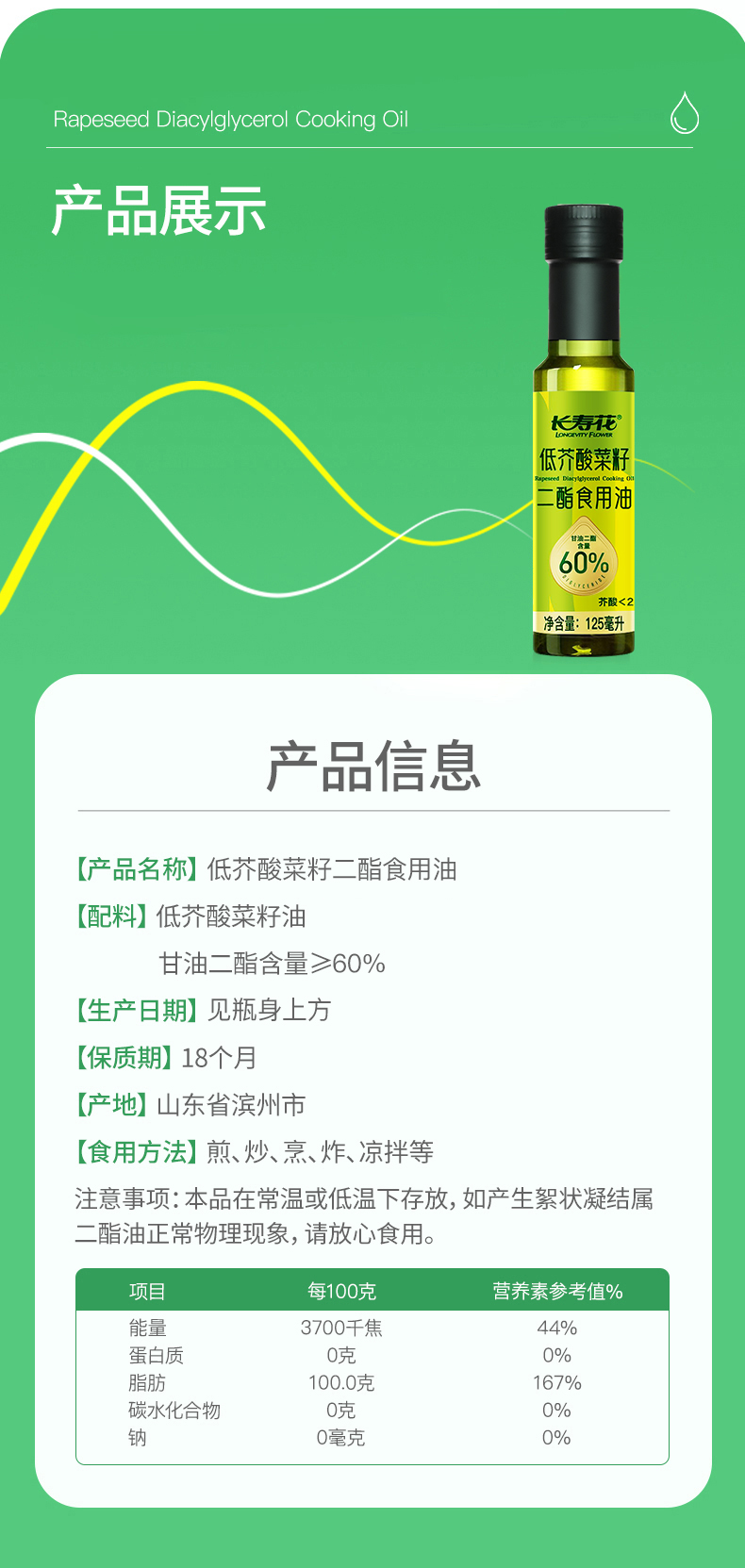 长寿花轻酯甘油二酯食用油60%DAG含量 125ml低芥酸菜籽二酯油