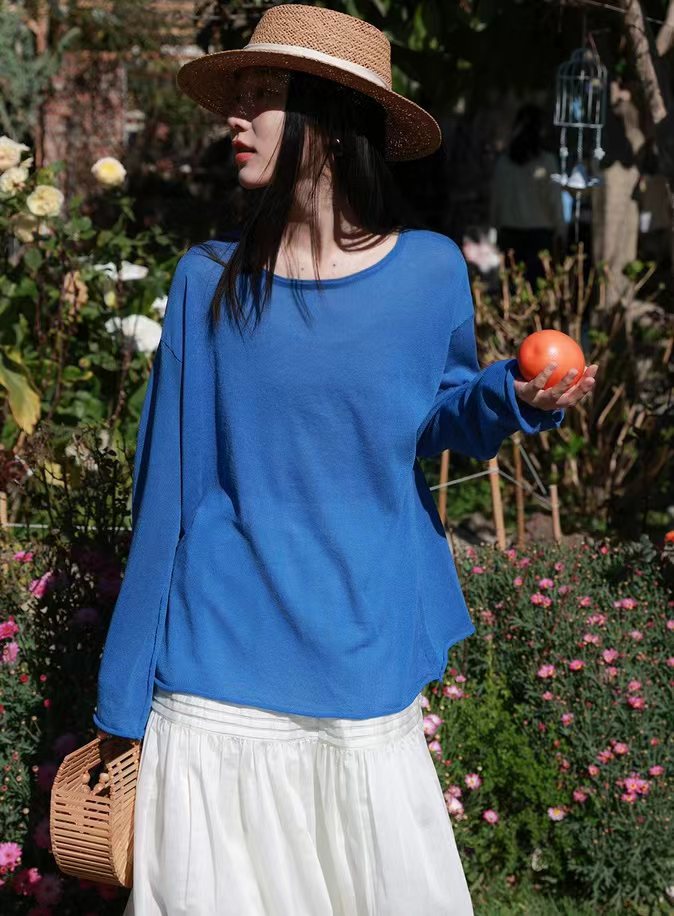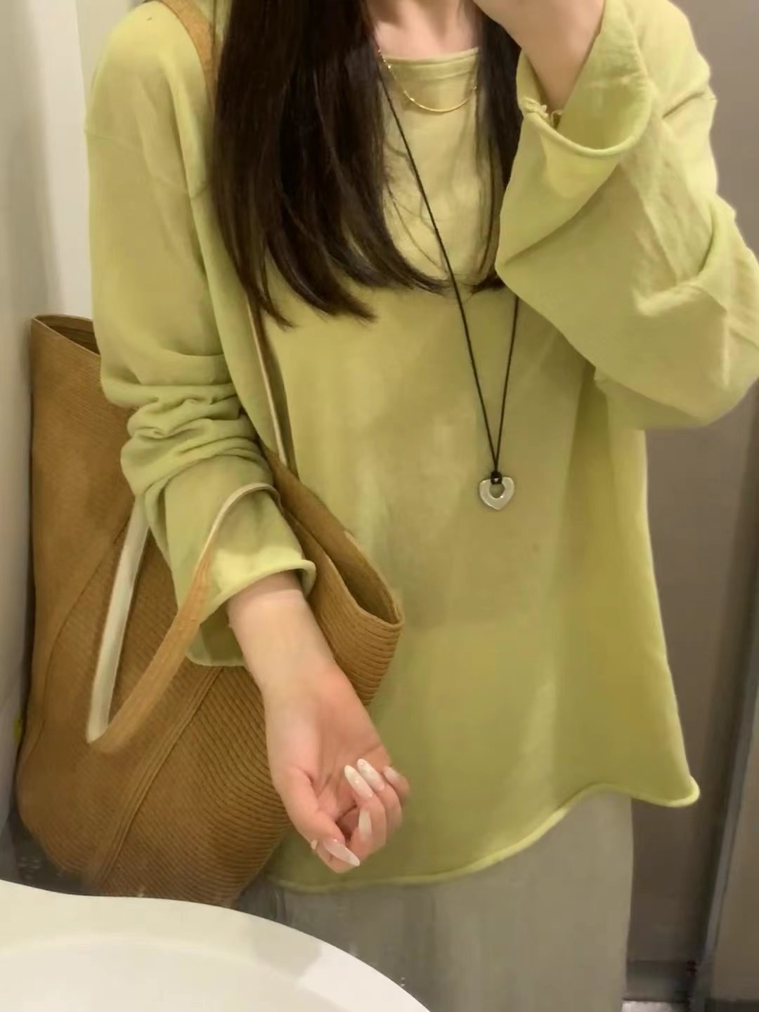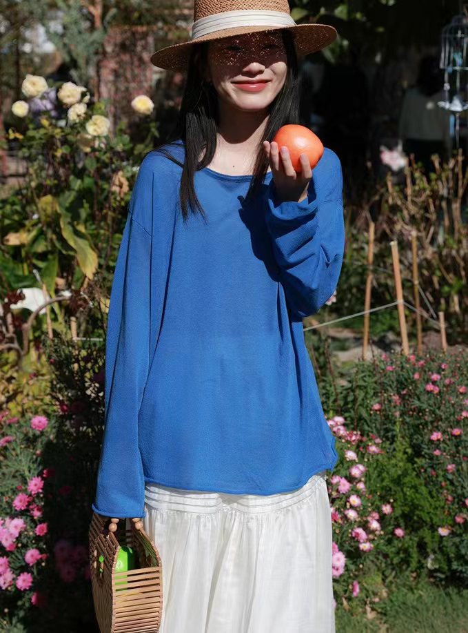 显白柠檬黄+克莱茵蓝~莱赛尔天丝亚麻卷边长袖T恤针织防晒罩衫,很显白的一款长T~柔和的色调显白且不挑肤色,天丝亞麻的面料质地轻薄透汽,打造轻盈呼吸感!透气不闷汗,自在舒爽,软糯亲肤,5G入春夏無压力,上身自带慵懒飘逸感,不管单穿还是叠穿都能轻松出彩。圆领设计,不紧绷不卡脖子,刚好露出纤细的锁骨线条,弱化颈部线条感,对圆脸和短颈星人友好。边缘做了自然的卷边处理,没有生硬的缝线,带着手工感的毛边肌理,慵懒又随性,避免了常规圆领的呆板。宽松长袖的设计,不贴手臂不勒肉,能巧妙修饰拜拜肉,而且还能防晒。袖口同样做了卷边,和领口、下摆的细节呼应,整体风格统一又jing致,不会显得过于刻意。落肩+微阔的H型版型,藏住腰腹和手臂的小肉肉,对各种身材都很包容。衣长刚好盖过胯部,既能修饰腰线,又不会压个子,小个子也能穿出利落感。下摆也做卷边设计,打破了常规下摆的平直感,视觉上更显随性时髦!