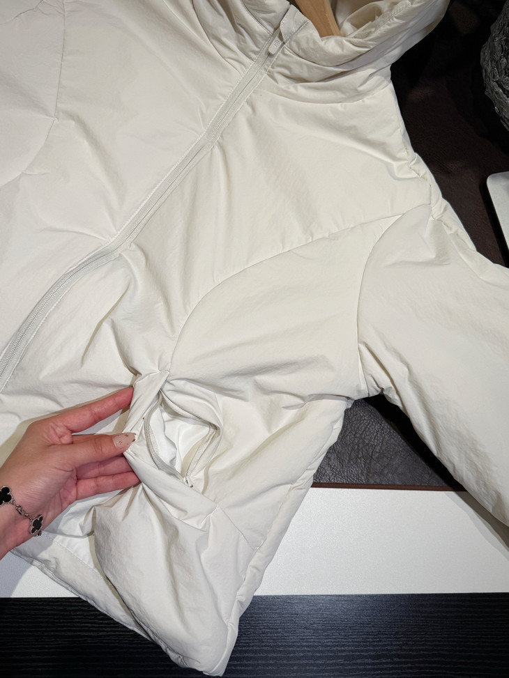 袖子和侧前身弧线结构拼接,立裁结构落肩穿起来就相当于无阻隔连肩。所以就算是棉服但是一点不会有臃肿感