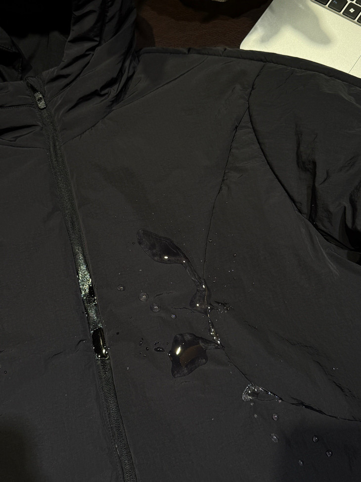 不含氟!!它可以将防风防水与透气弹性完美结合,手感顺滑细腻,是那种自带山丘肌理感的尼龙布,表面经过特殊工艺处理即使突遇风雪也能保持内里干爽,水珠完全不会渗。
