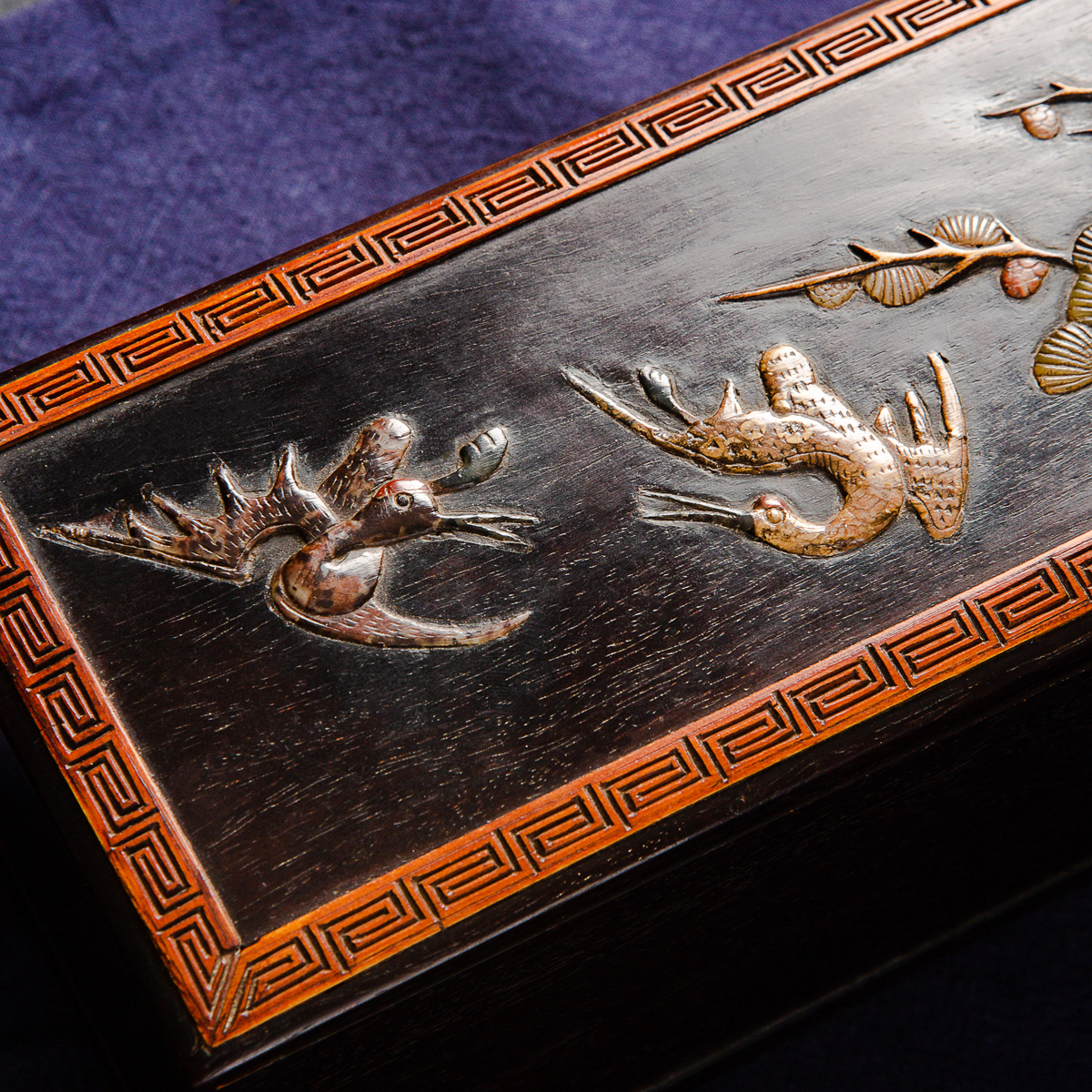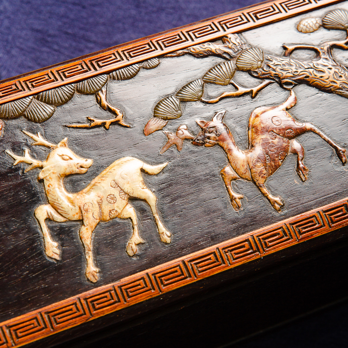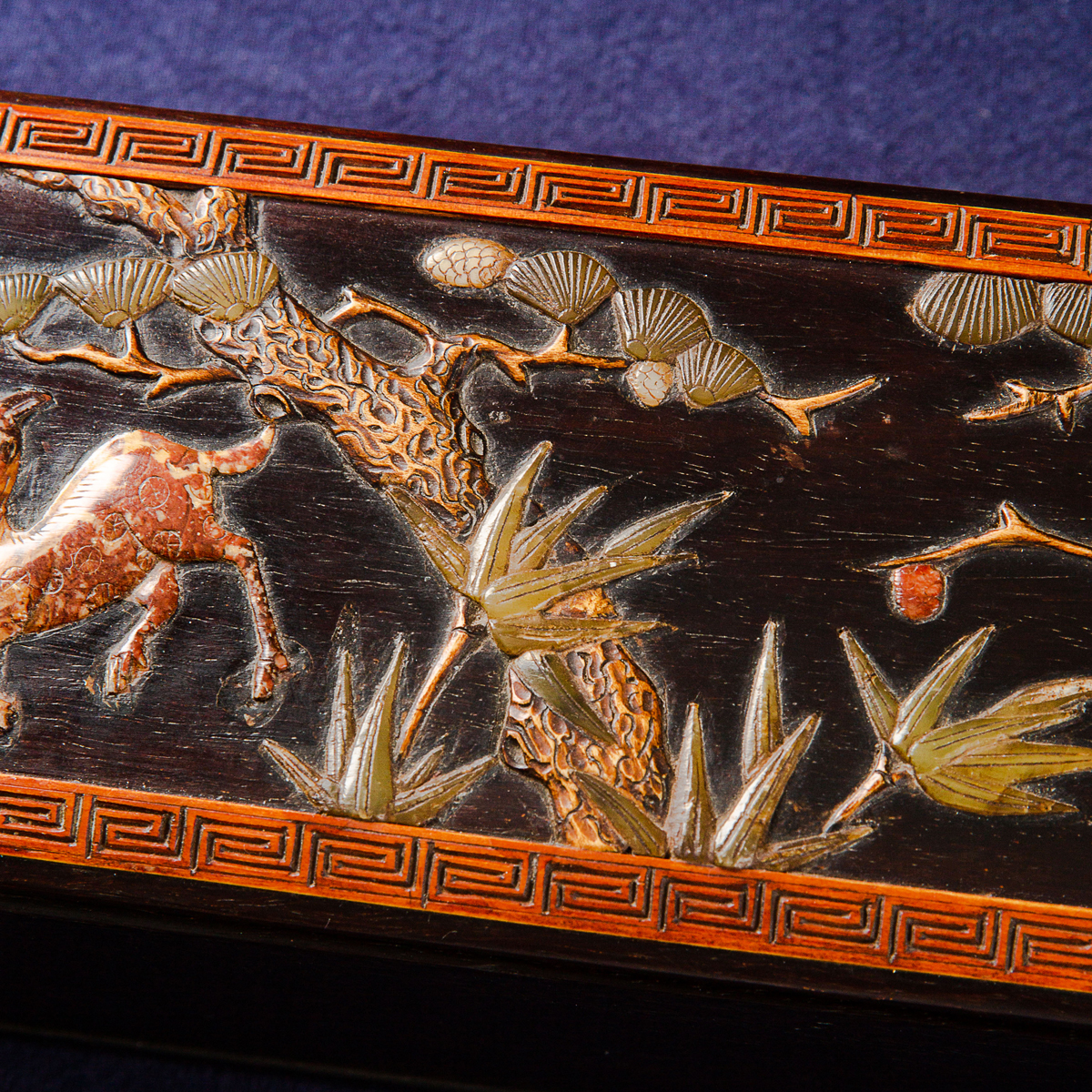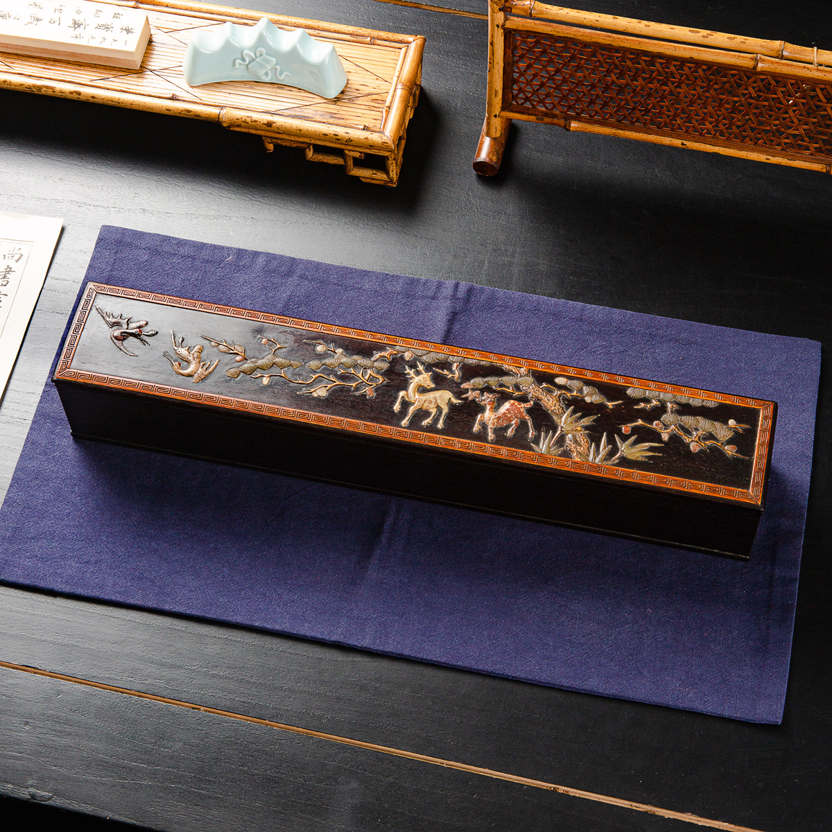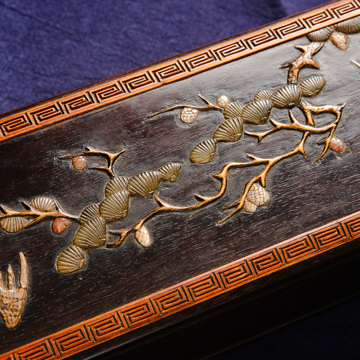 清代宫廷紫檀木百宝嵌画盒,紫檀木高贵典雅,百宝嵌工艺精美绝伦,以传统图案“鹤鹿同春”为主题,画面祥和,寓意吉祥美好,十分珍稀。