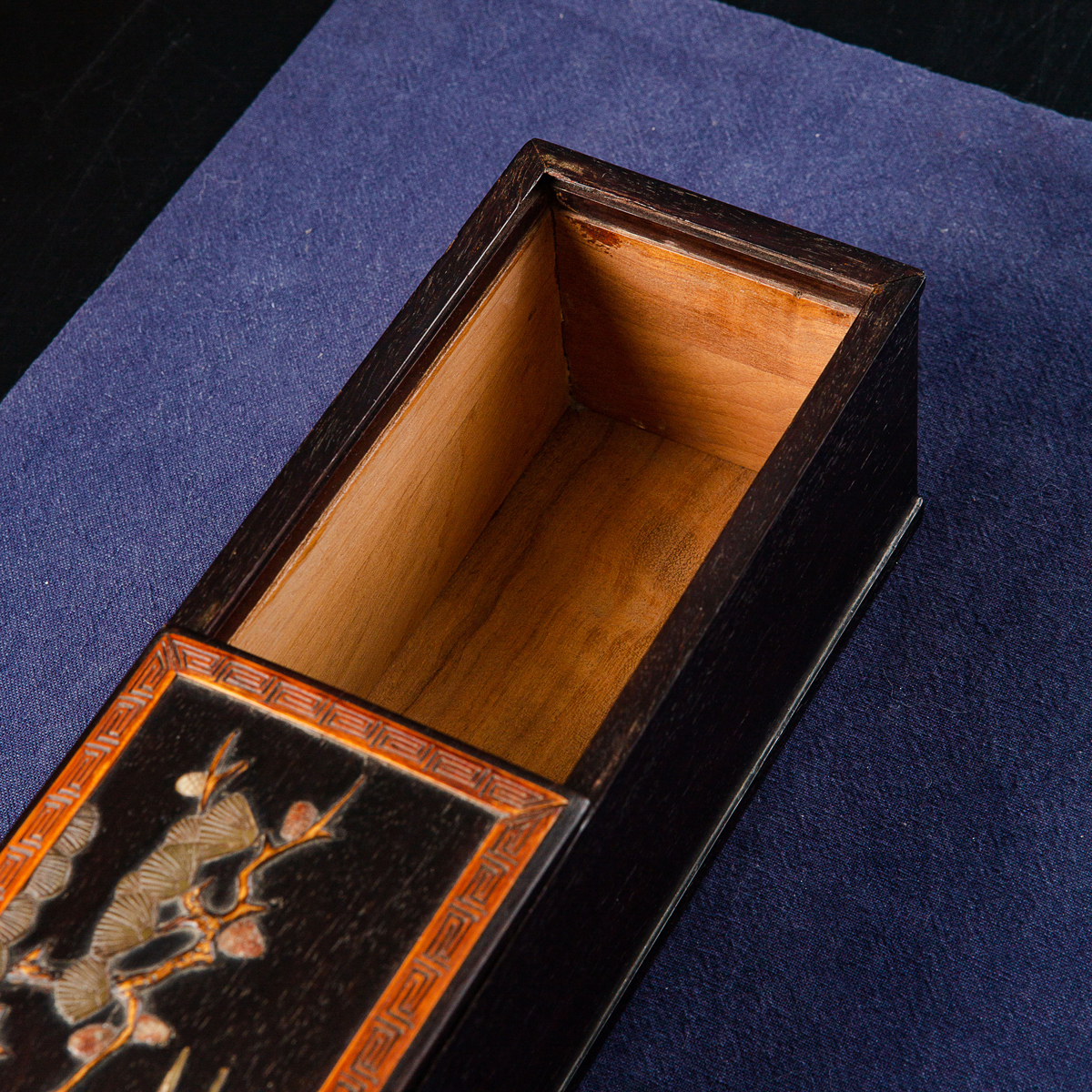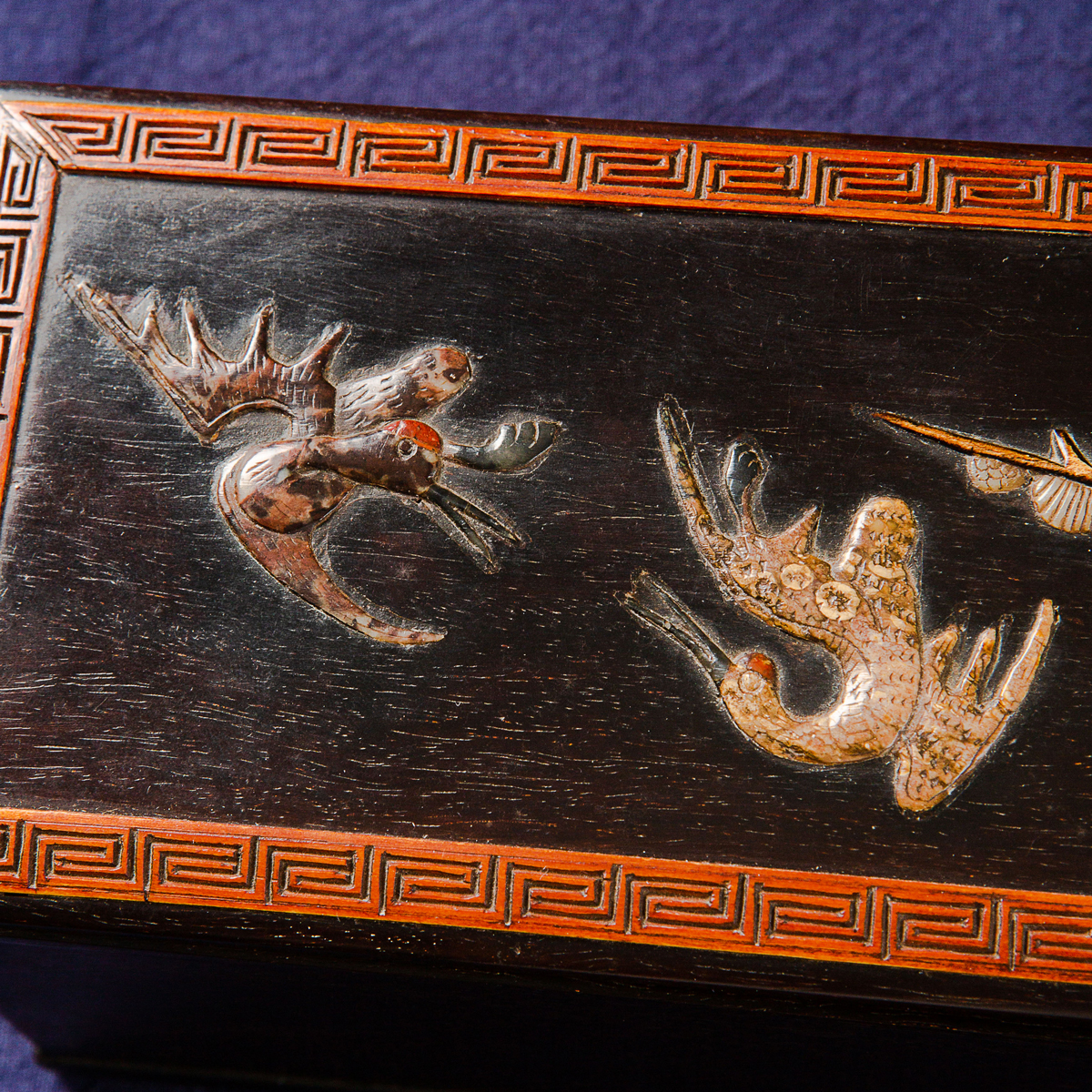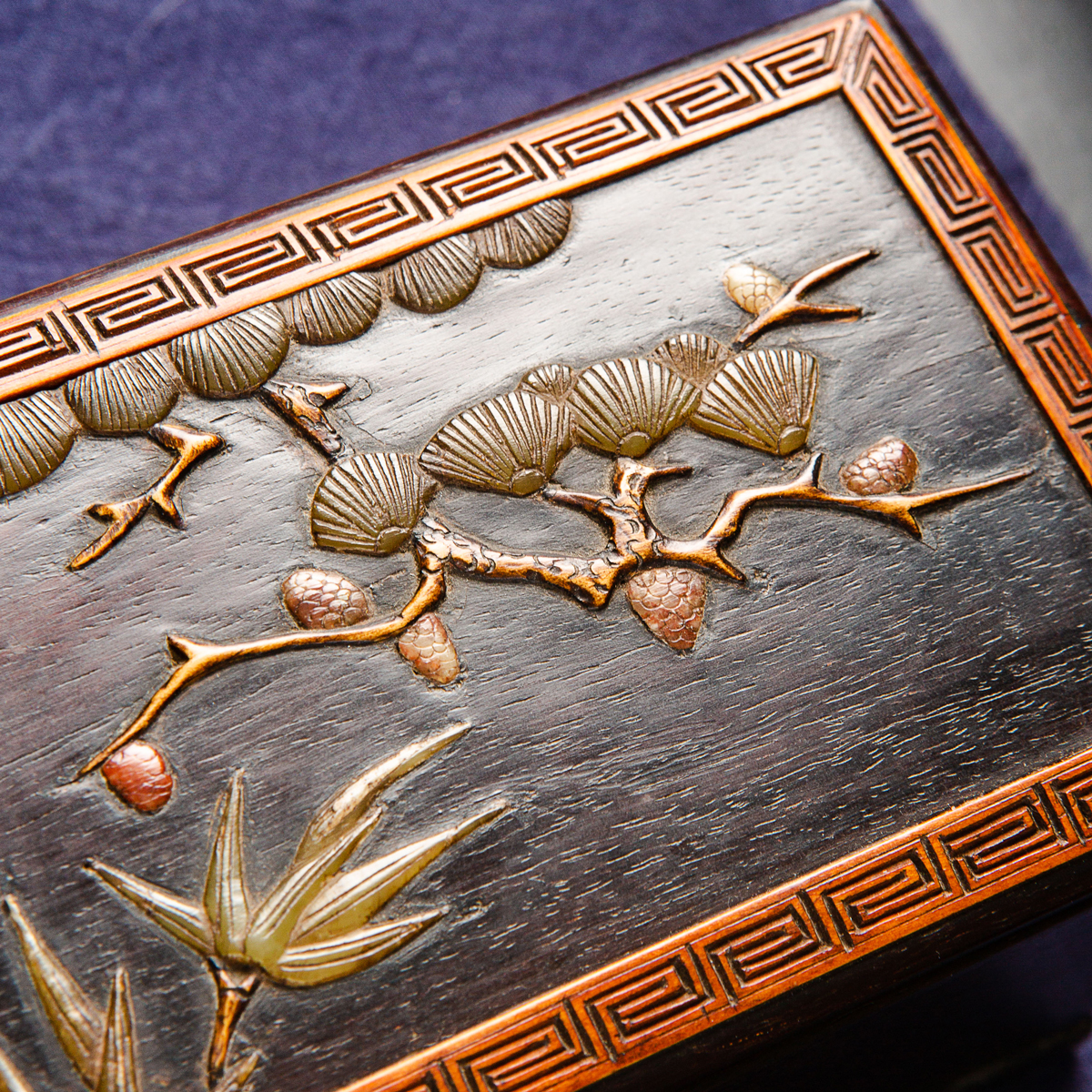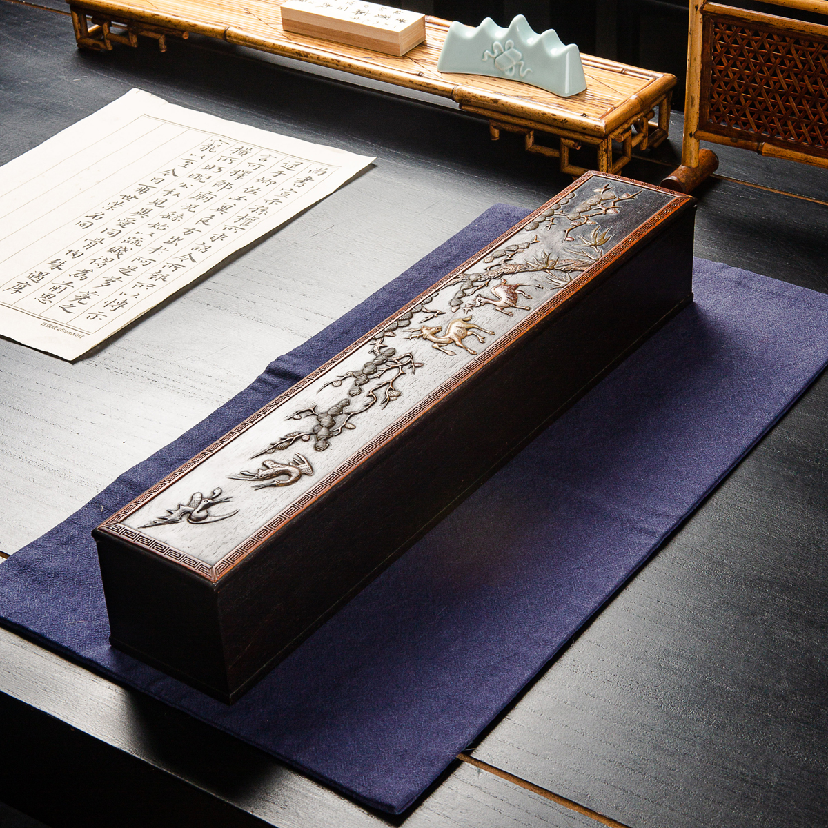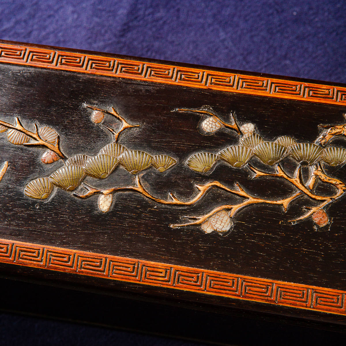 清代宫廷紫檀木百宝嵌画盒,紫檀木高贵典雅,百宝嵌工艺精美绝伦,以传统图案“鹤鹿同春”为主题,画面祥和,寓意吉祥美好,十分珍稀。