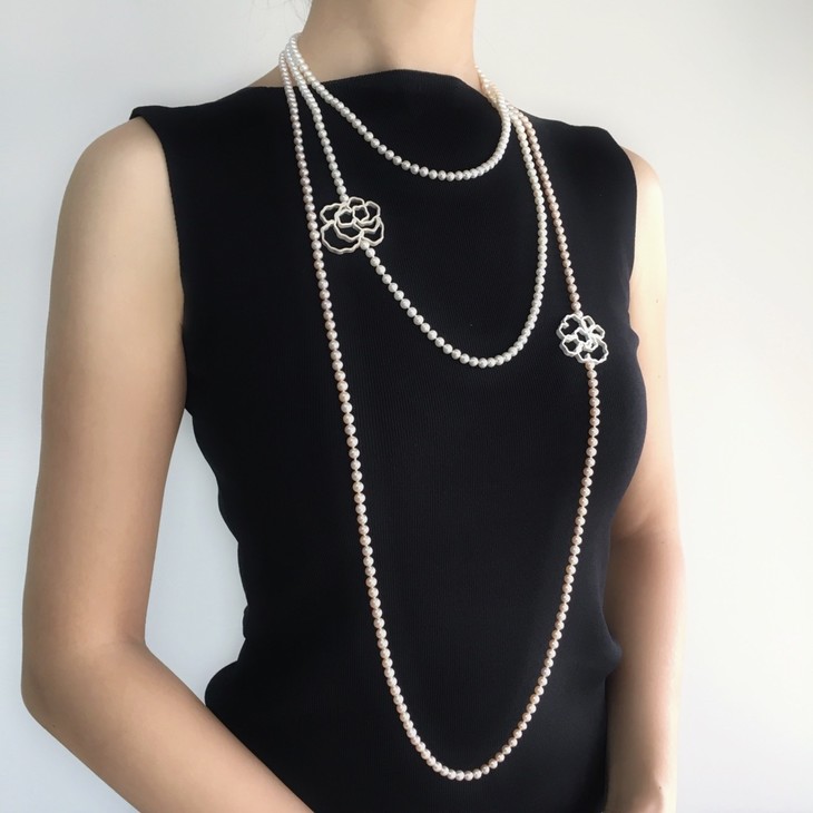 市面上的珍珠项链以短款为主,这是由于原材料的品控和项链造型都加大了长款珍珠项链的设计难度。一时短款珍珠项链易寻,好的长款却十分难得。然而长款珍珠项链的自然垂坠感是四季皆宜的配饰,也会使佩戴者显得更高挑