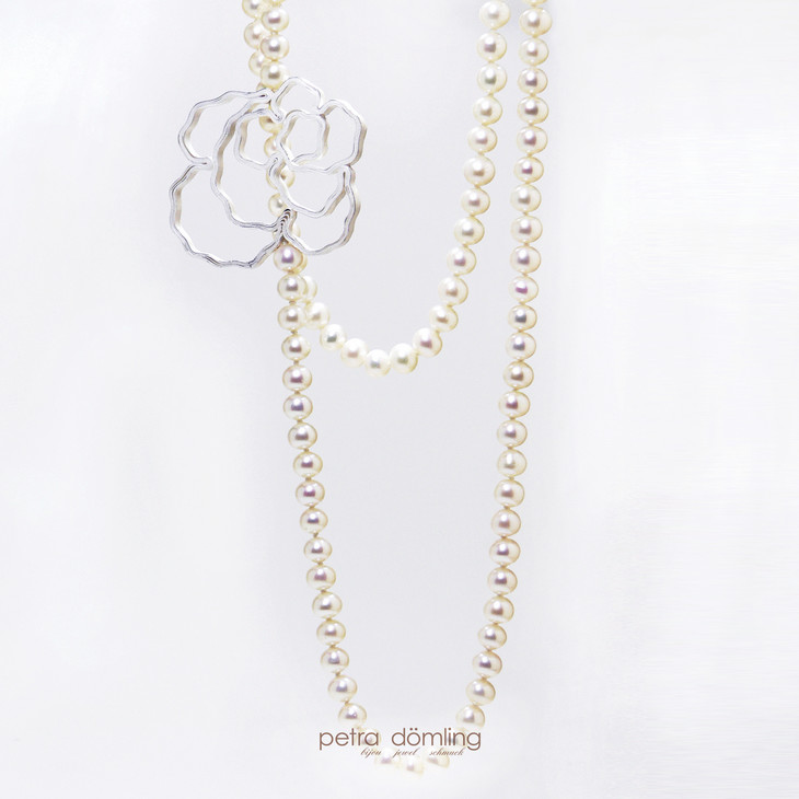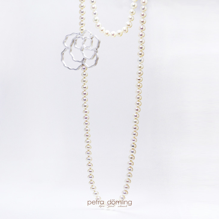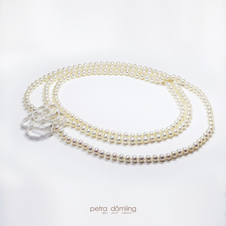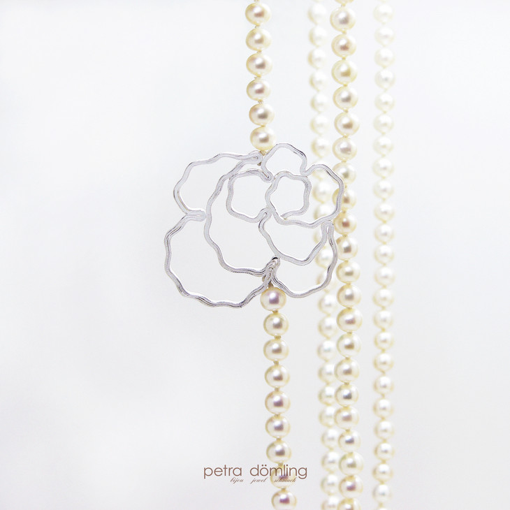 传统德国设计师的作品往往有着强烈的工业化风格,而Petra的首饰却非常女性化。不论从任何一个角度去看,她的作品都柔美的仿佛要滴出水来,像一首浪漫的抒情诗流淌在佩戴者的身上。而Petra的作品中最为人称道的就是经典款玫瑰珍珠长链了 ,珍珠形状大小各不相同。
