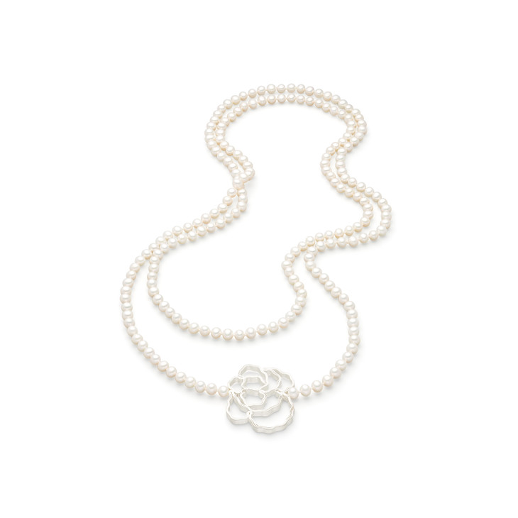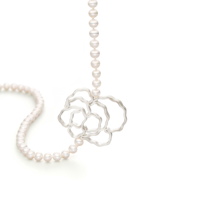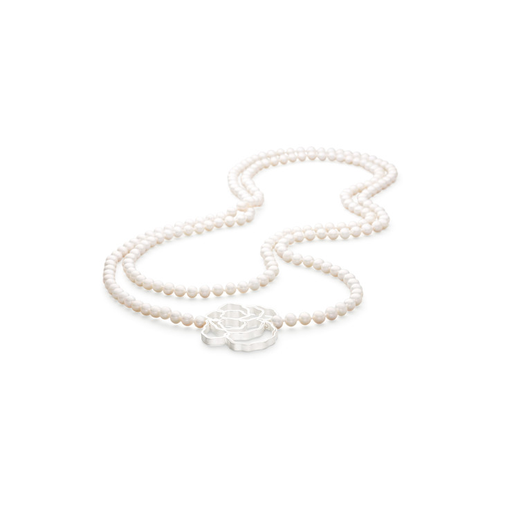 天然淡水珍珠长链再配上白玫瑰,象征着纯洁、浪漫与优雅。金属的光泽与珍珠自然的光晕叠加在一起,将产生奇妙的化学反应。为了制作出这一款可穿搭性极强的项链,Petra一头扎在她的工作室内,夜以继日的寻找最佳突破口
