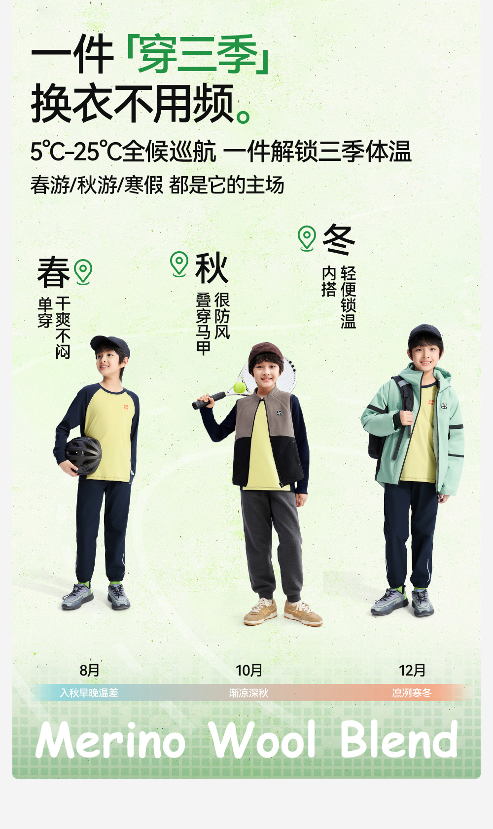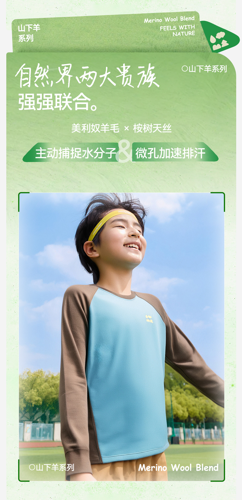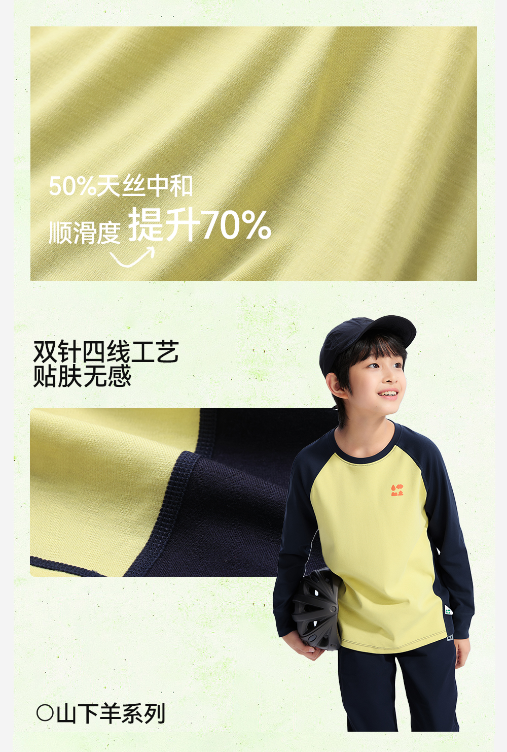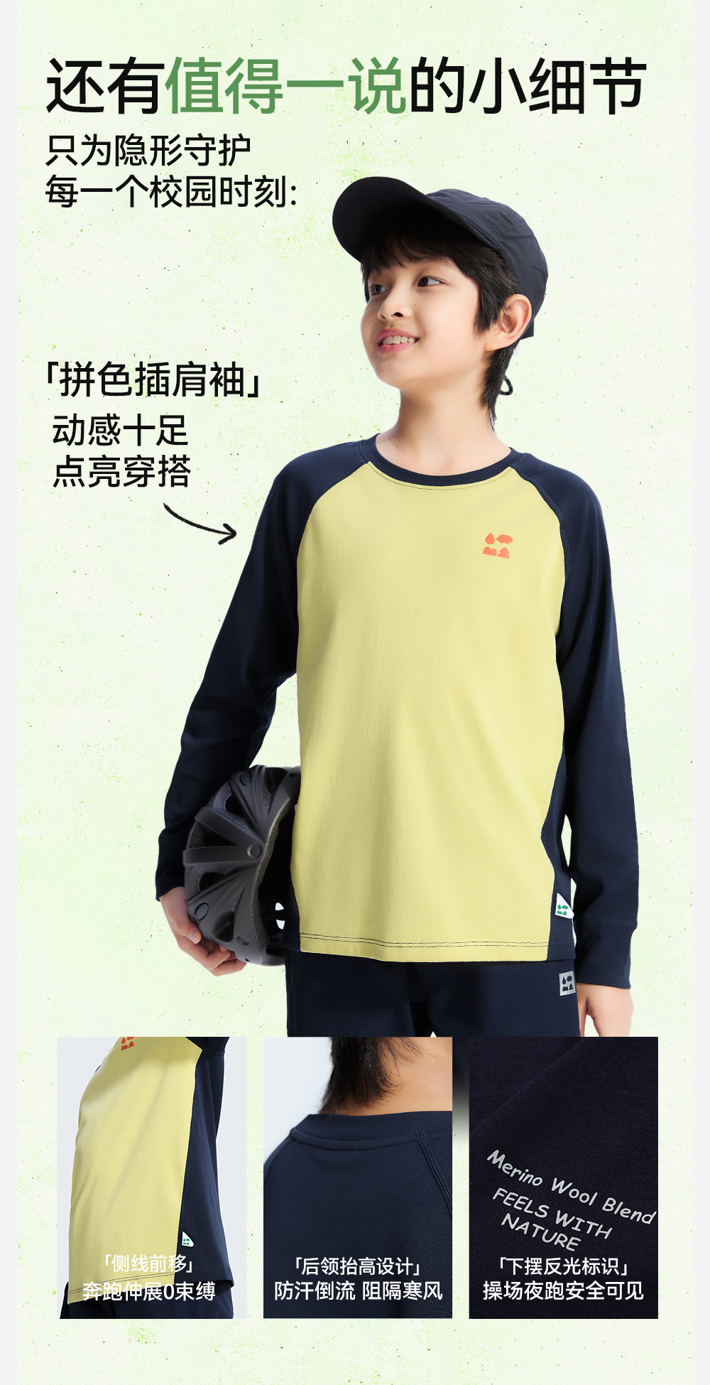 【天丝羊毛插肩T恤】森林棠25秋新款 儿童运动排汗拼色保暖打底上衣60253182