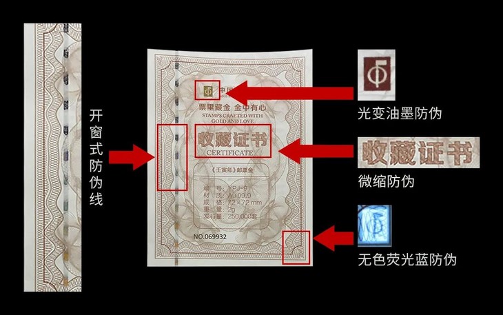 收藏证书上使用了开窗式安全线防伪、光变油墨防伪、微缩防伪、无色荧光蓝防伪技术,和人民币防伪同根同源!