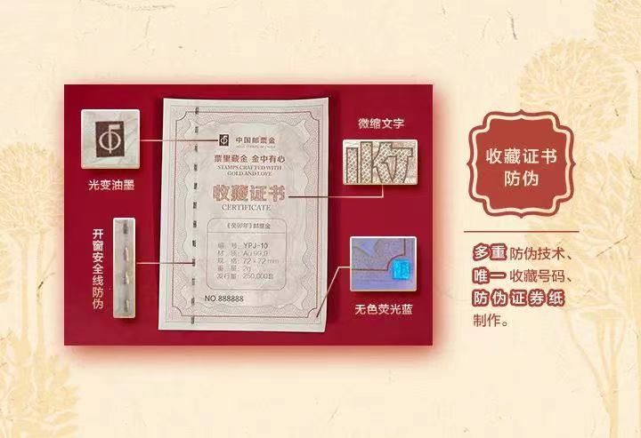 邮票金背面利用特殊工艺将贵金属与防伪特种纸结合,带有荧光防伪,具有独特的防伪功能和收藏价值。