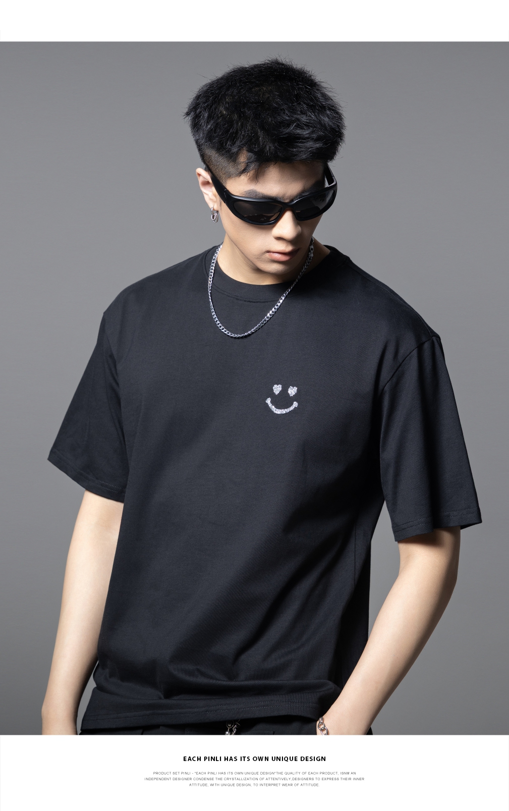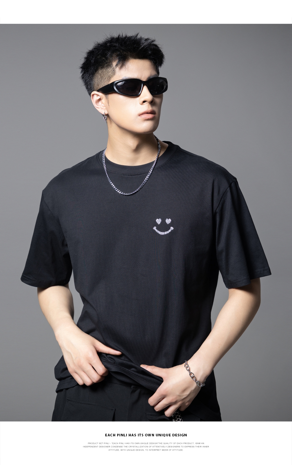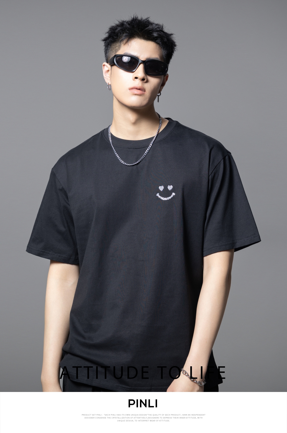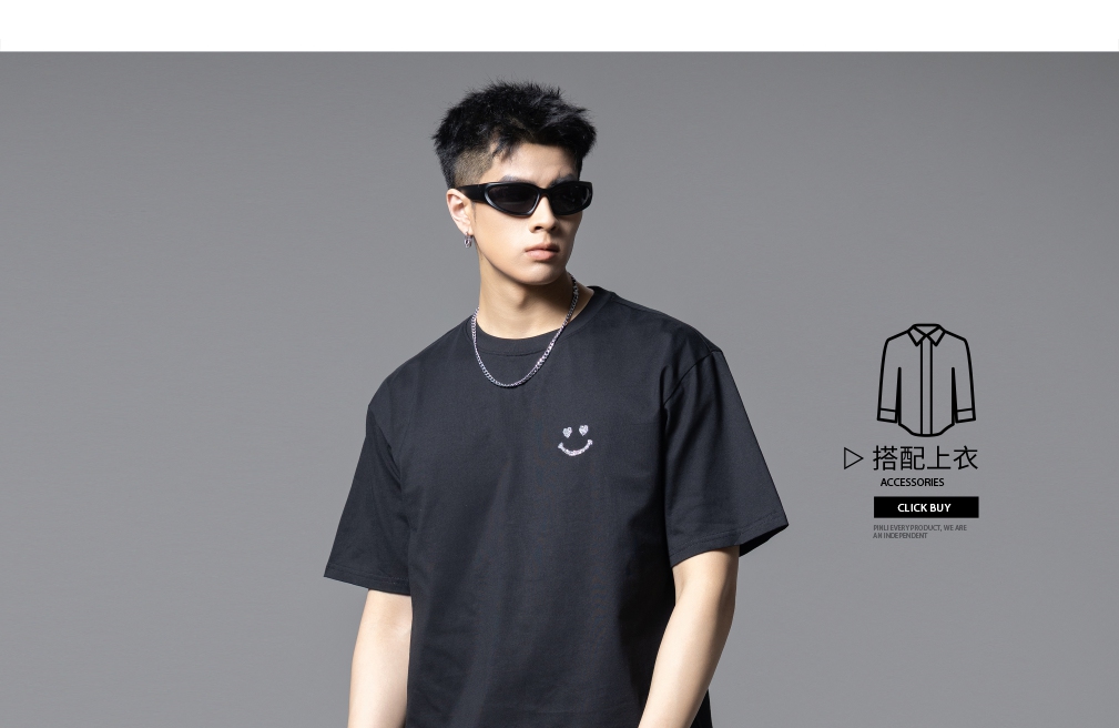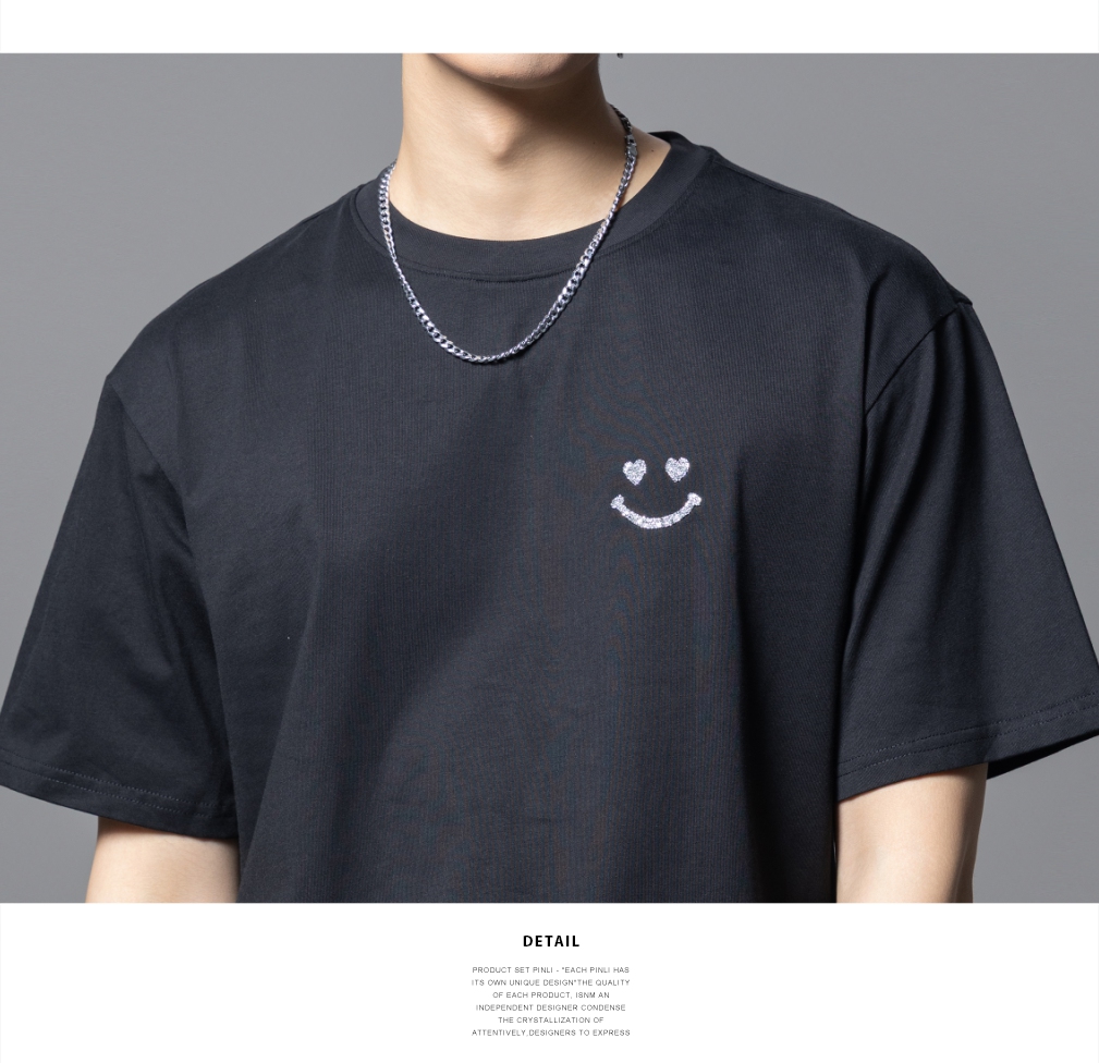 PINLI品立2025夏季新款男士笑脸烫钻圆领短袖T恤上衣BG252111056