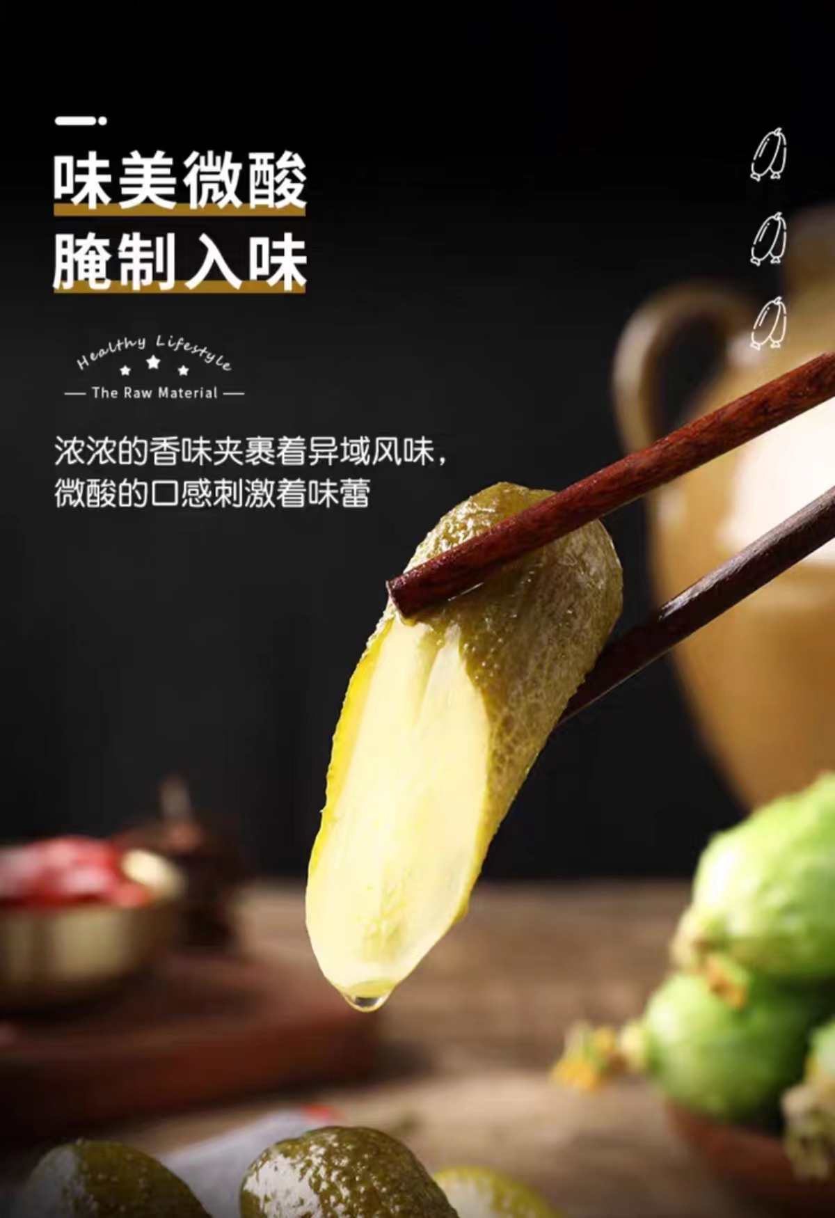 2、甄选小巧玲珑的乳黄瓜,精心挑选新鲜整根青瓜,及时封缸腌制,从源头锁住新鲜,入口更脆爽