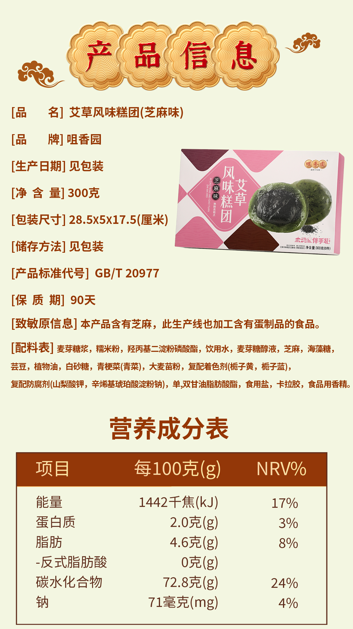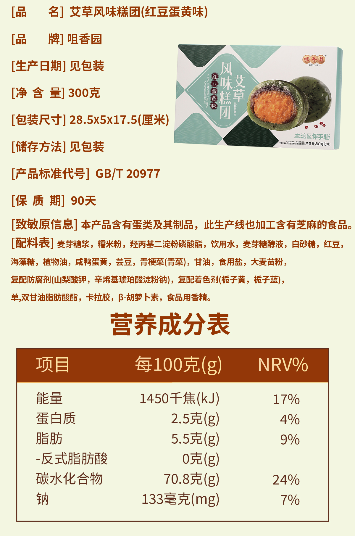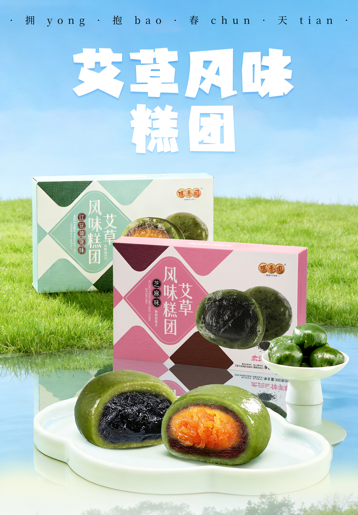 咀香园艾草青团300g 小吃网红零食芝麻味/红豆蛋黄味糕点糯米糍团
